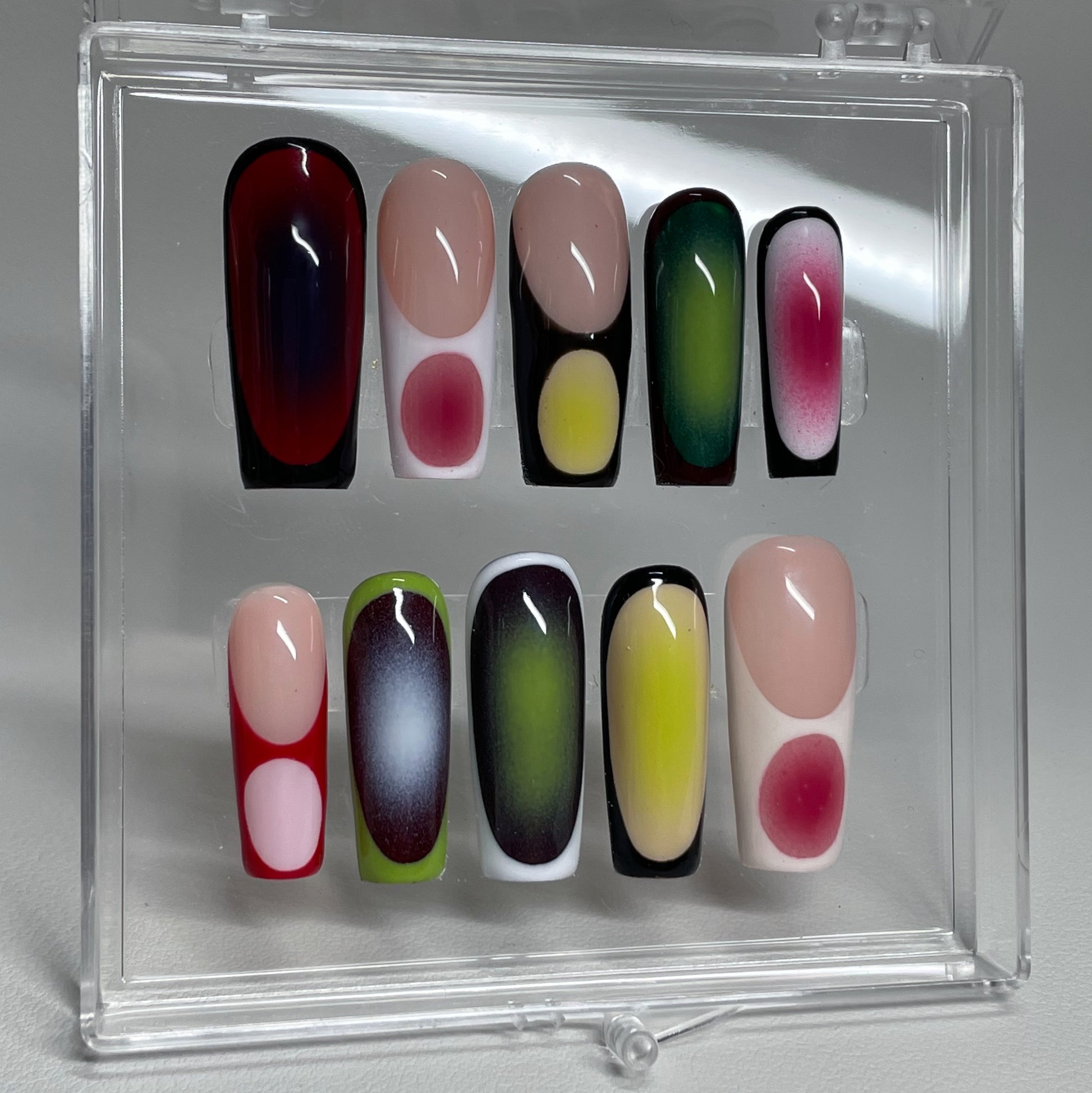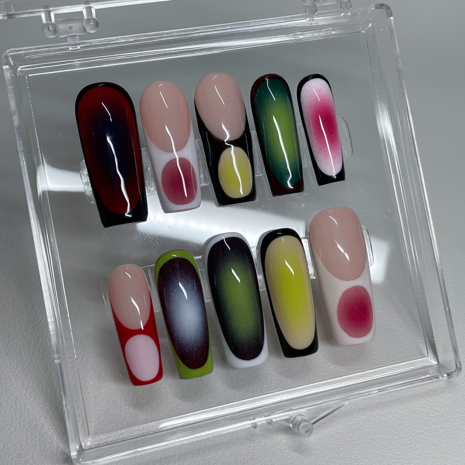 Your pressie set comes with 10 reusable press on nails as pictured, instructions on how to apply and remove your pressies, and an application kit containing everything you need for a seamless application!