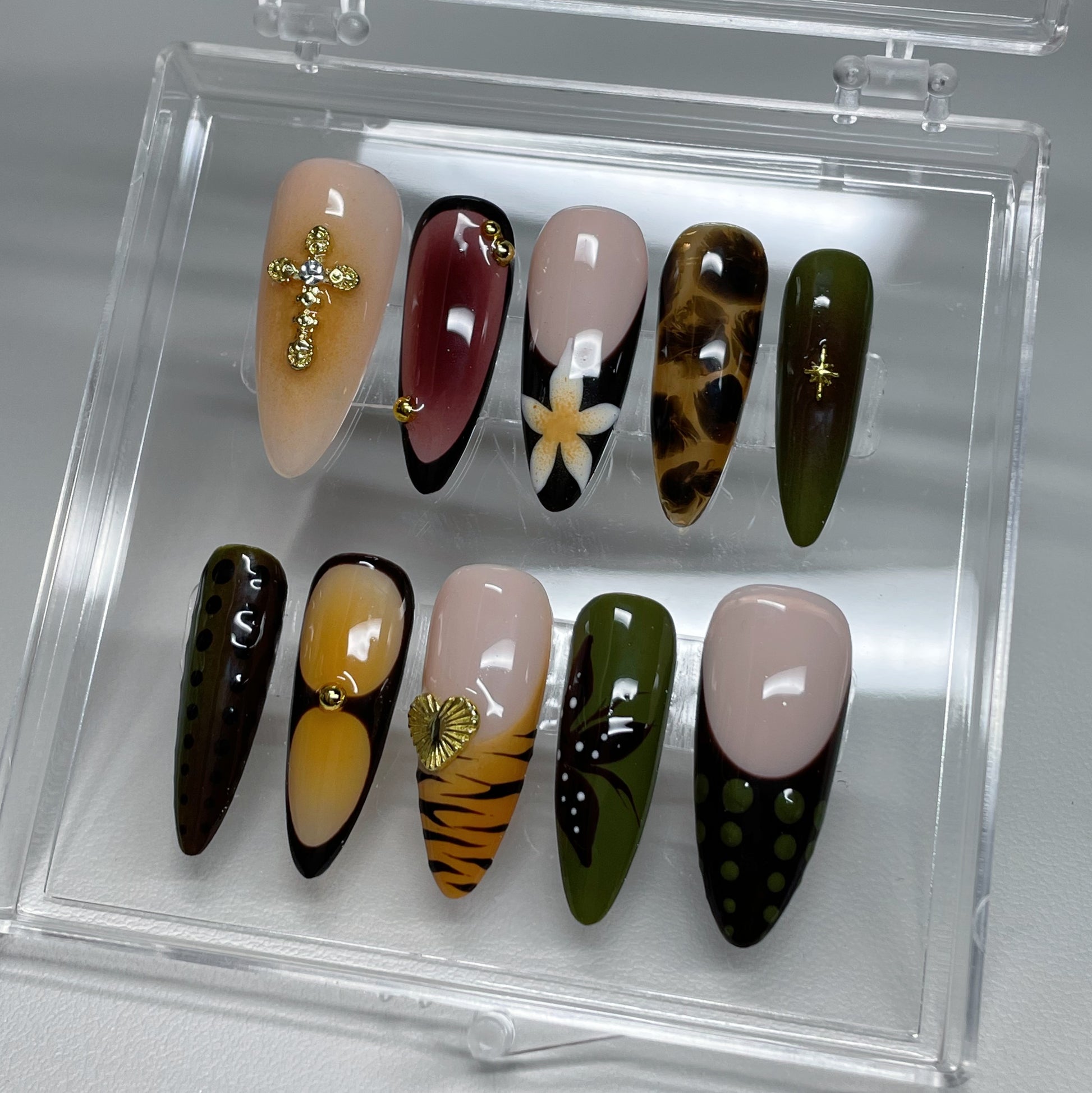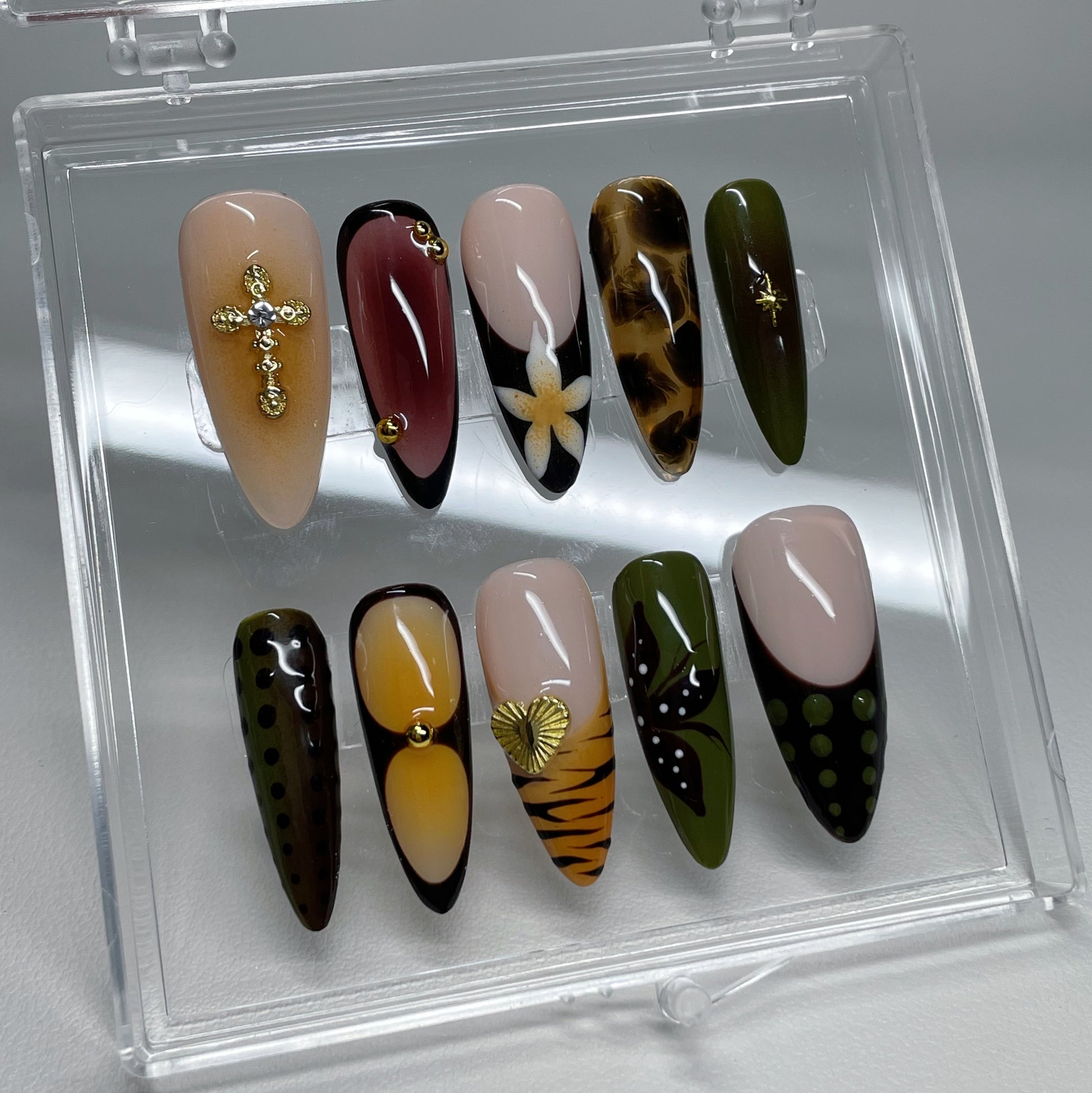 Your pressie set comes with 10 reusable press on nails as pictured, instructions on how to apply and remove your pressies, and an application kit containing everything you need for a seamless application!