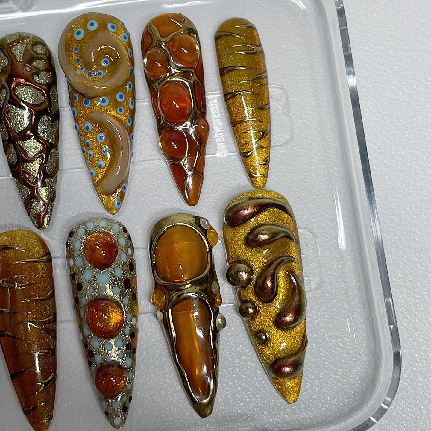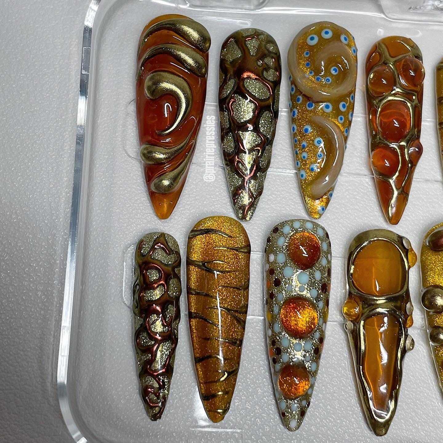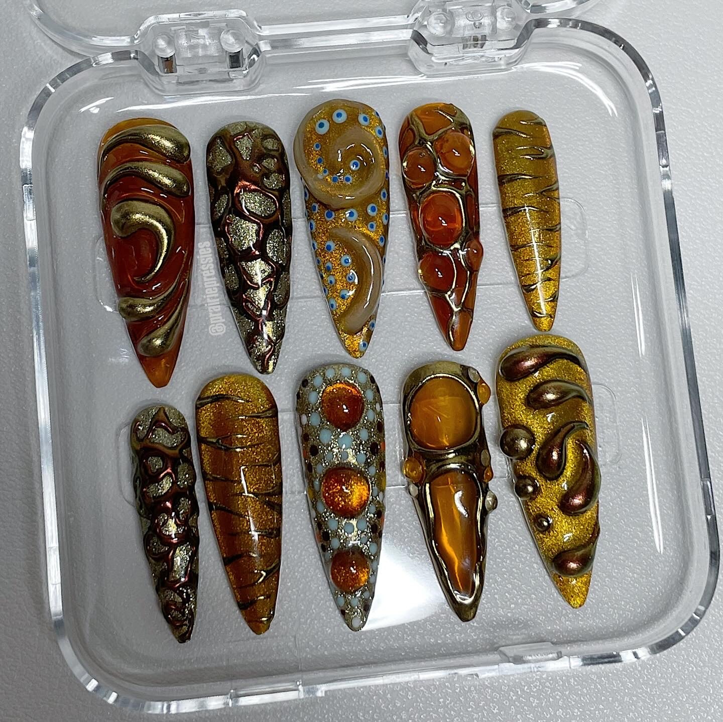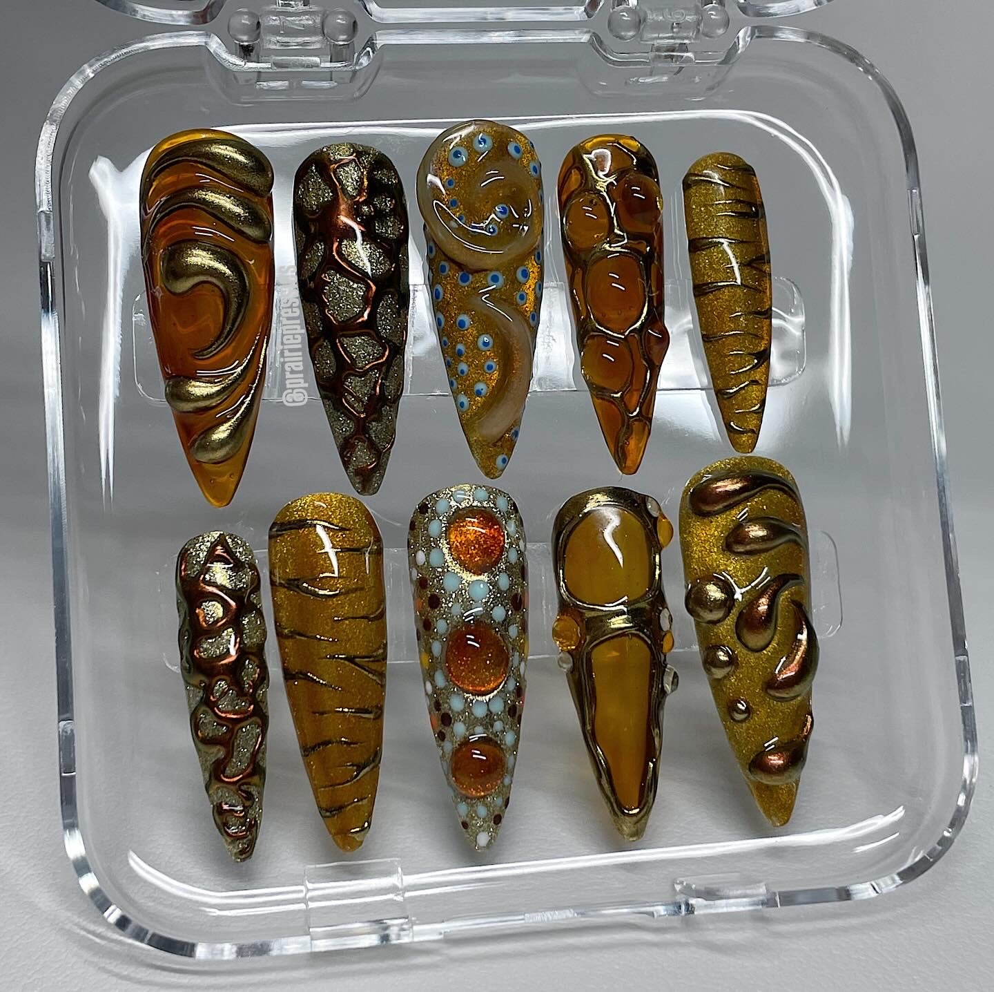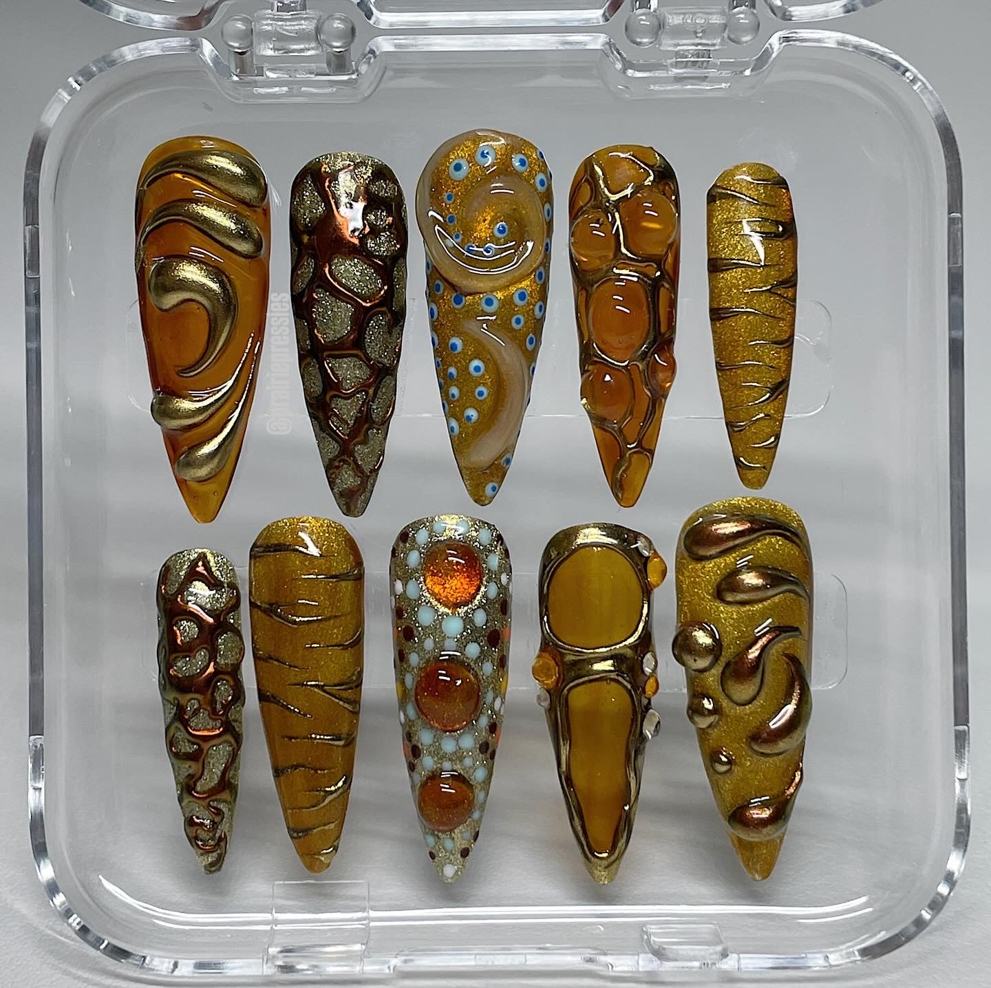 Your pressie set comes with 10 reusable press on nails as pictured, instructions on how to apply and remove your pressies, and an application kit containing everything you need for a seamless application!