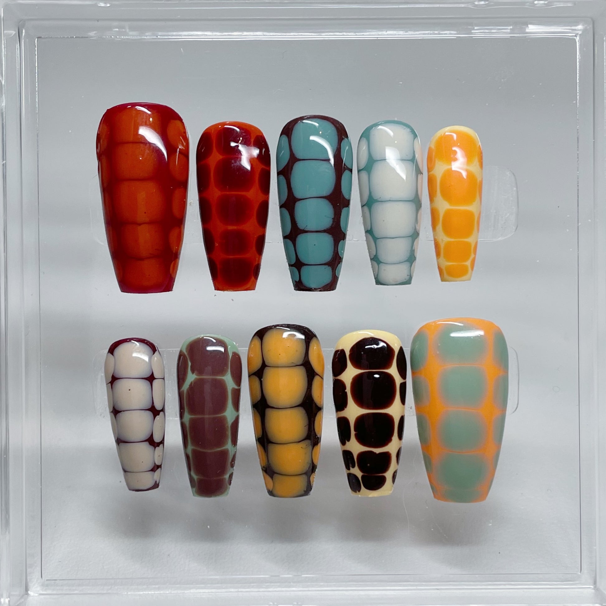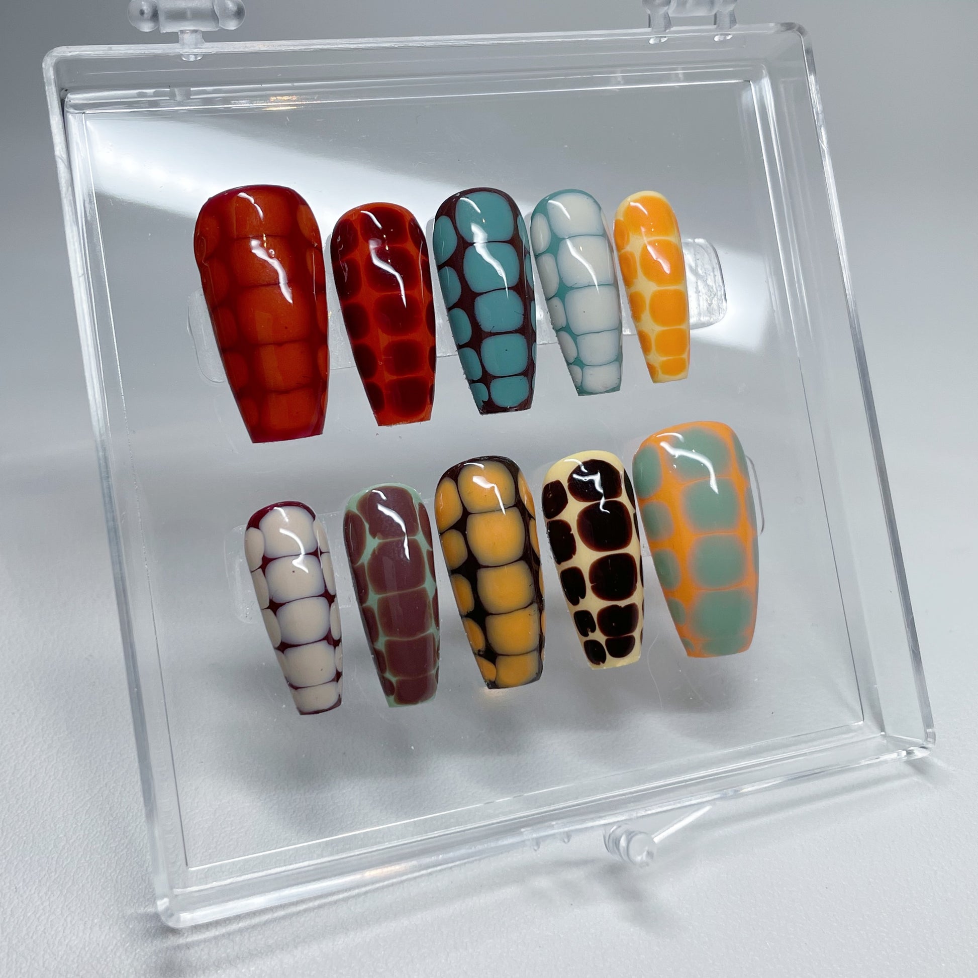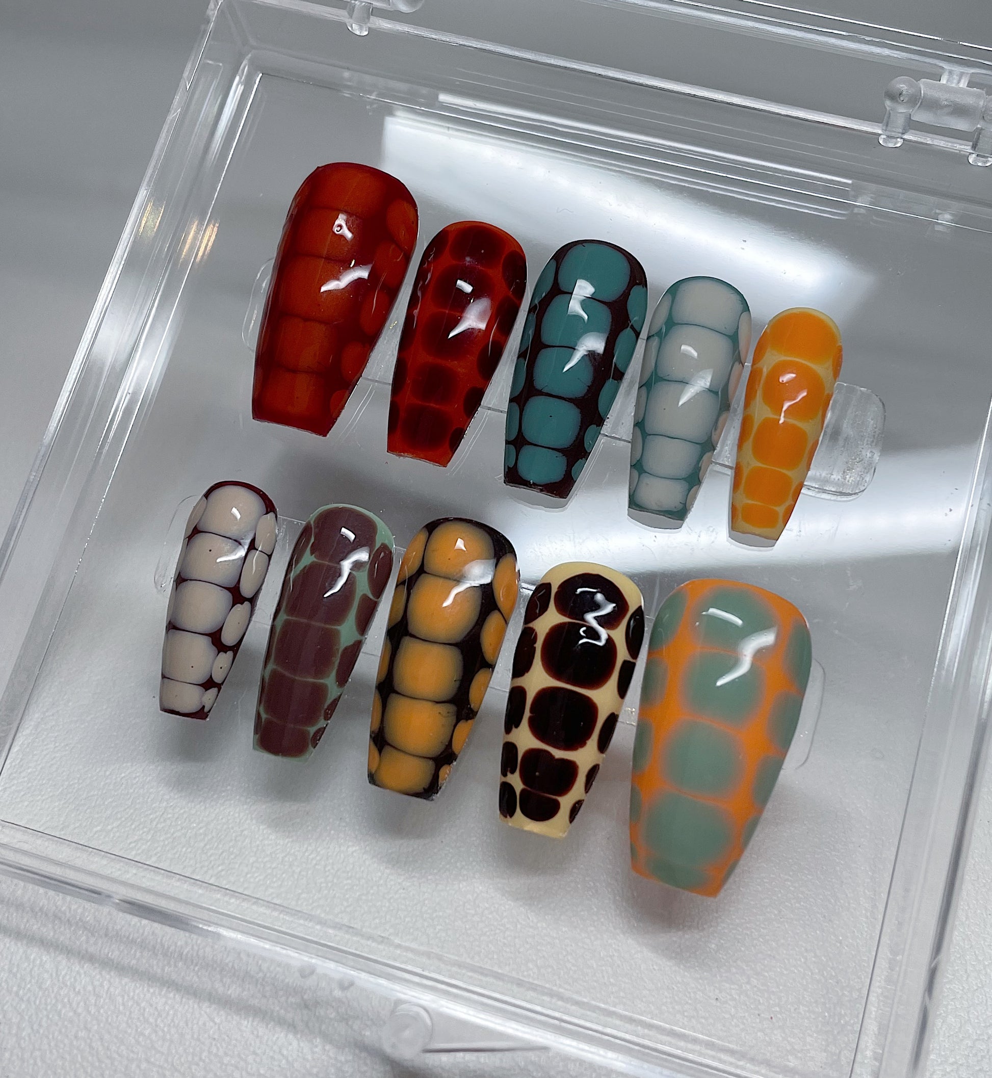 Your pressie set comes with 10 reusable press on nails as pictured, instructions on how to apply and remove your pressies, and an application kit containing everything you need for a seamless application!