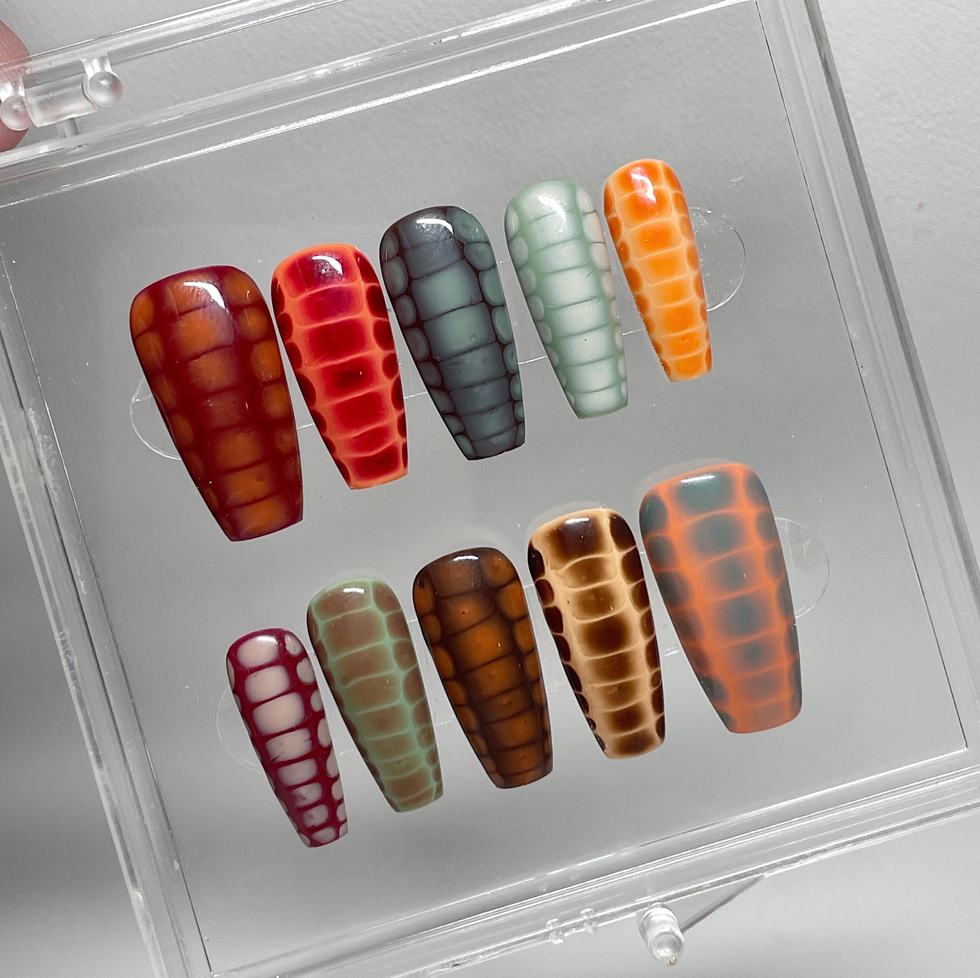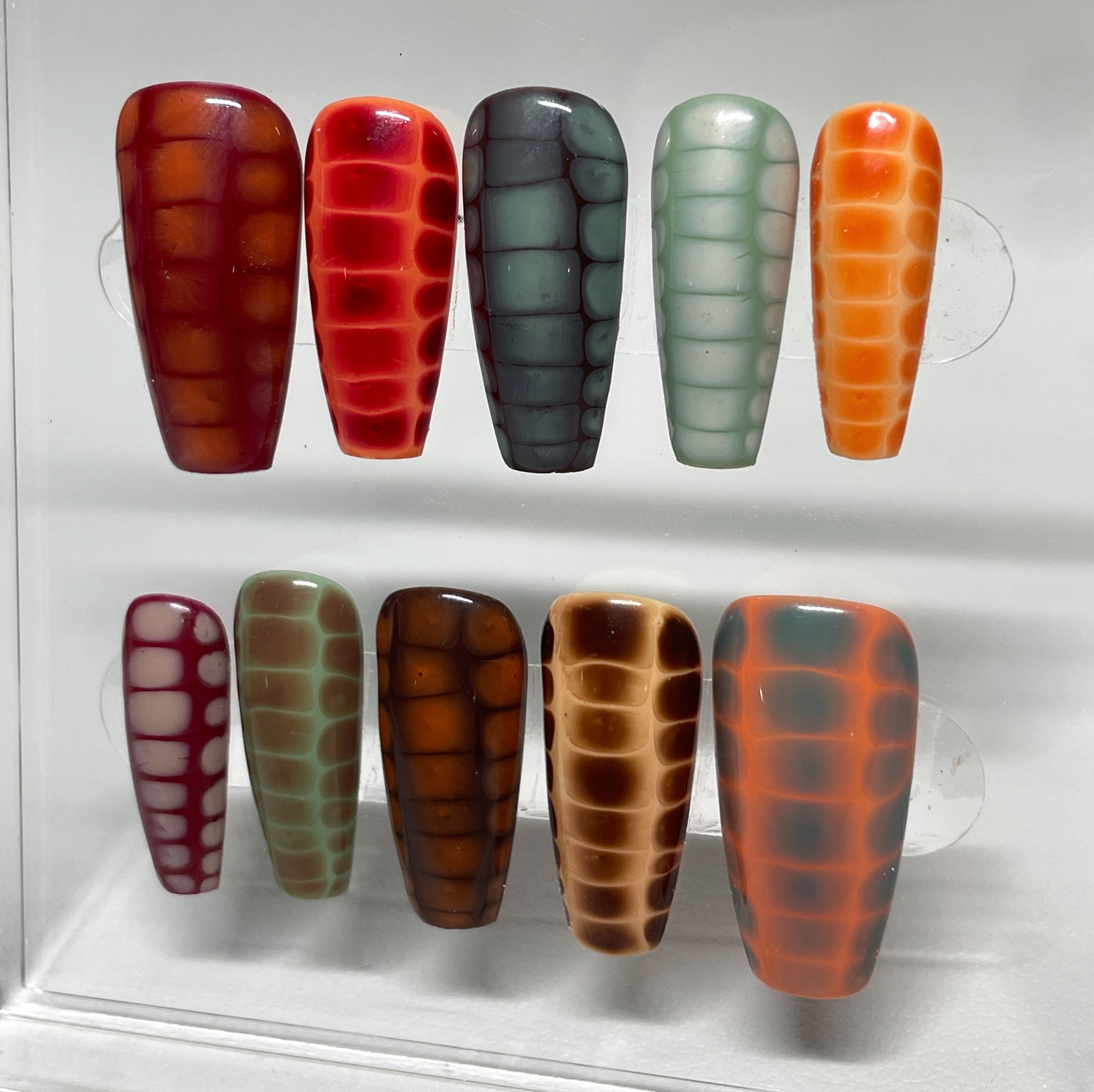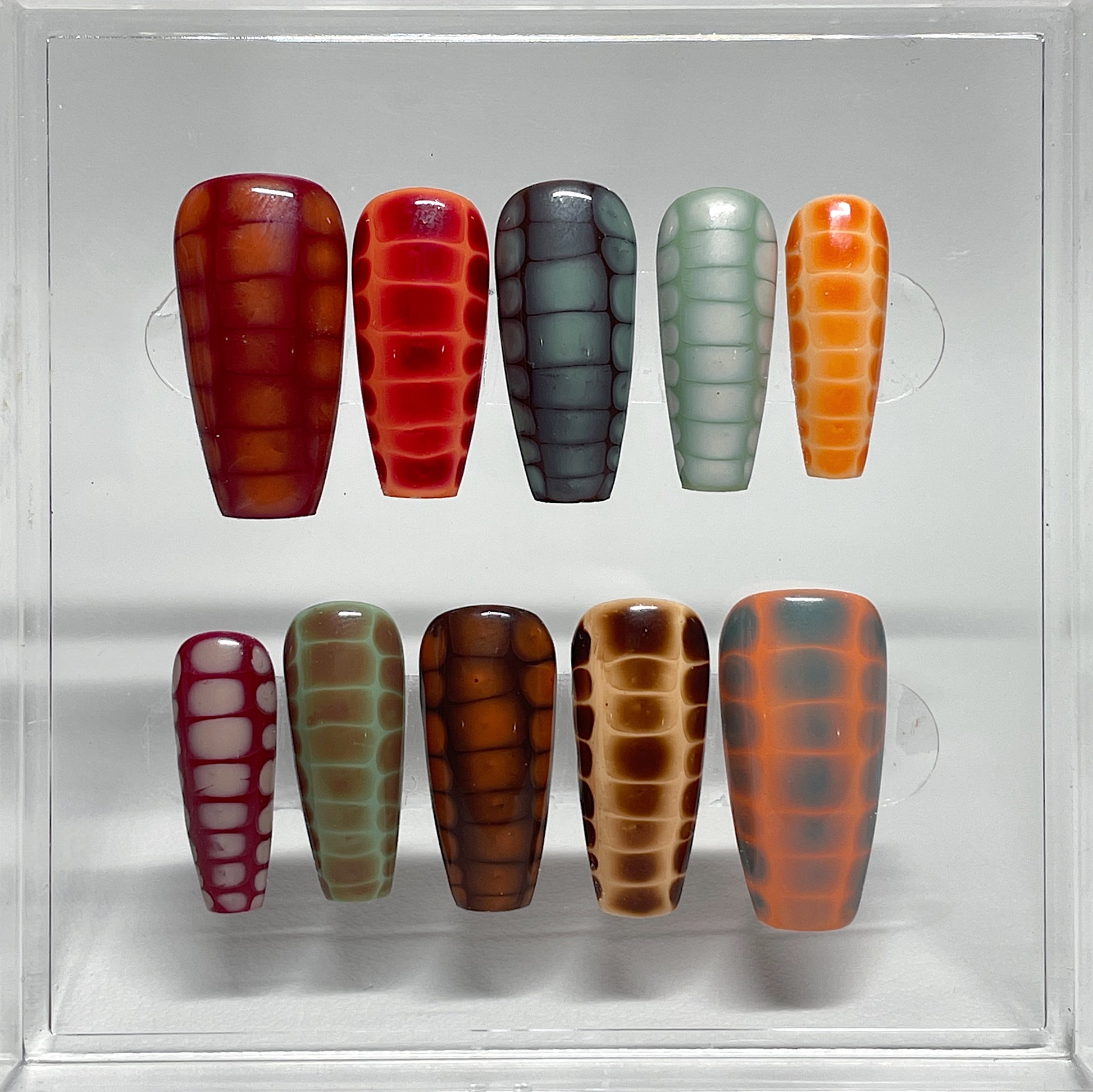 Your pressie set comes with 10 reusable press on nails as pictured, instructions on how to apply and remove your pressies, and an application kit containing everything you need for a seamless application!