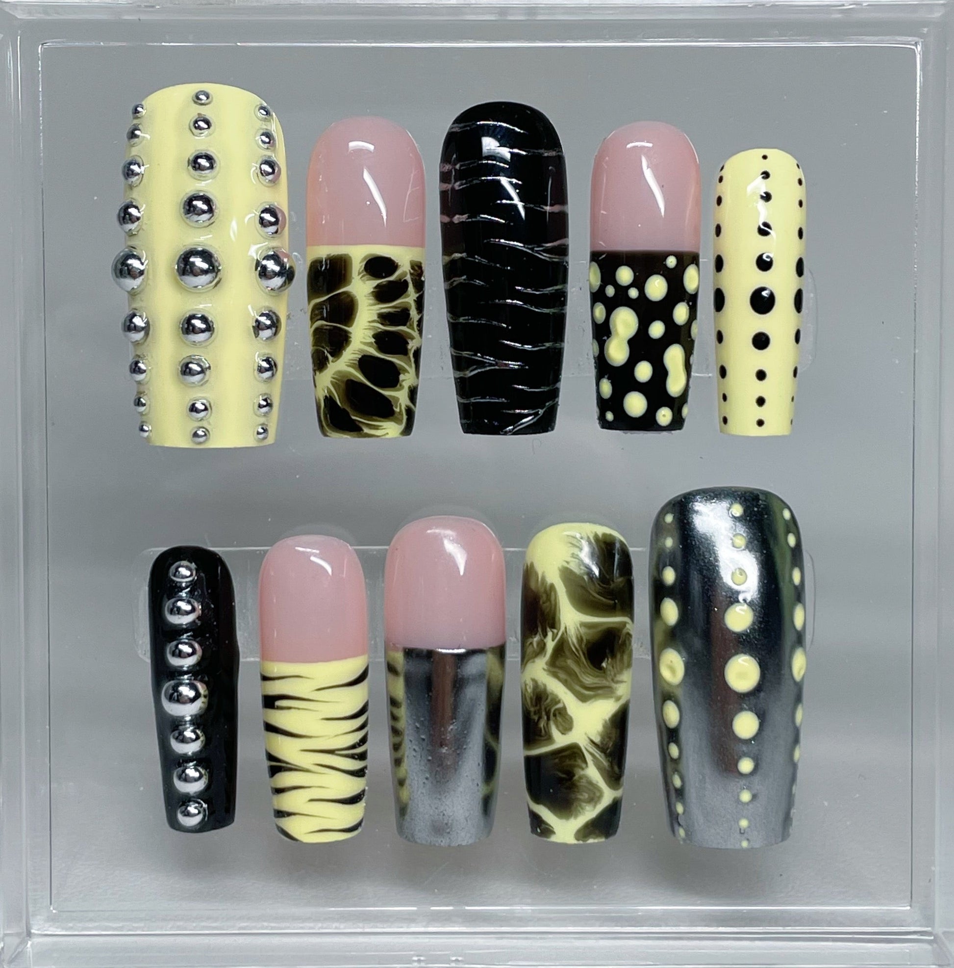Your pressie set comes with 10 reusable press on nails as pictured, instructions on how to apply and remove your pressies, and an application kit containing everything you need for a seamless application!