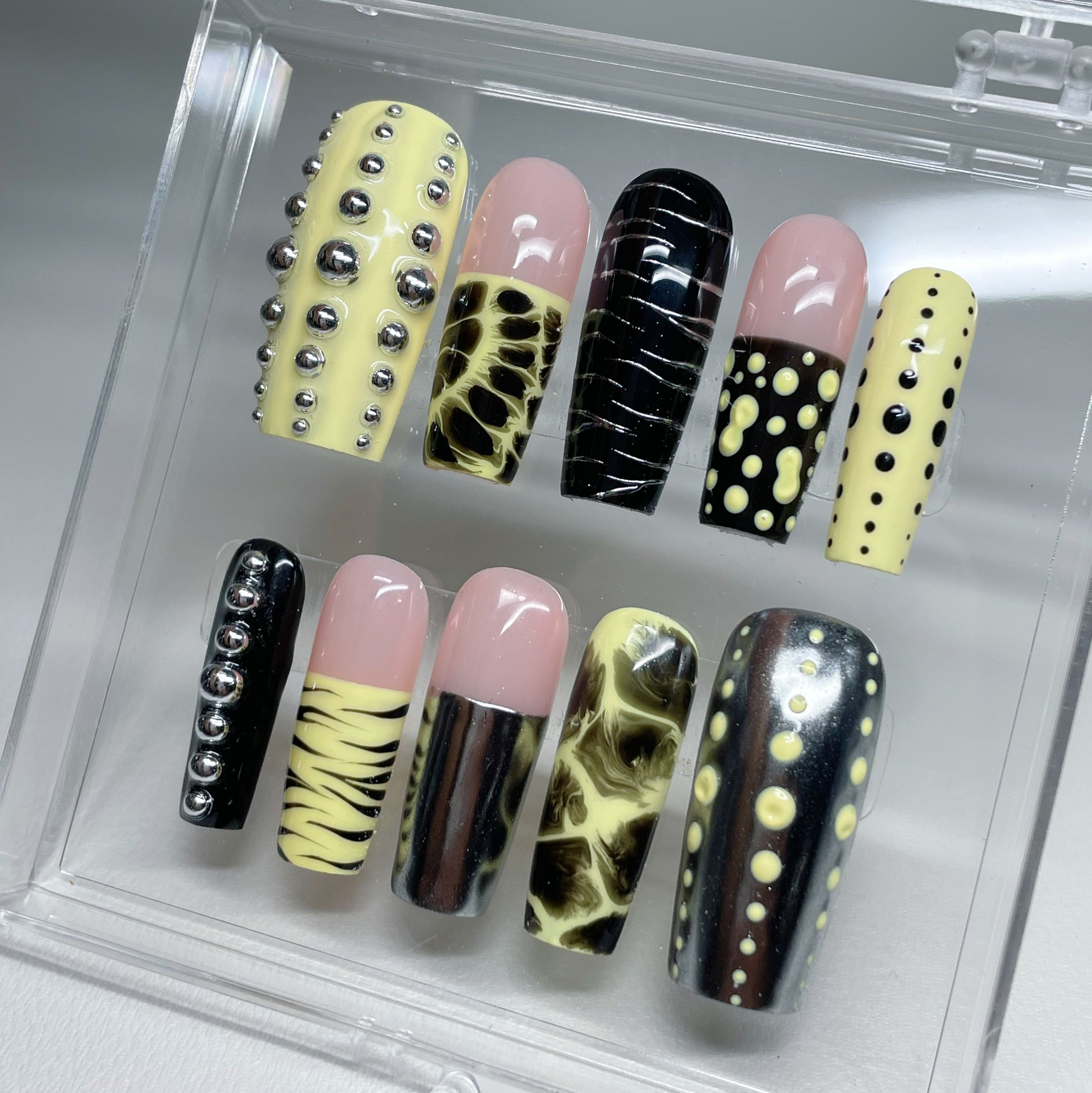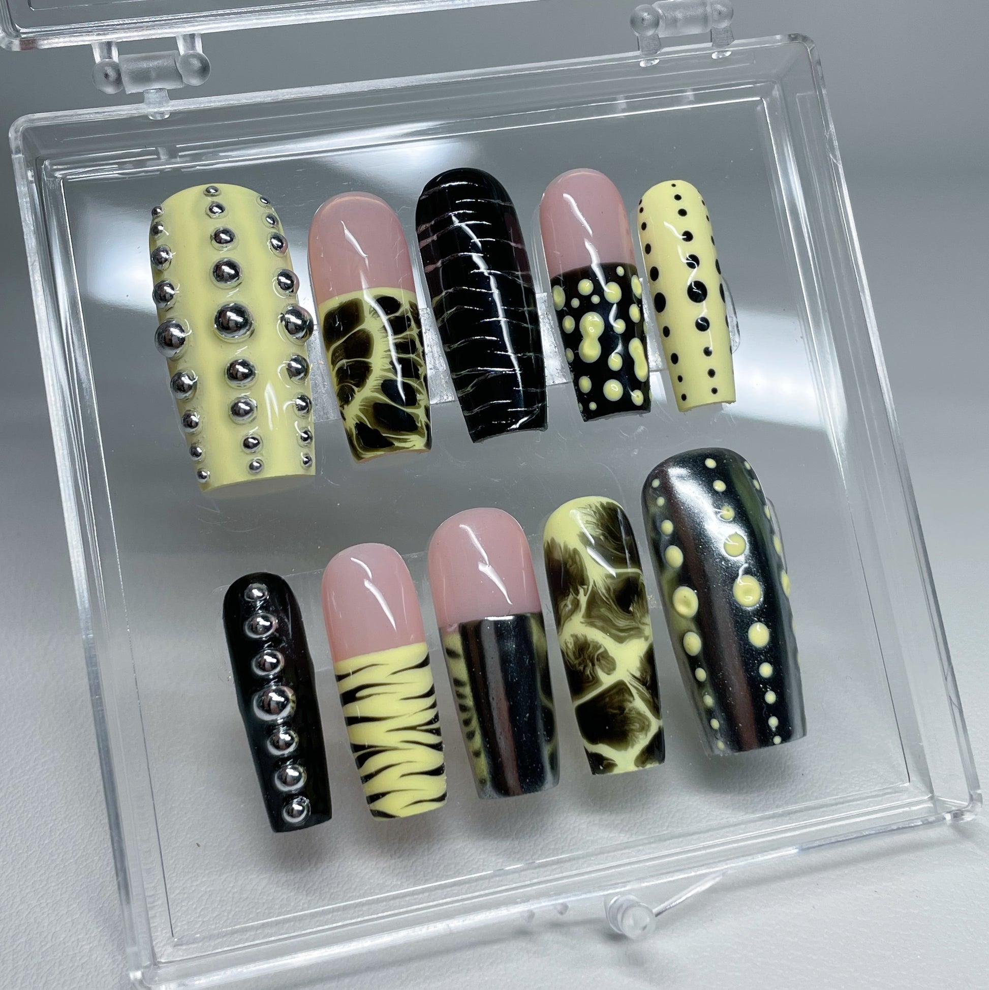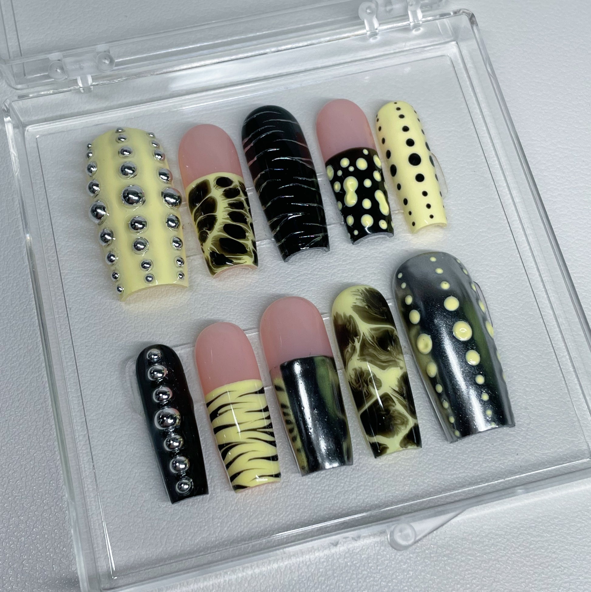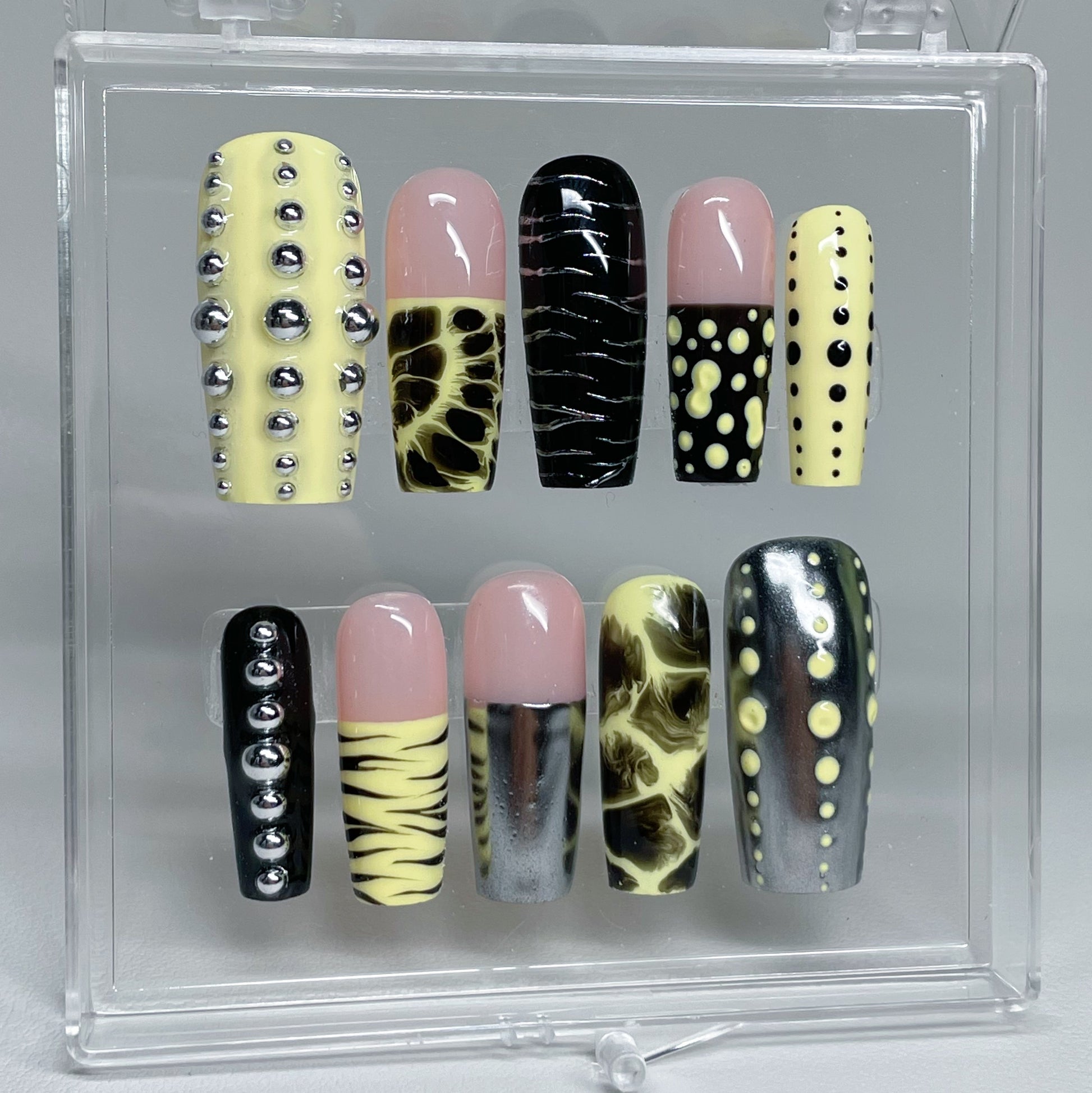 Your pressie set comes with 10 reusable press on nails as pictured, instructions on how to apply and remove your pressies, and an application kit containing everything you need for a seamless application!