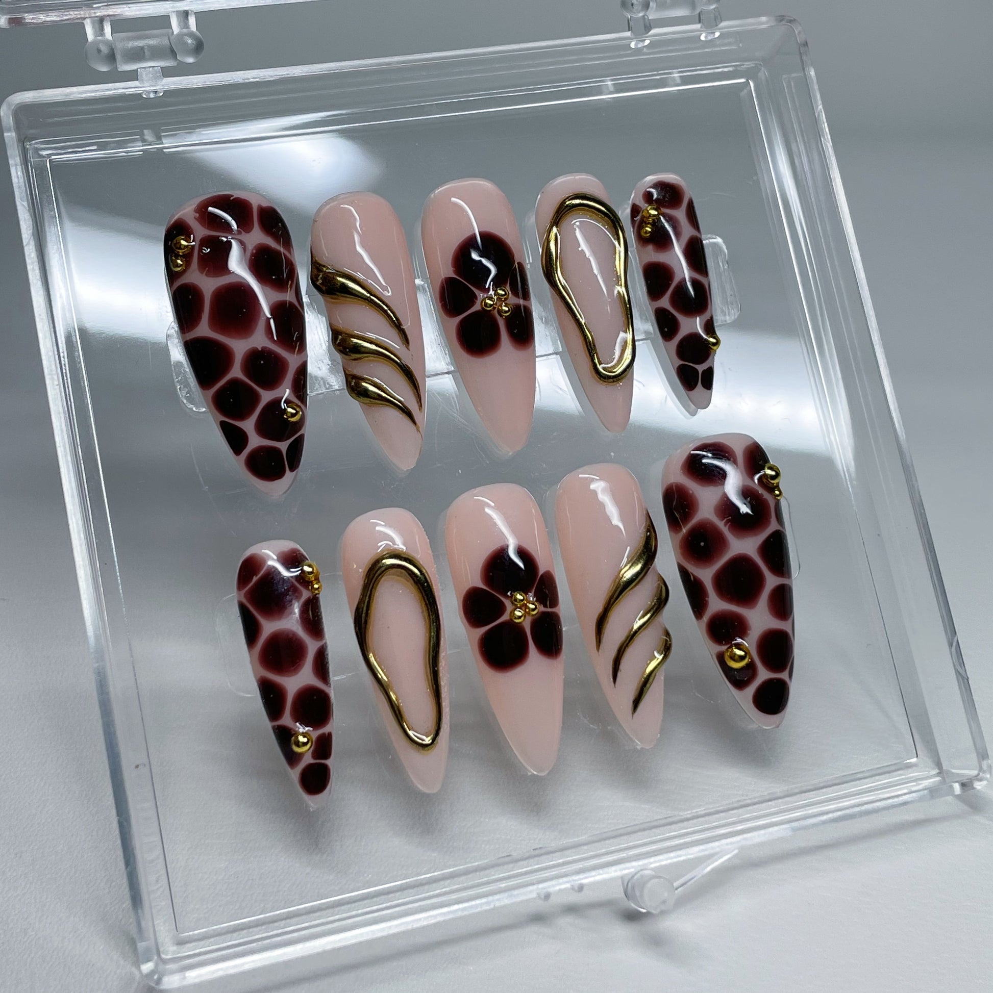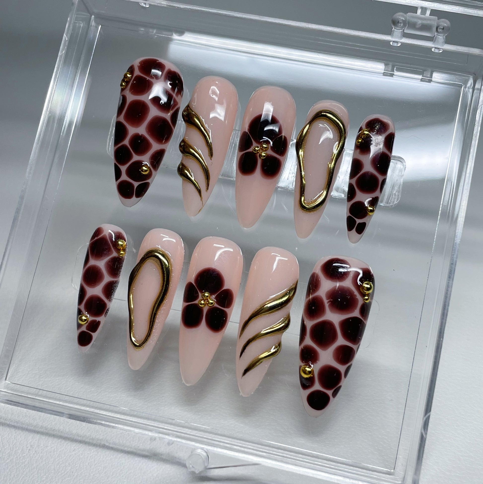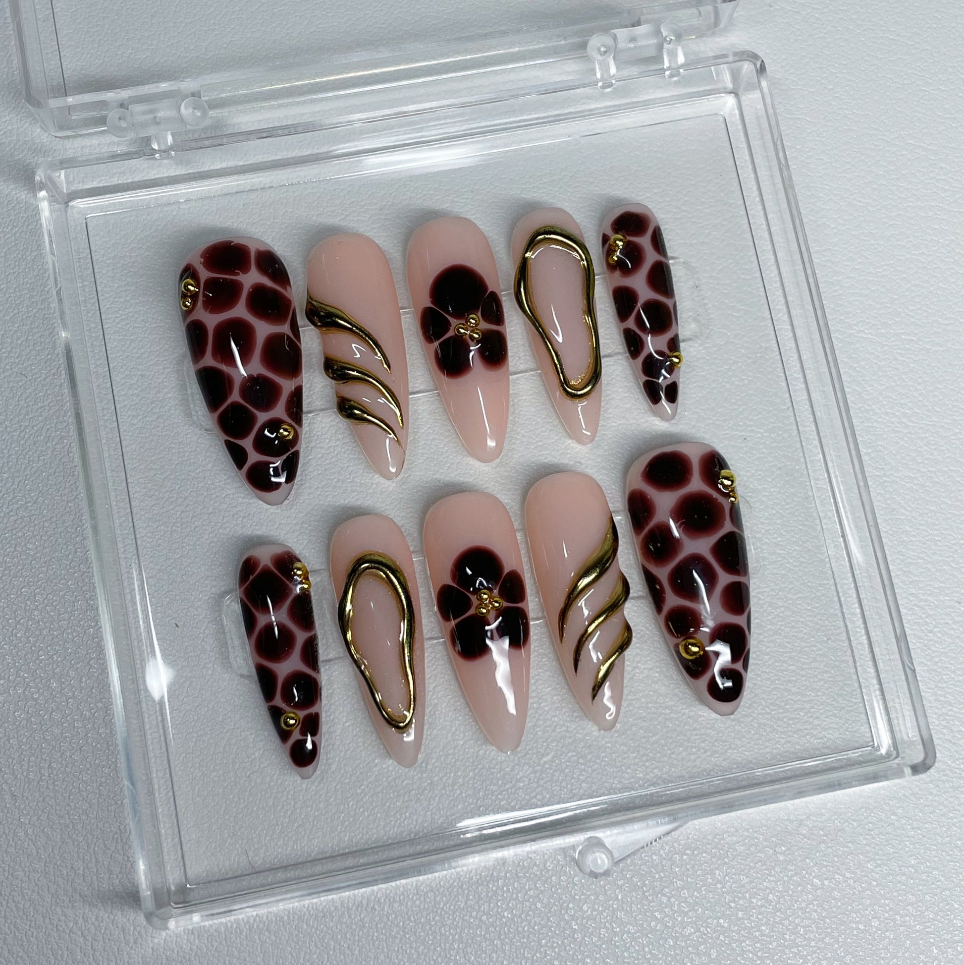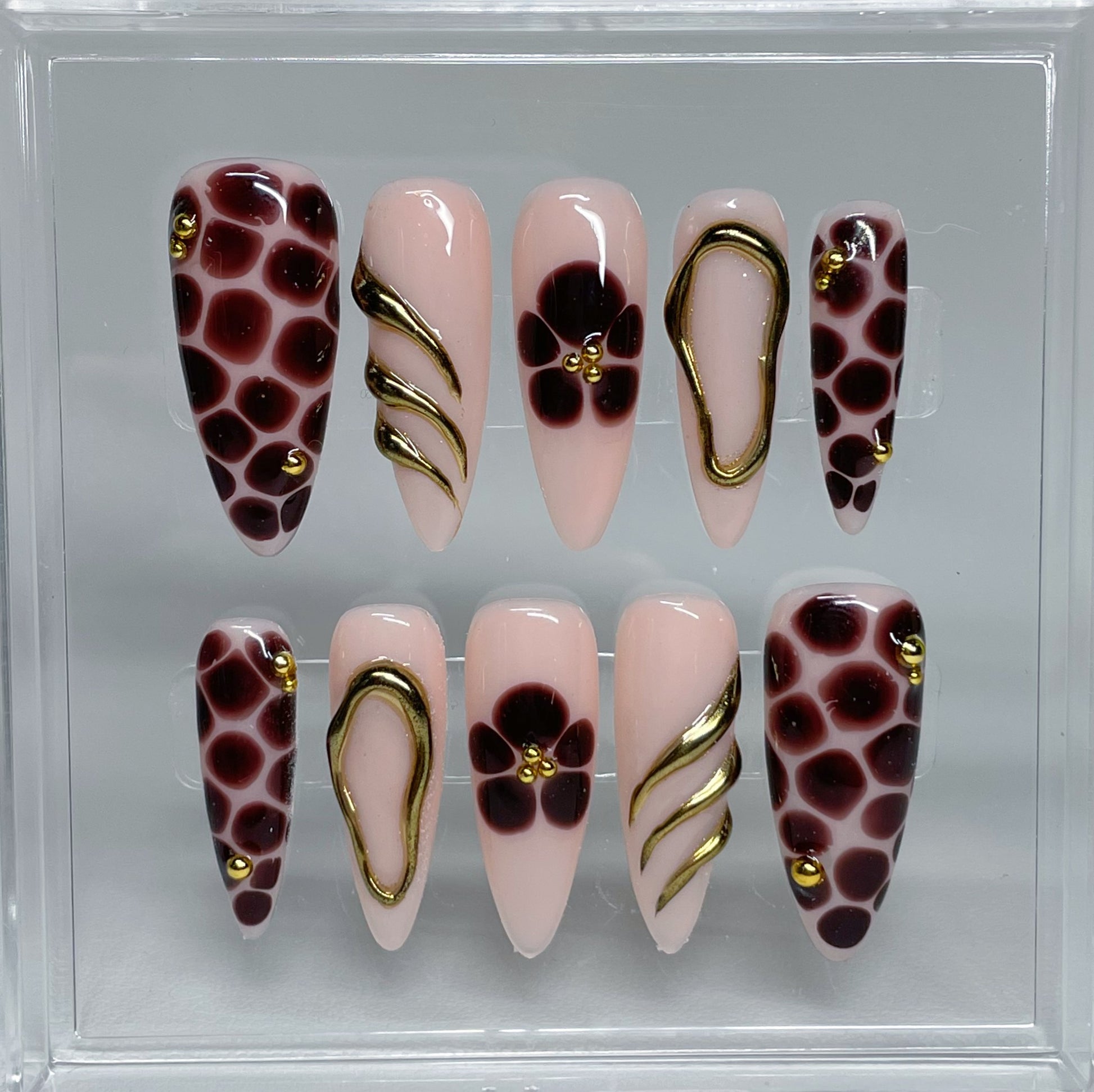 Your pressie set comes with 10 reusable press on nails as pictured, instructions on how to apply and remove your pressies, and an application kit containing everything you need for a seamless application!