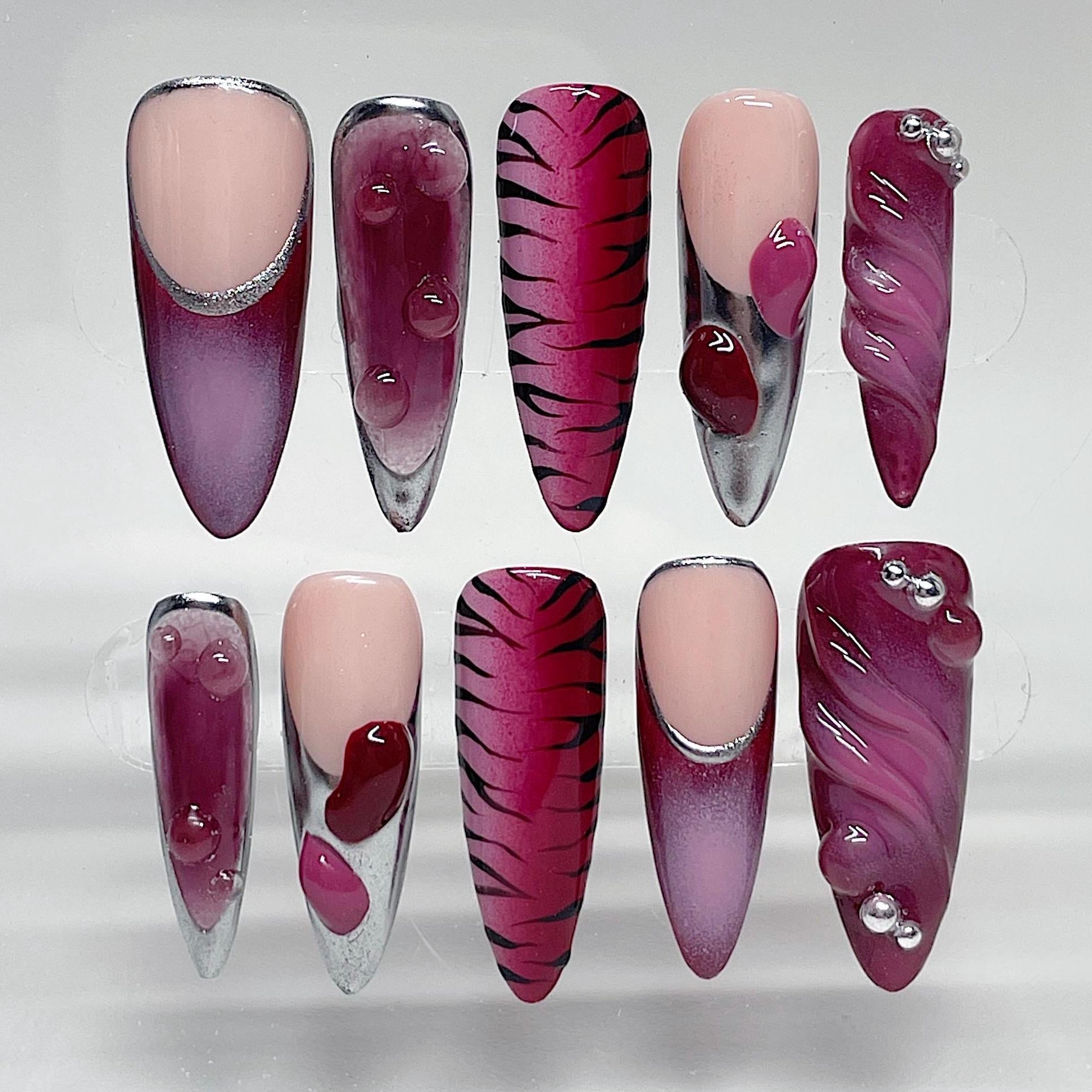 Your pressie set comes with 10 reusable press on nails as pictured, instructions on how to apply and remove your pressies, and an application kit containing everything you need for a seamless application!