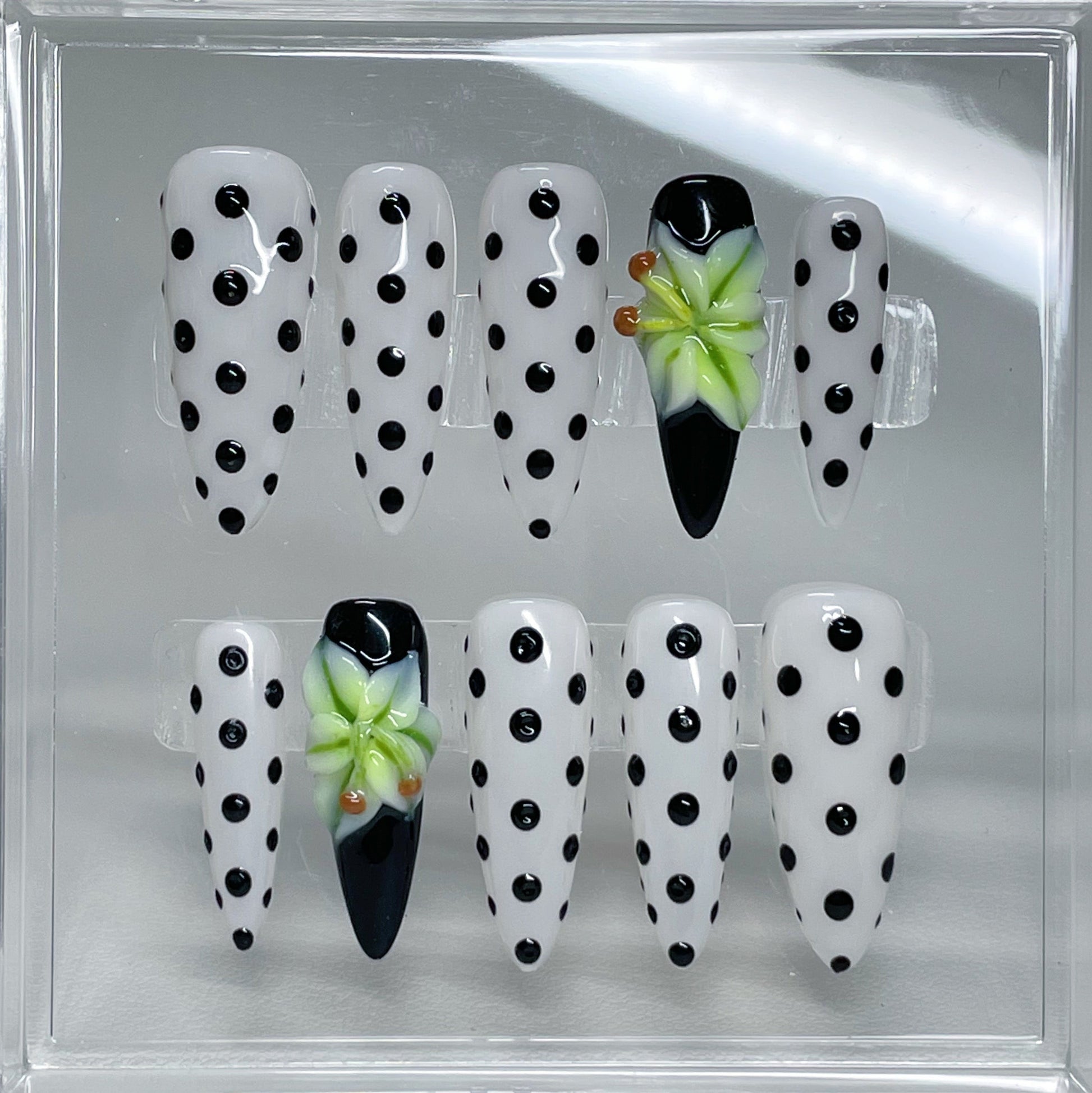Your pressie set comes with 10 reusable press on nails as pictured, instructions on how to apply and remove your pressies, and an application kit containing everything you need for a seamless application!