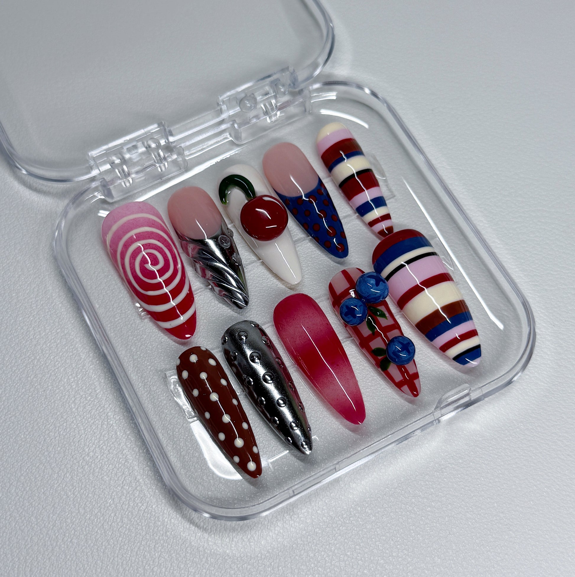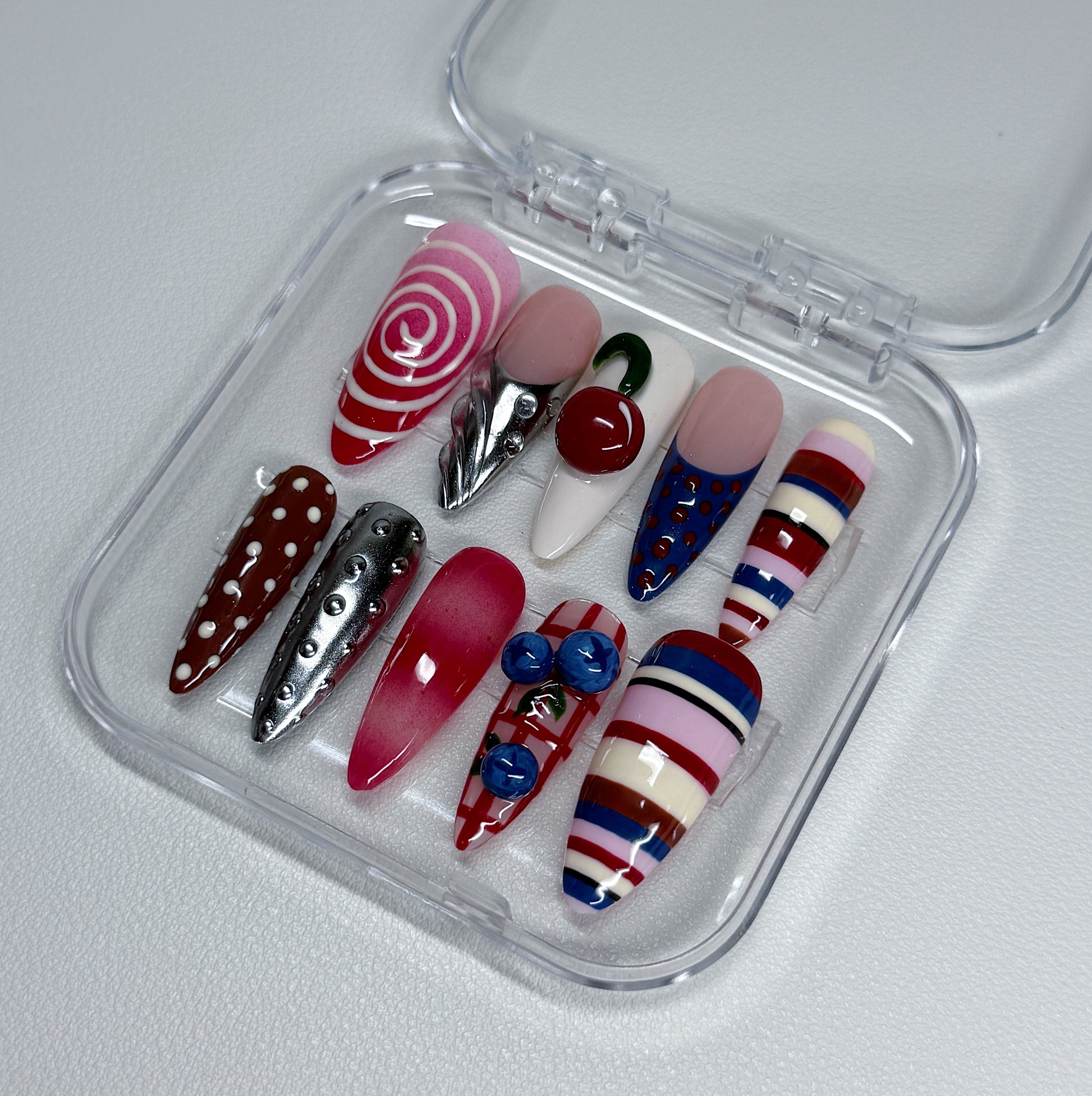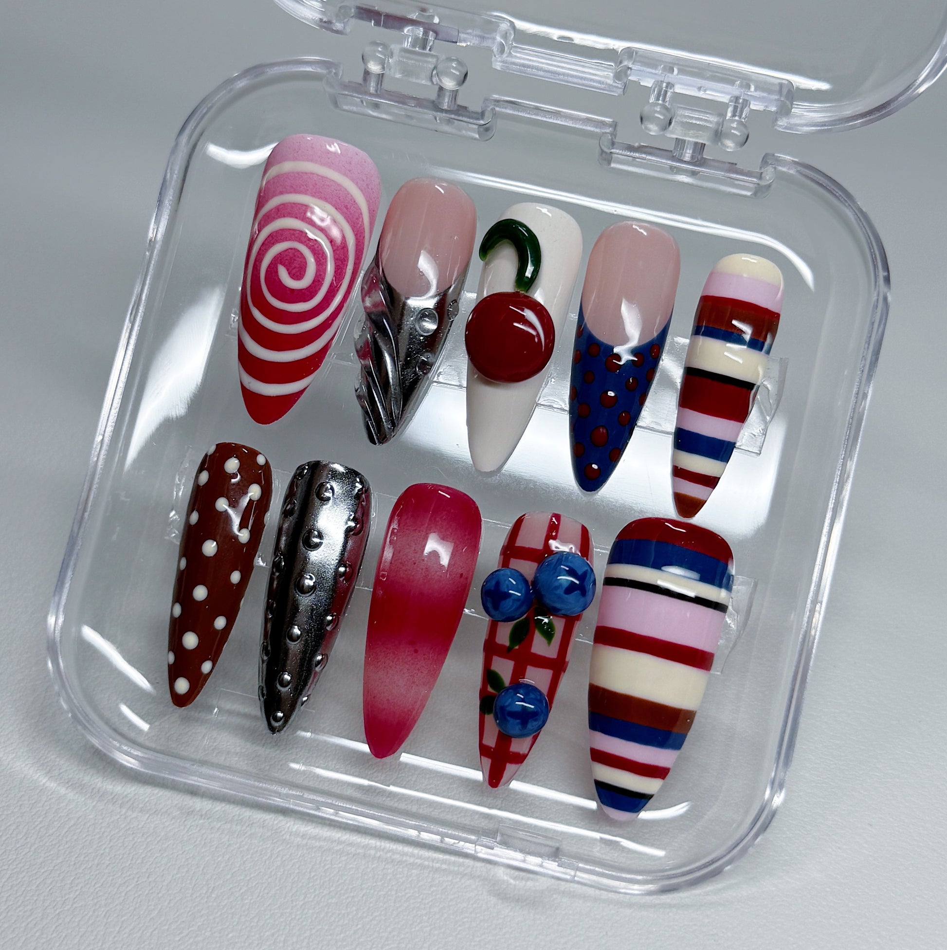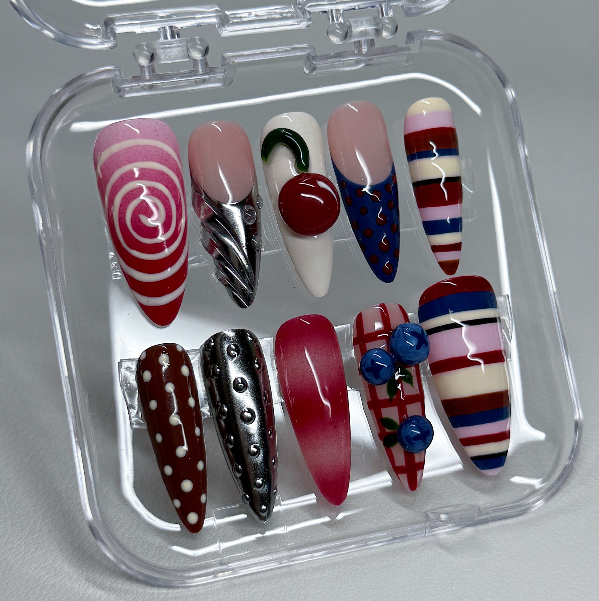 Your pressie set comes with 10 reusable press on nails as pictured, instructions on how to apply and remove your pressies, and an application kit containing everything you need for a seamless application!
