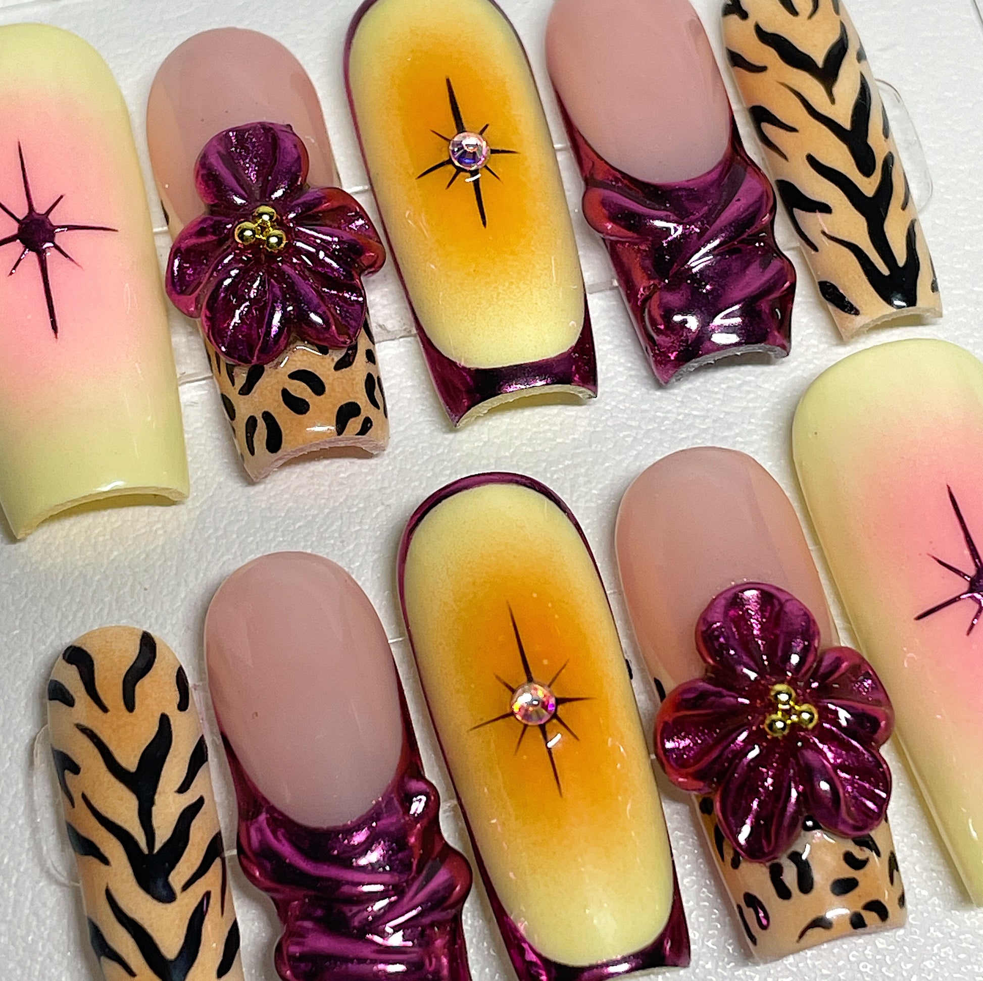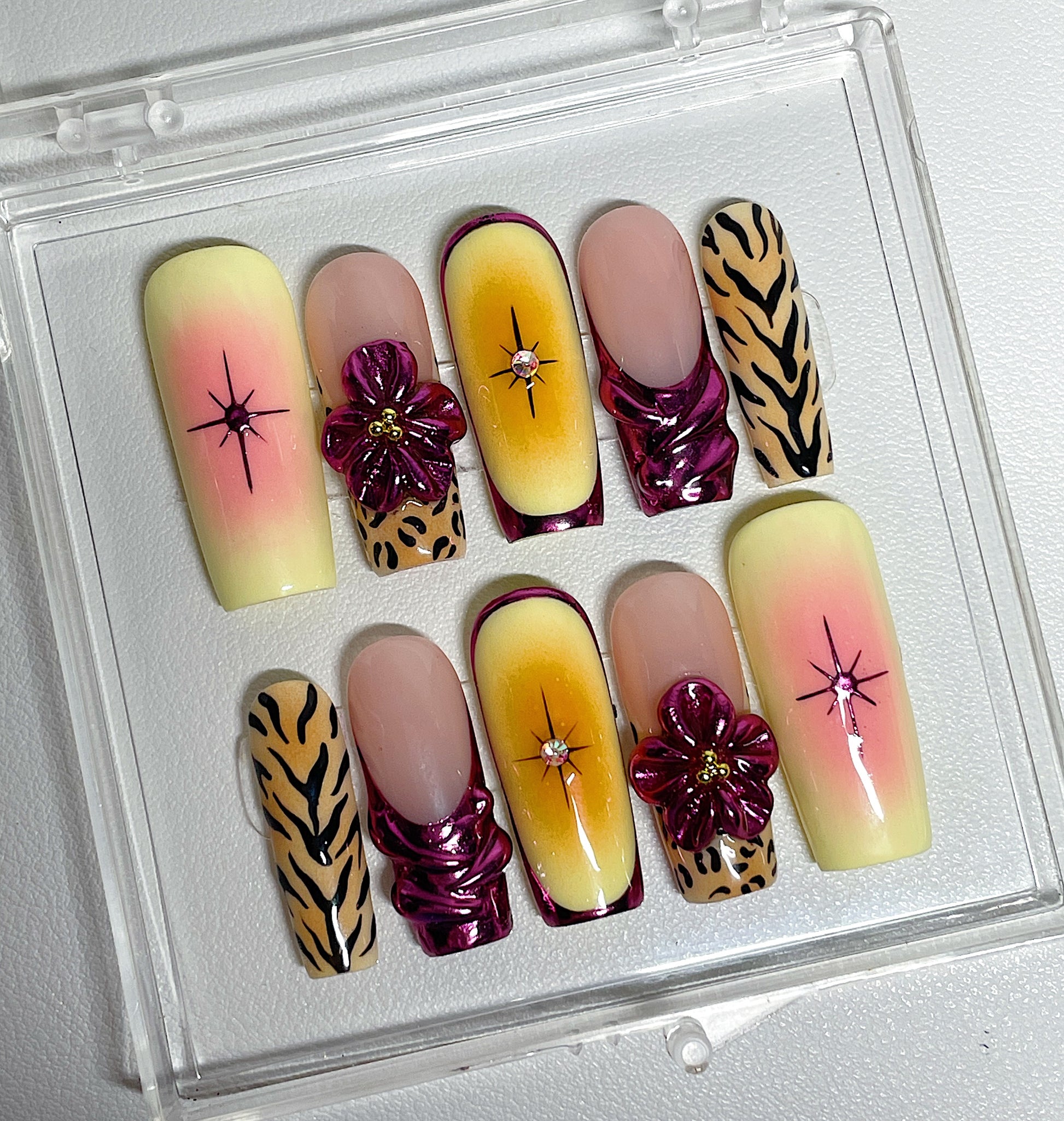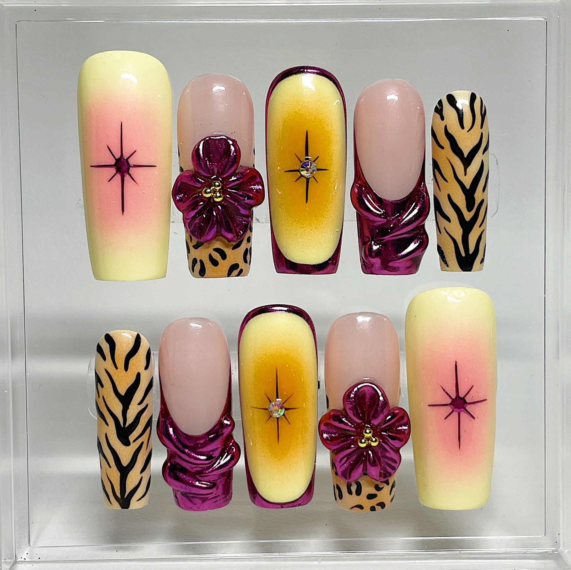 Your pressie set comes with 10 reusable press on nails as pictured, instructions on how to apply and remove your pressies, and an application kit containing everything you need for a seamless application!