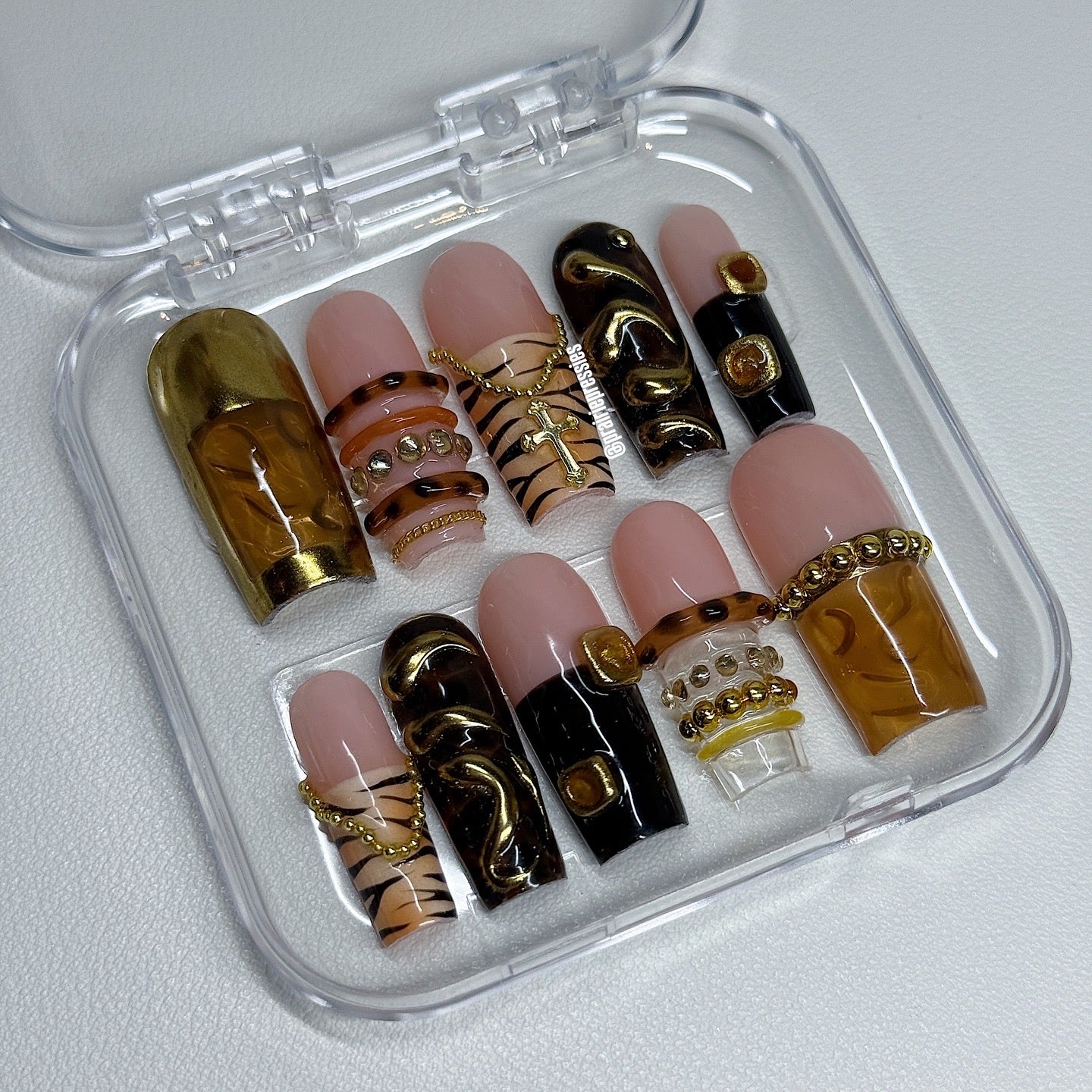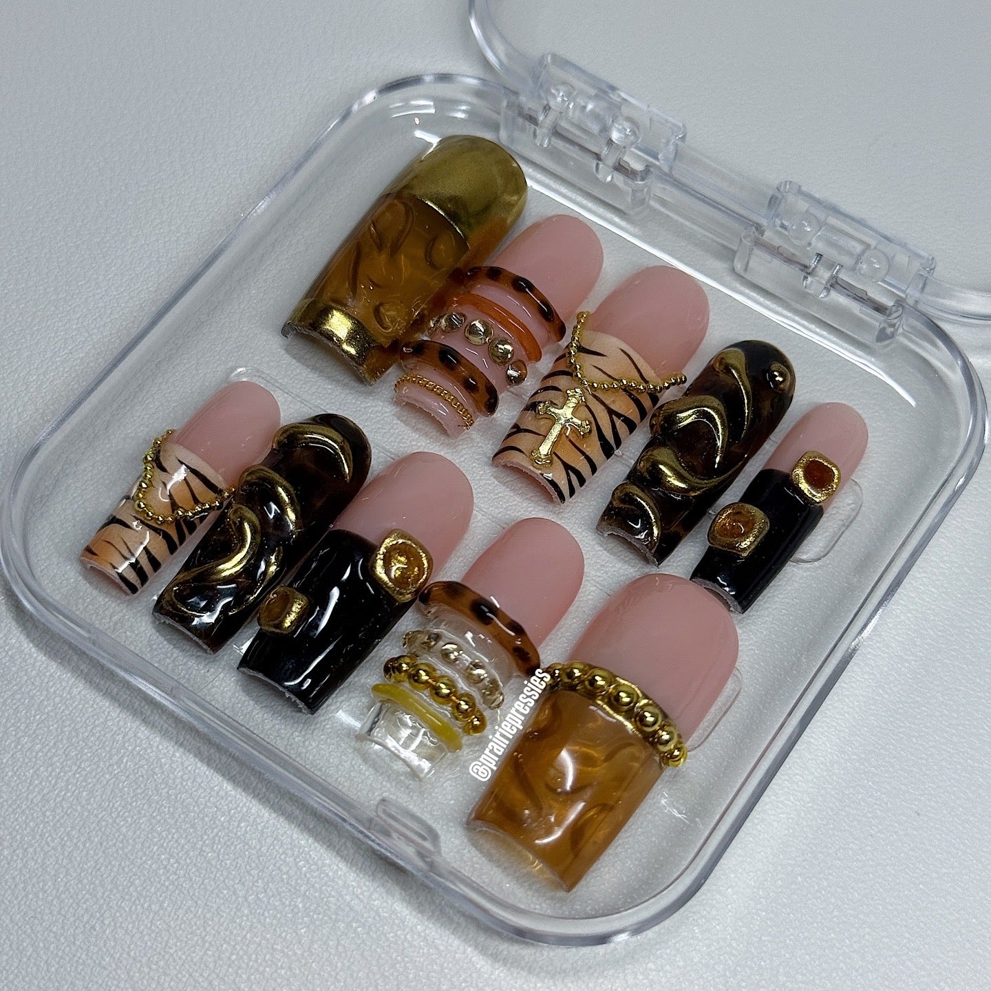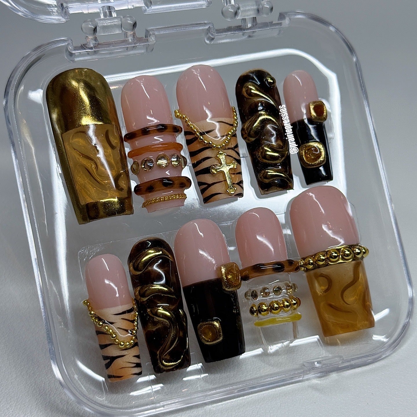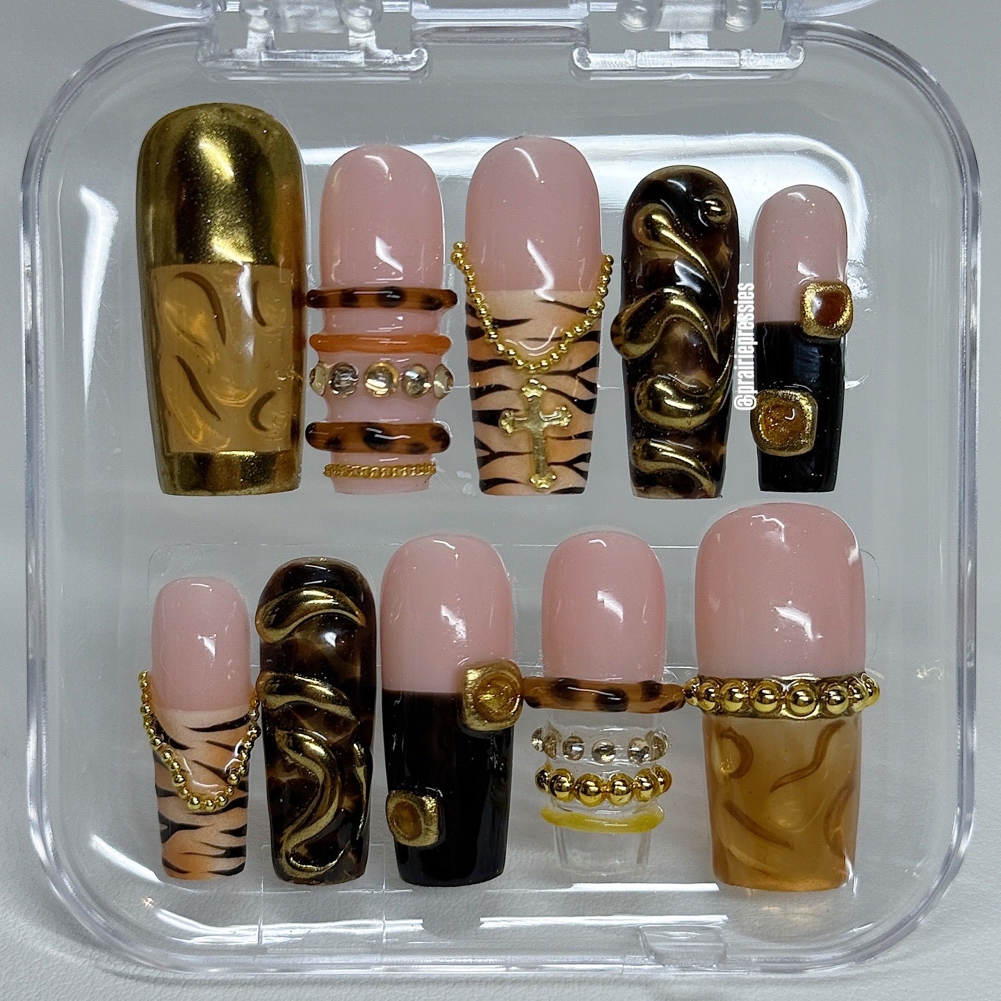 Your pressie set comes with 10 reusable press on nails as pictured, instructions on how to apply and remove your pressies, and an application kit containing everything you need for a seamless application!