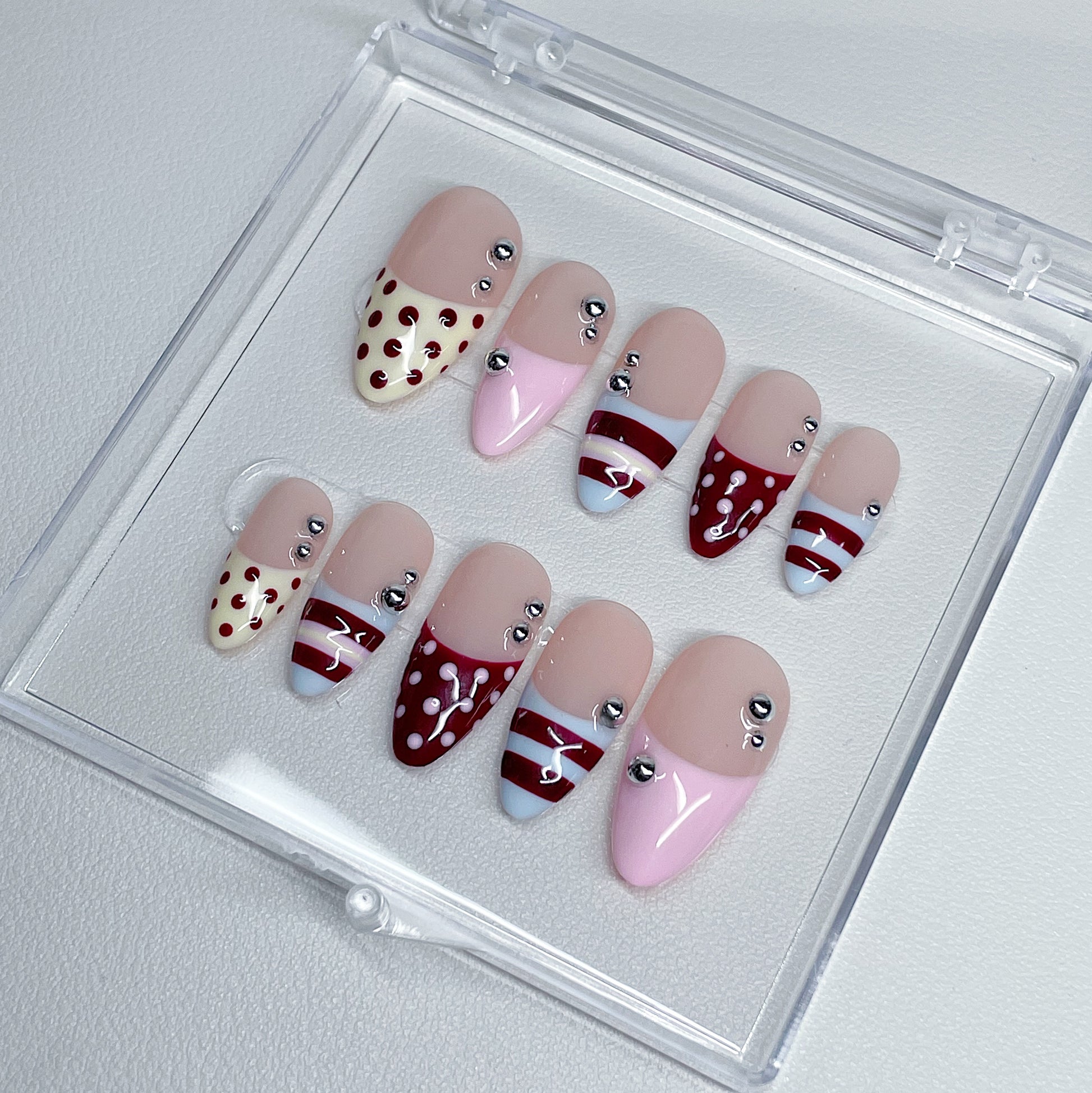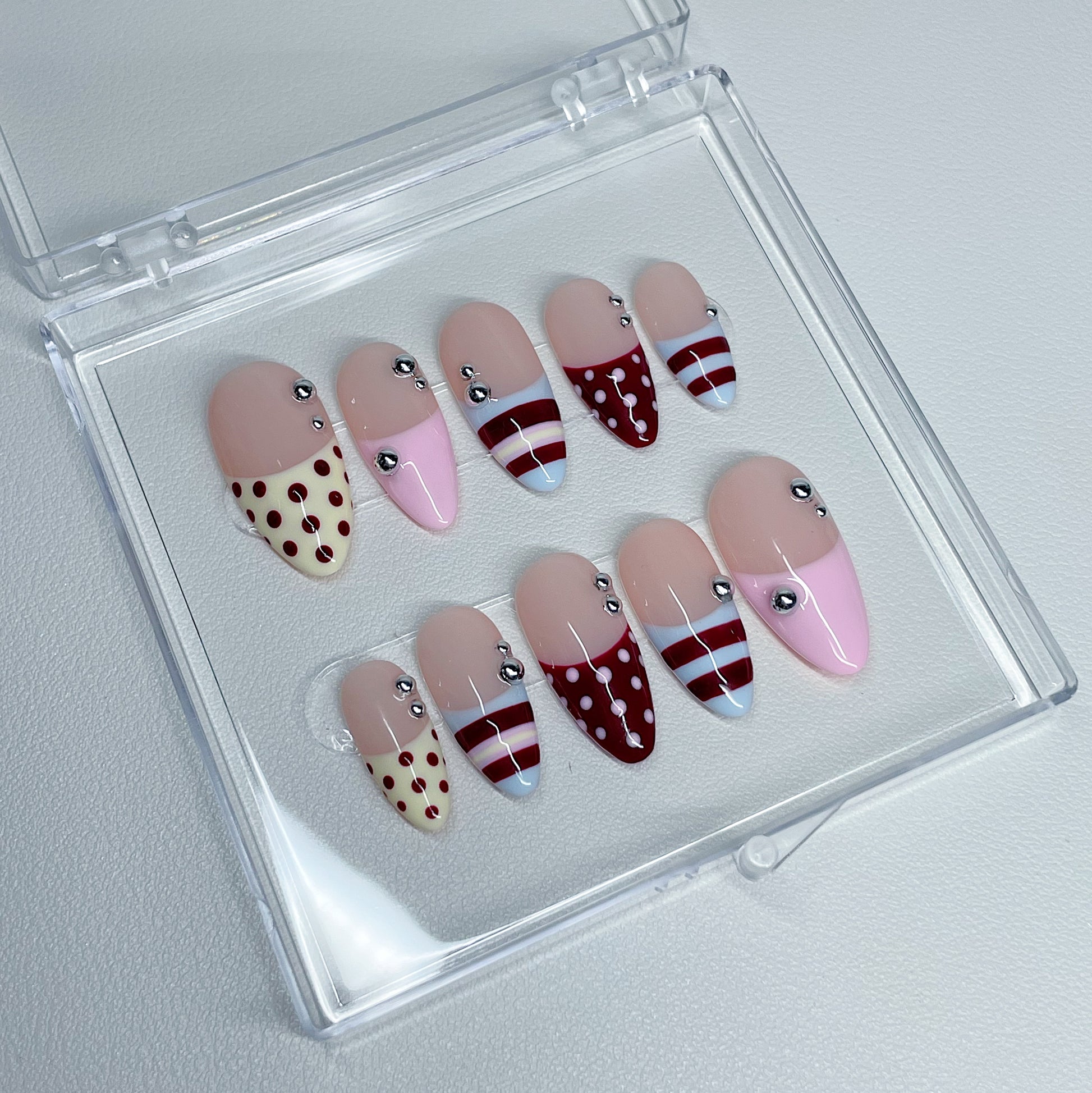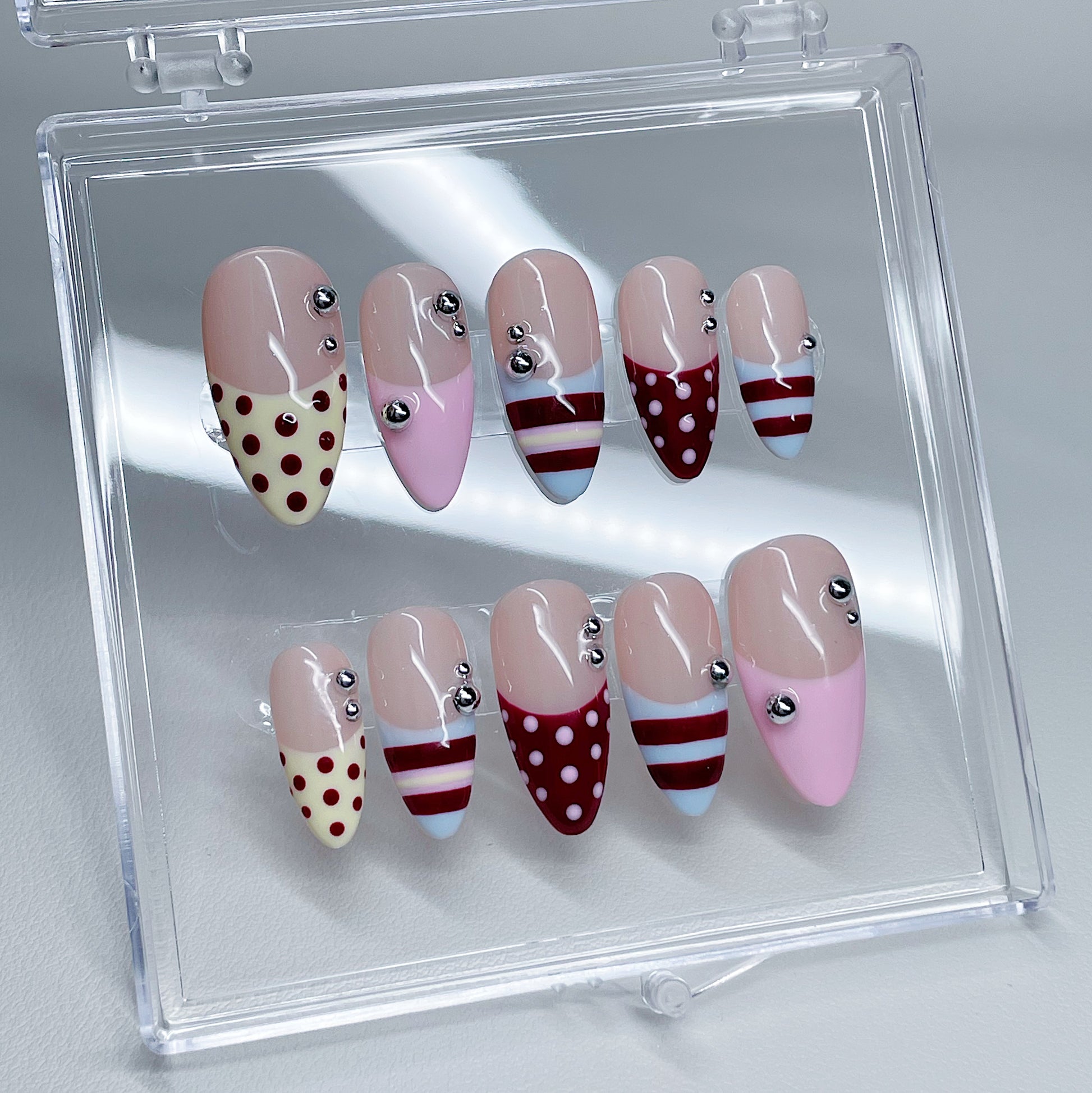 Your pressie set comes with 10 reusable press on nails as pictured, instructions on how to apply and remove your pressies, and an application kit containing everything you need for a seamless application!