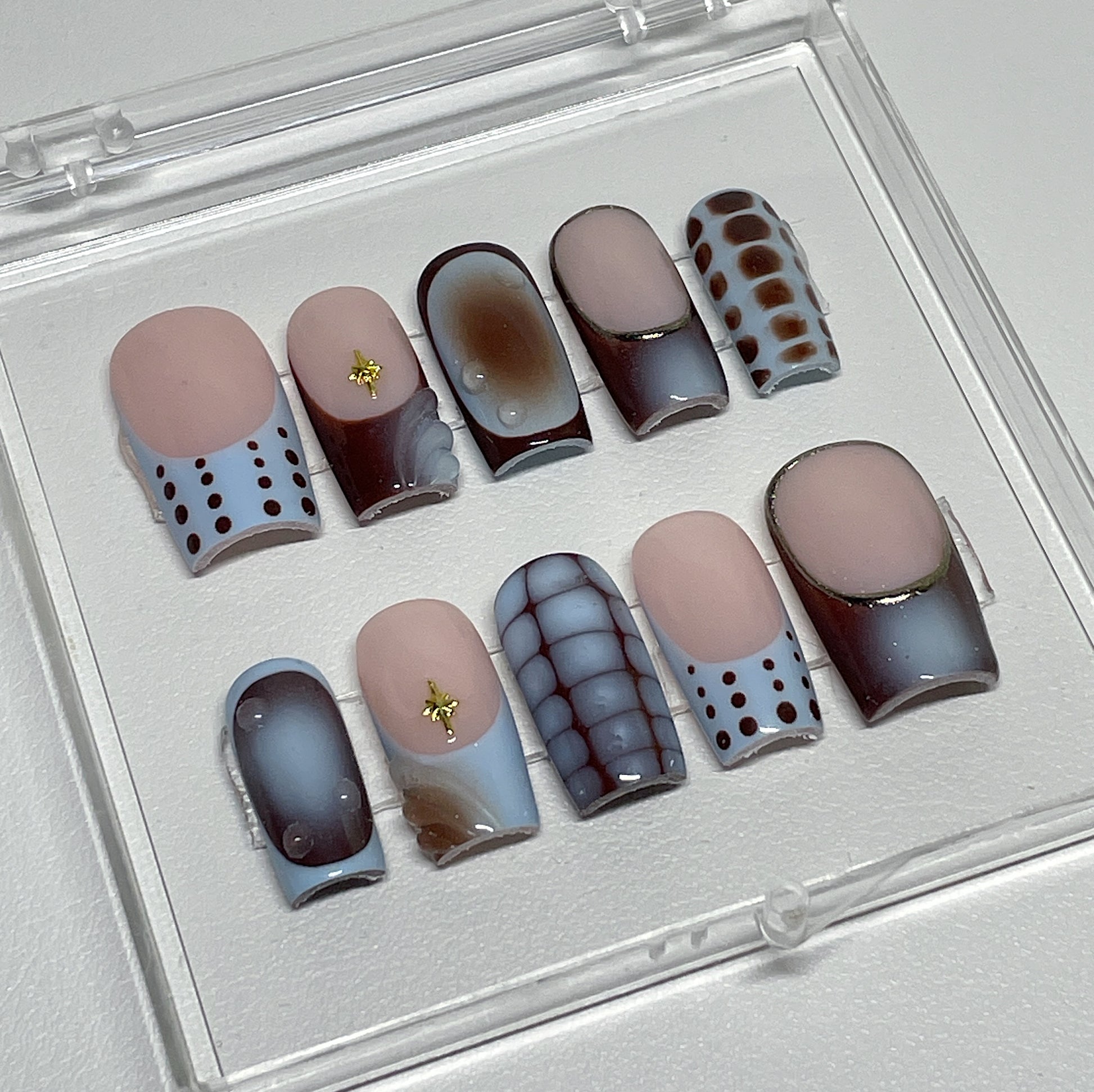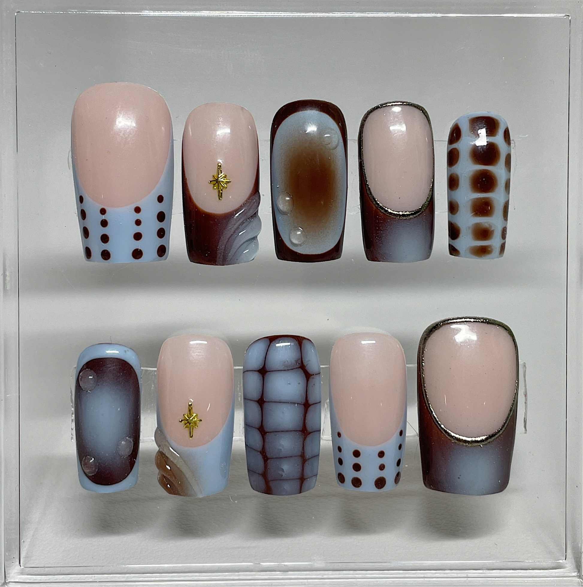 Your pressie set comes with 10 reusable press on nails as pictured, instructions on how to apply and remove your pressies, and an application kit containing everything you need for a seamless application!