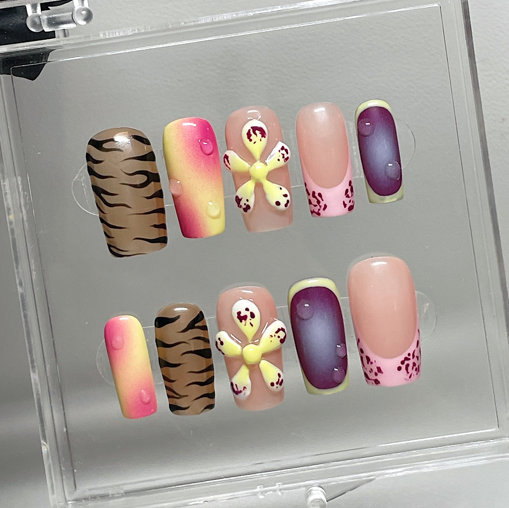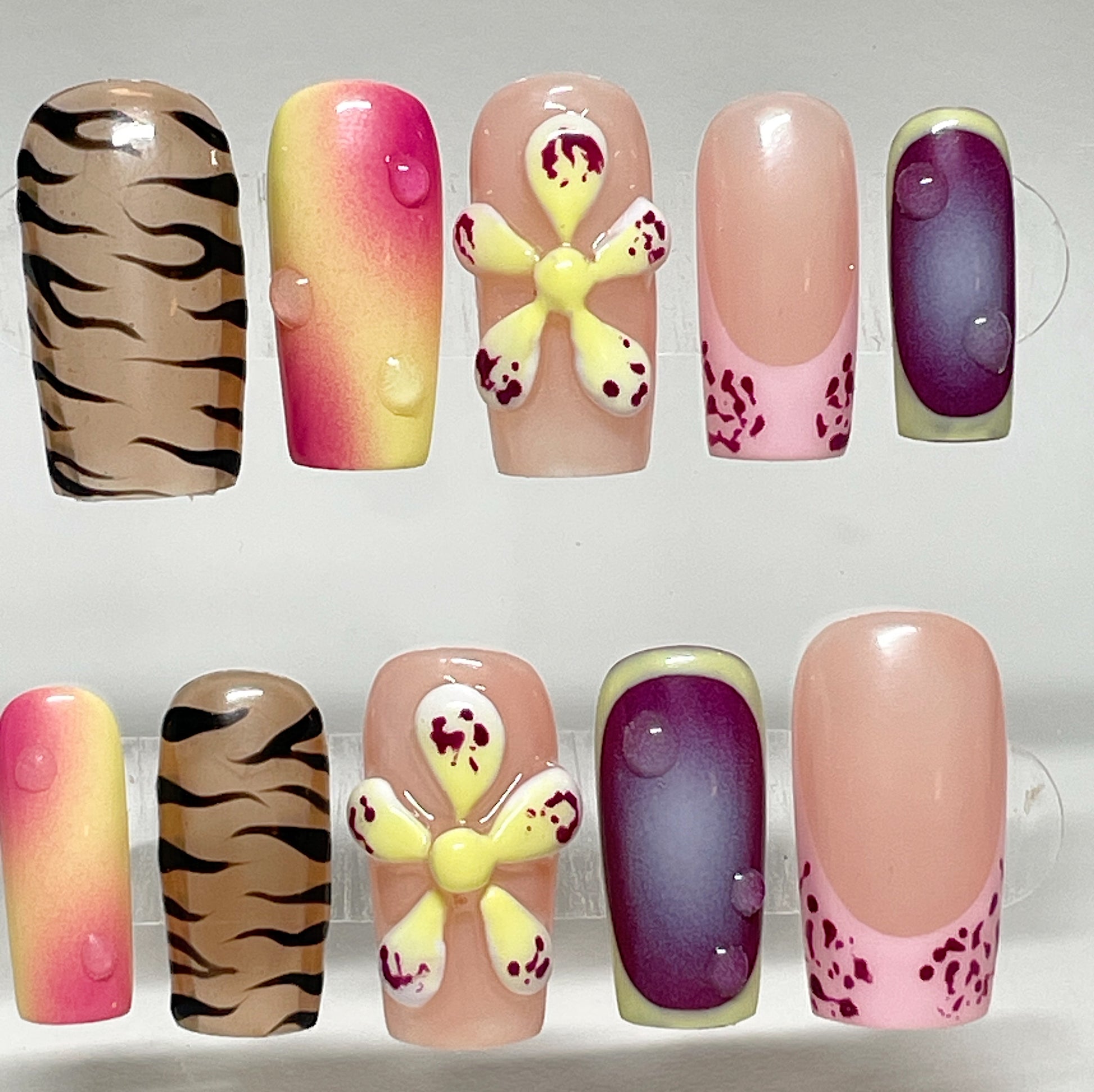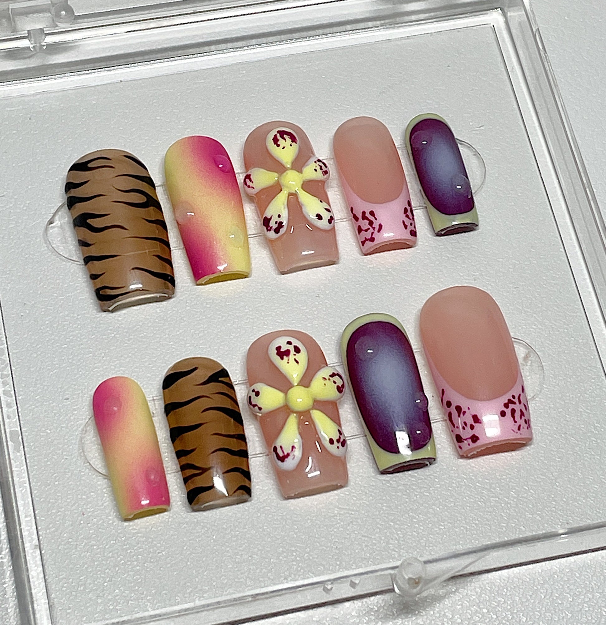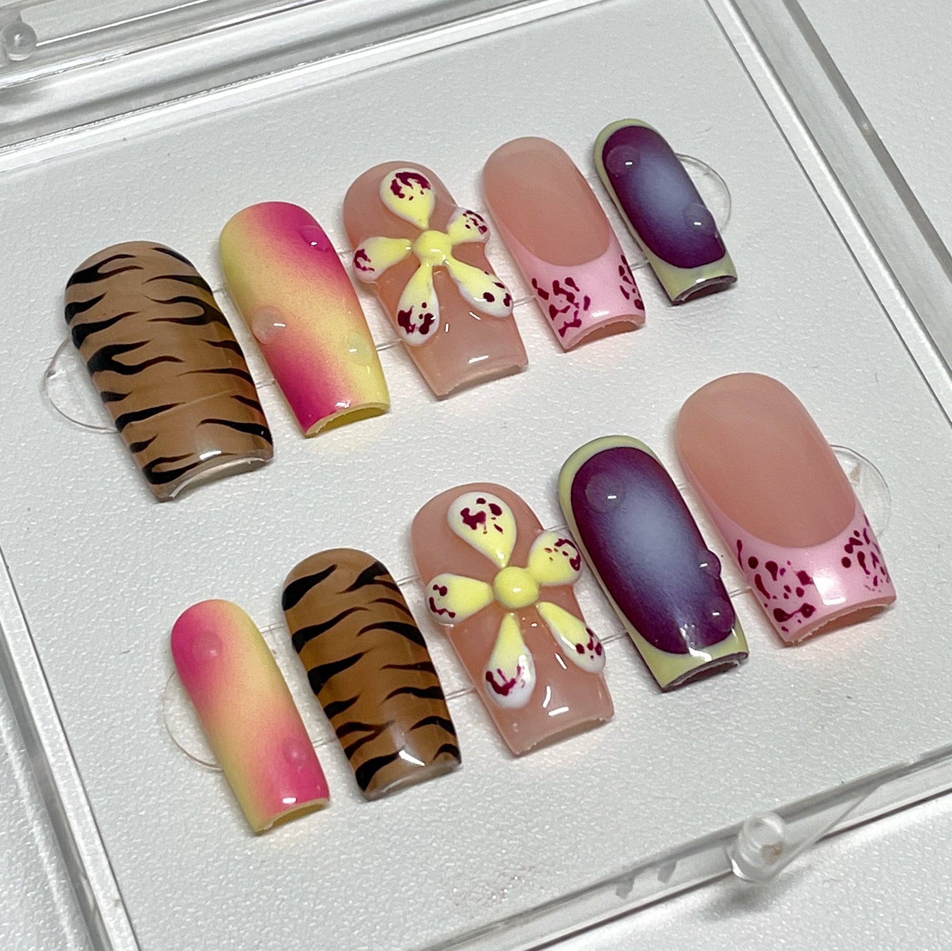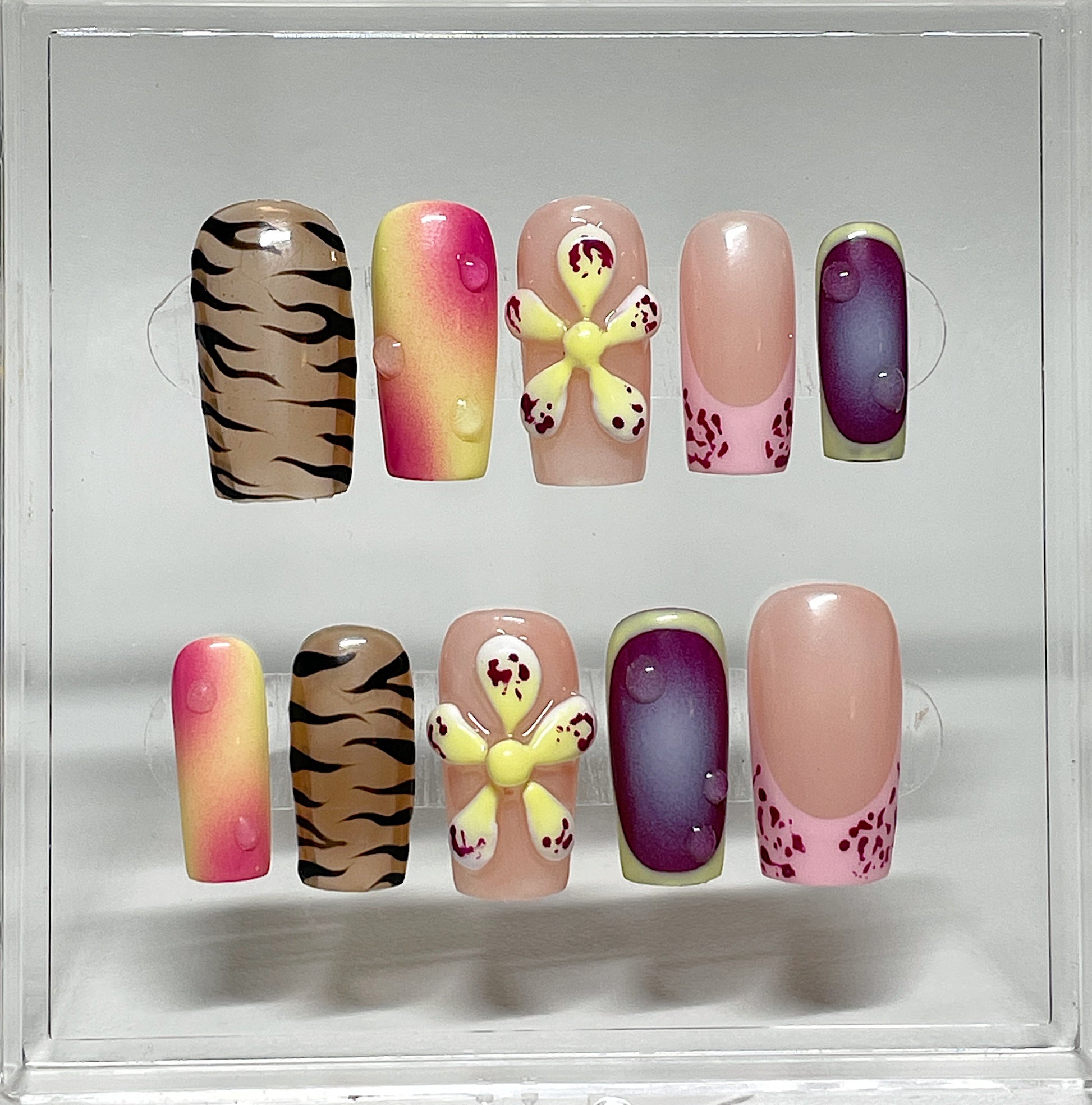 Your pressie set comes with 10 reusable press on nails as pictured, instructions on how to apply and remove your pressies, and an application kit containing everything you need for a seamless application!