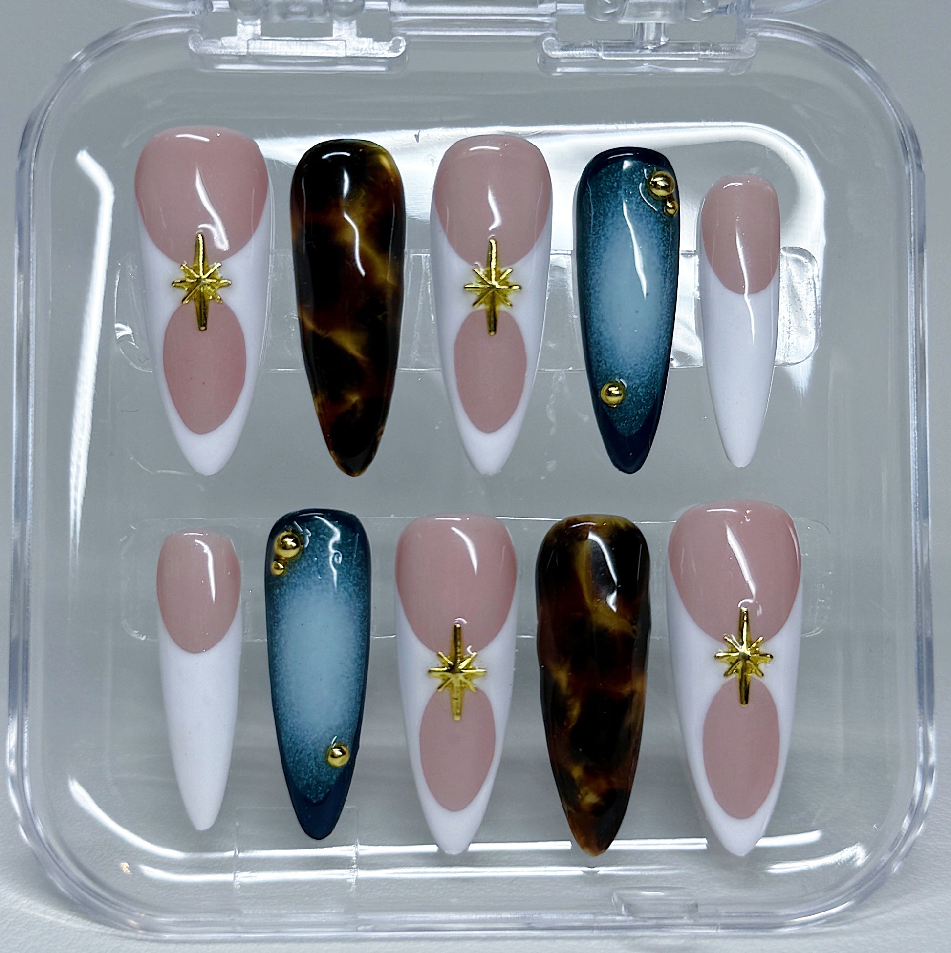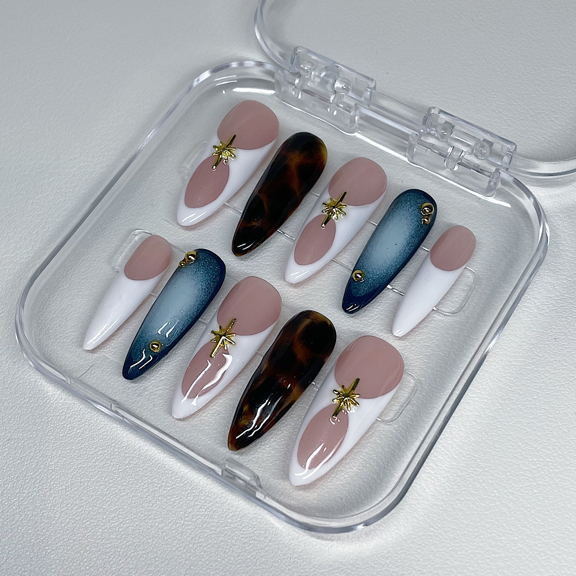 Your pressie set comes with 10 reusable press on nails as pictured, instructions on how to apply and remove your pressies, and an application kit containing everything you need for a seamless application!