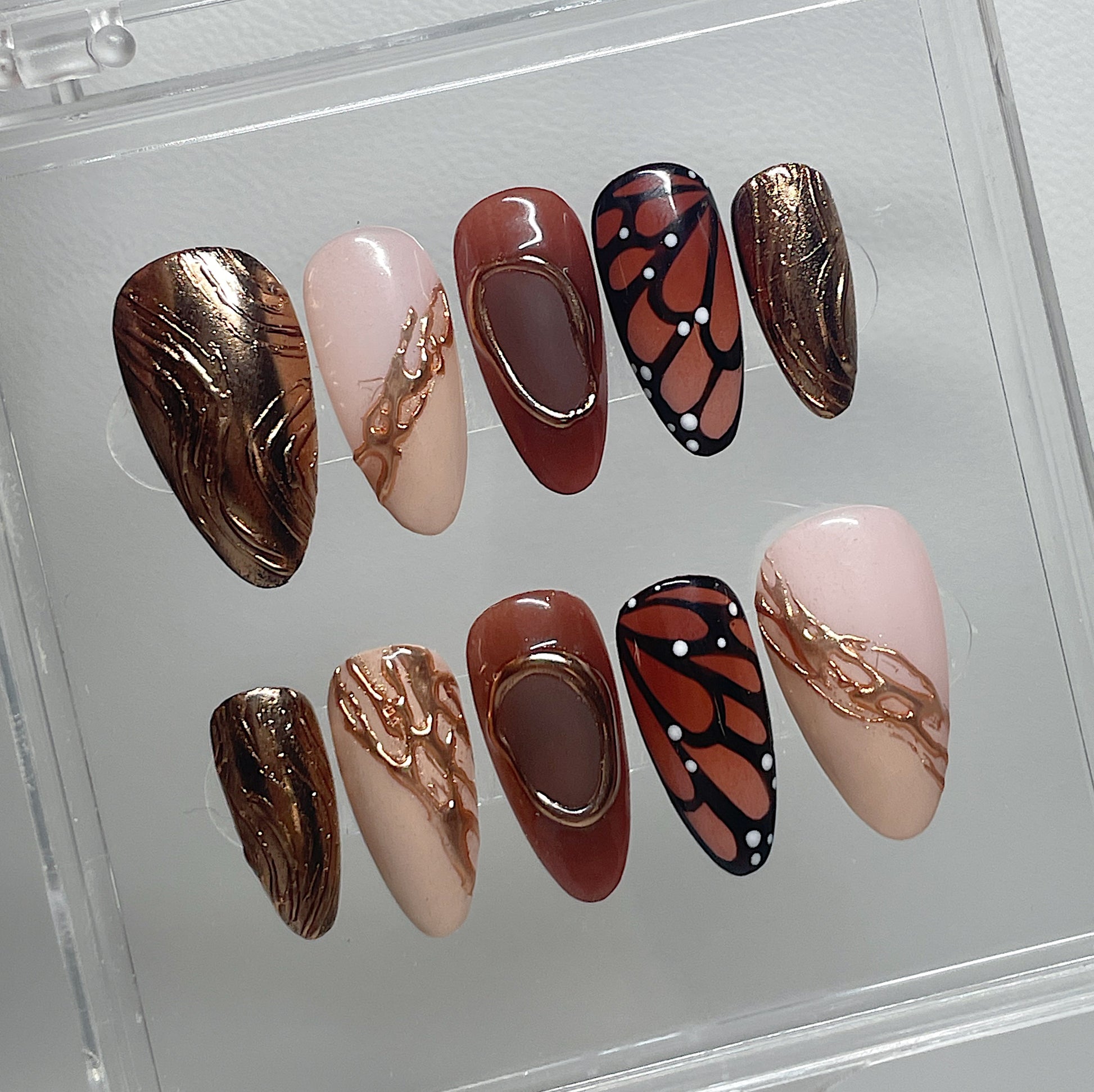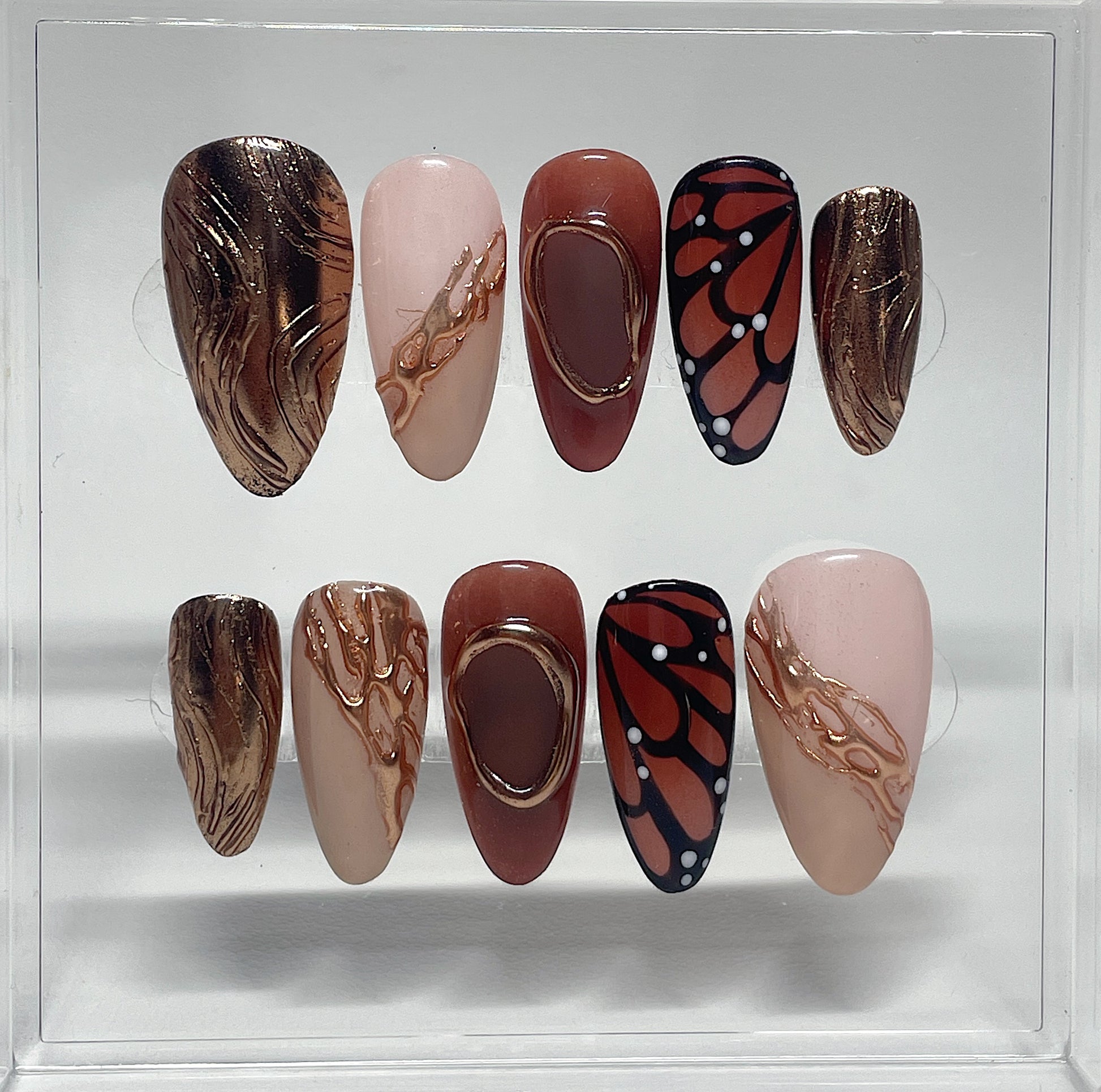 Your pressie set comes with 10 reusable press on nails as pictured, instructions on how to apply and remove your pressies, and an application kit containing everything you need for a seamless application!