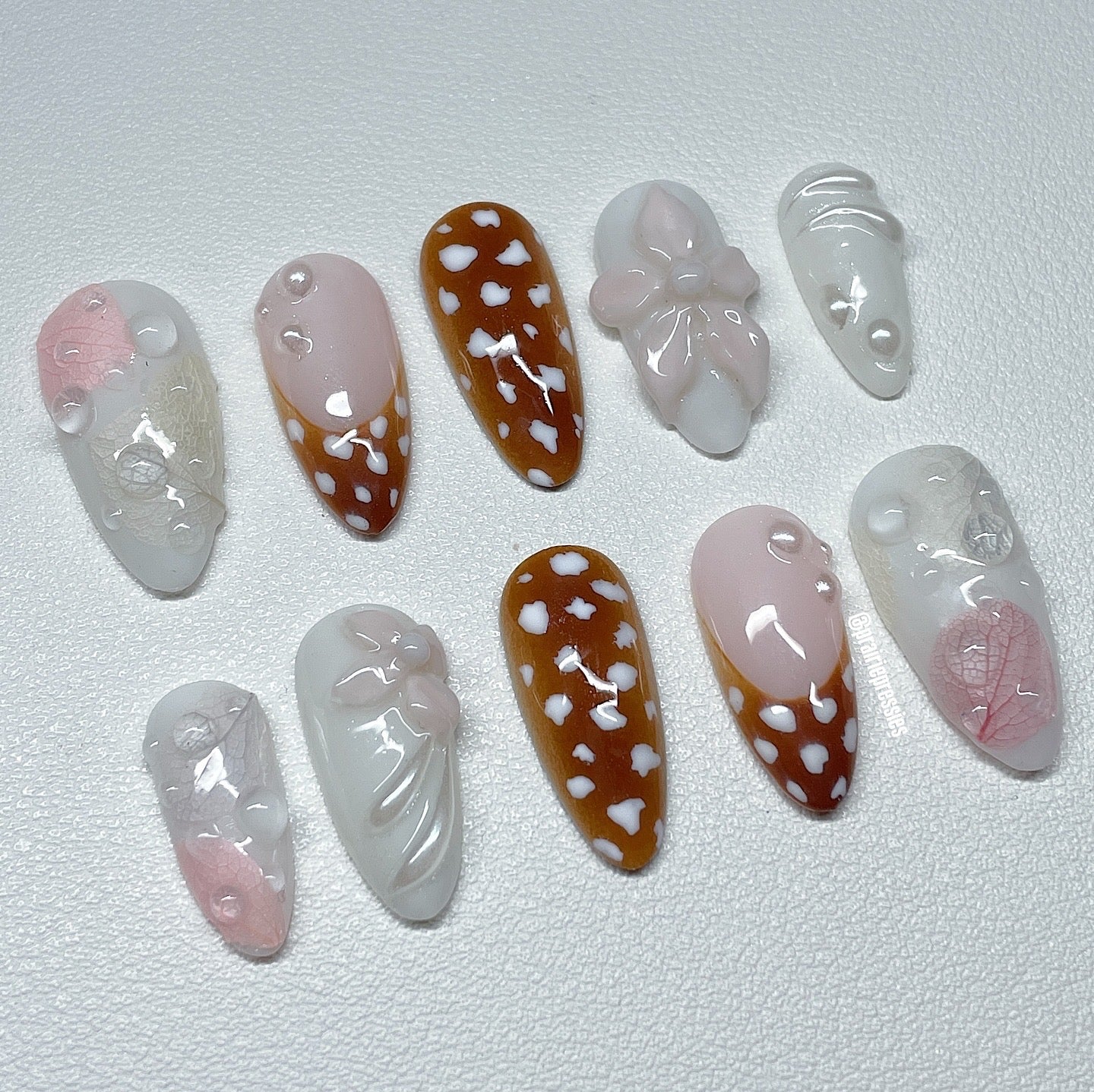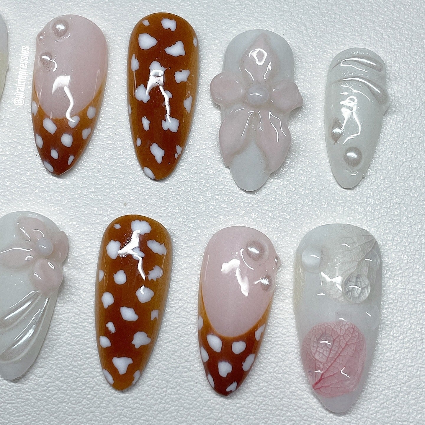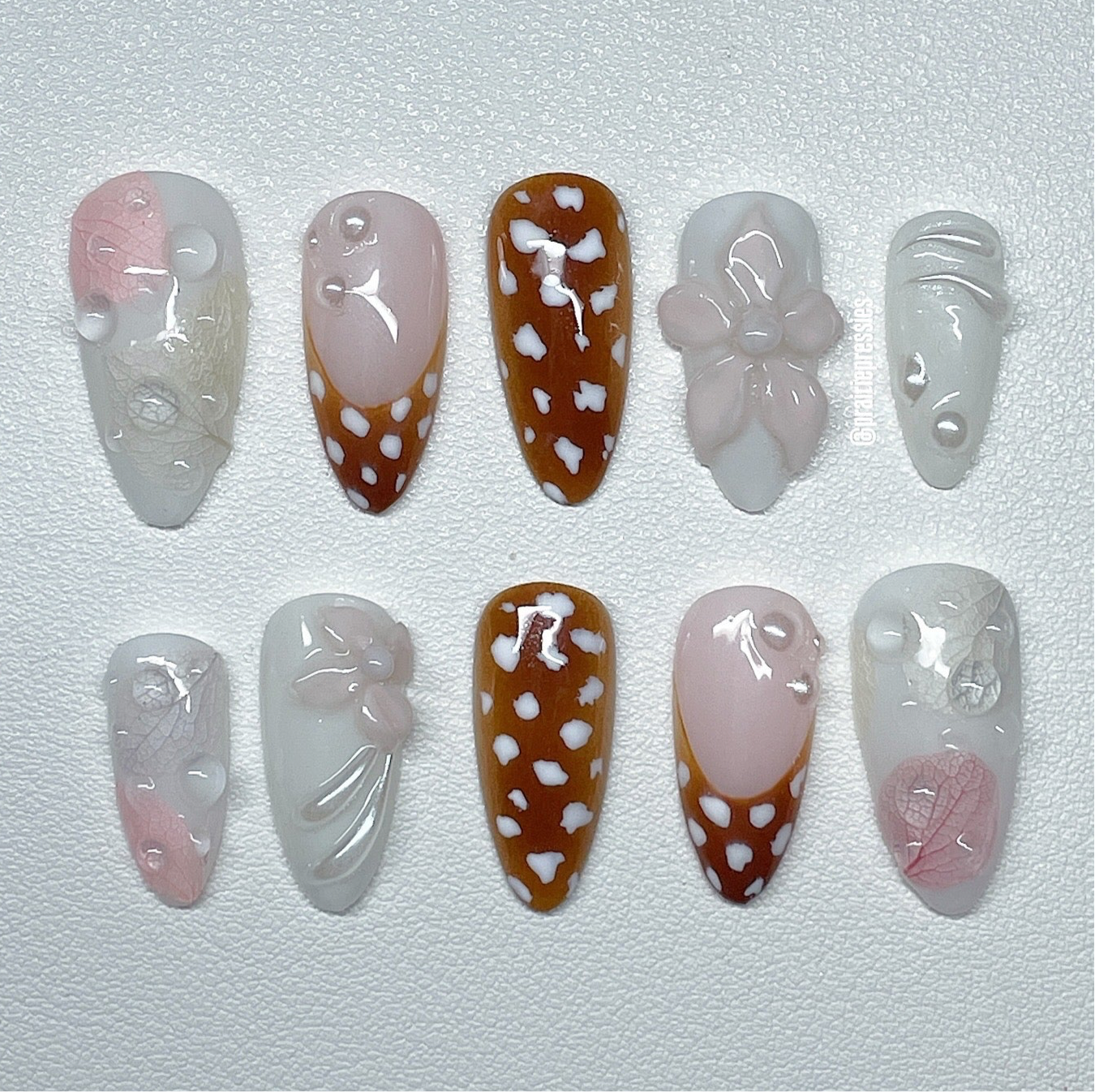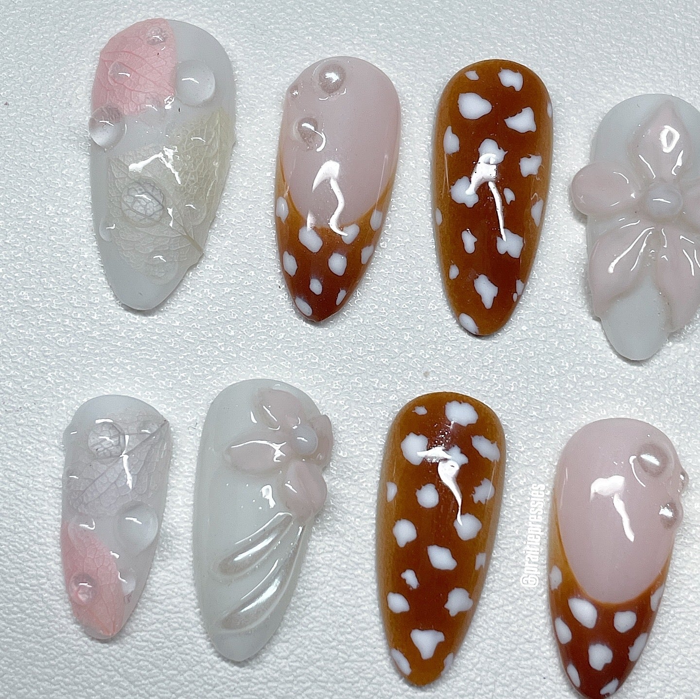 Your pressie set comes with 10 reusable press on nails as pictured, instructions on how to apply and remove your pressies, and an application kit containing everything you need for a seamless application!