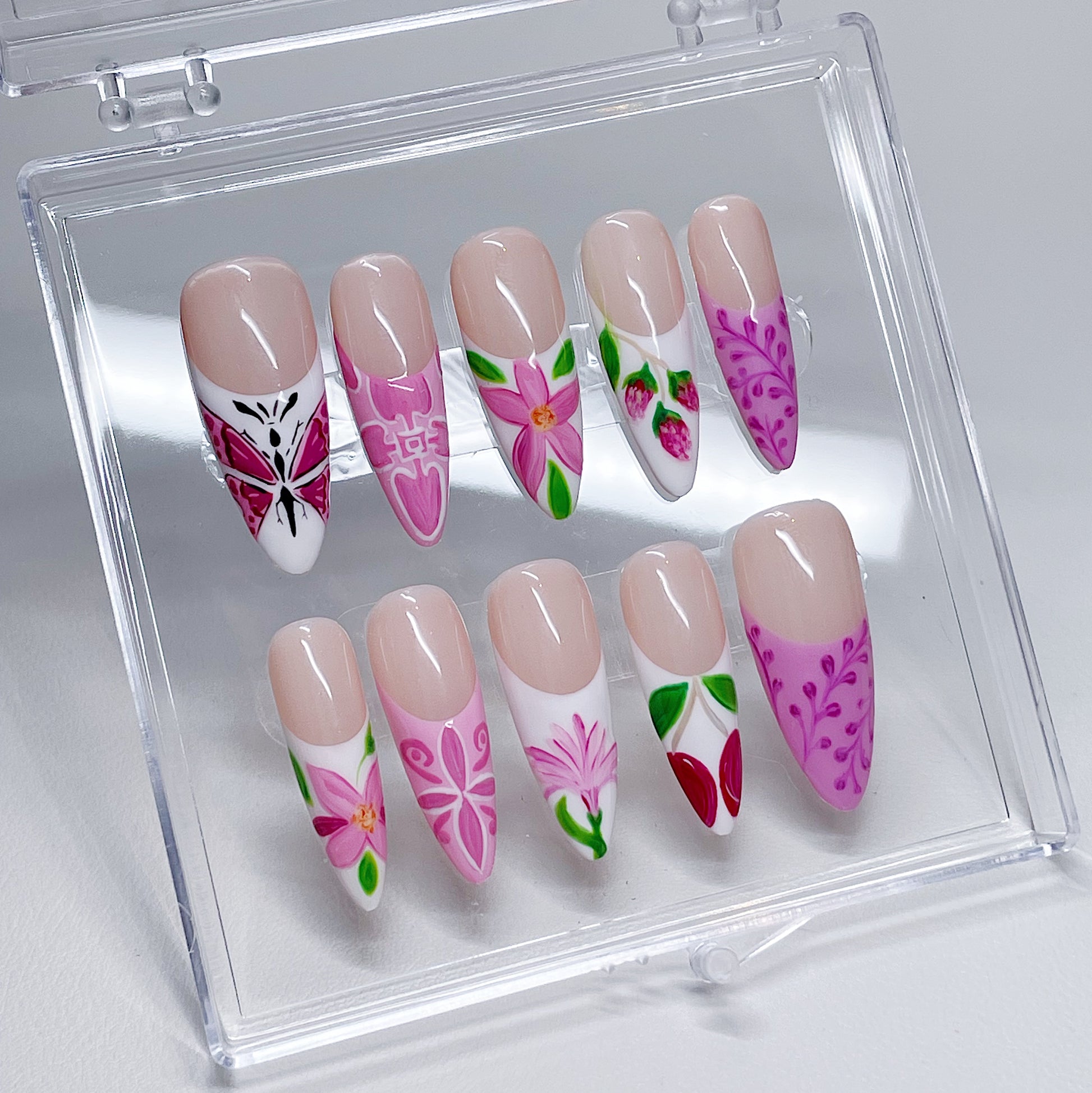 Your pressie set comes with 10 reusable press on nails as pictured, instructions on how to apply and remove your pressies, and an application kit containing everything you need for a seamless application!