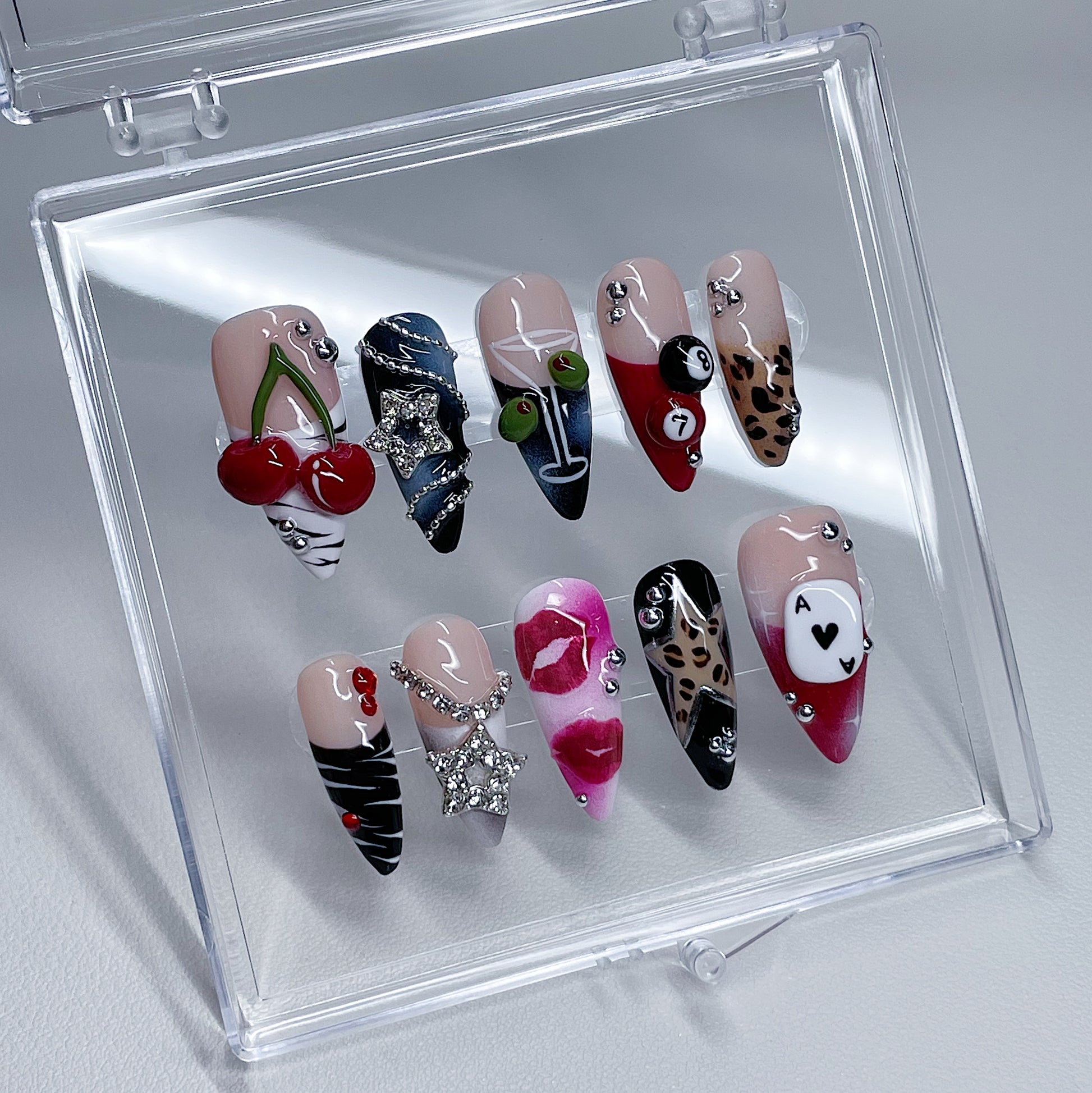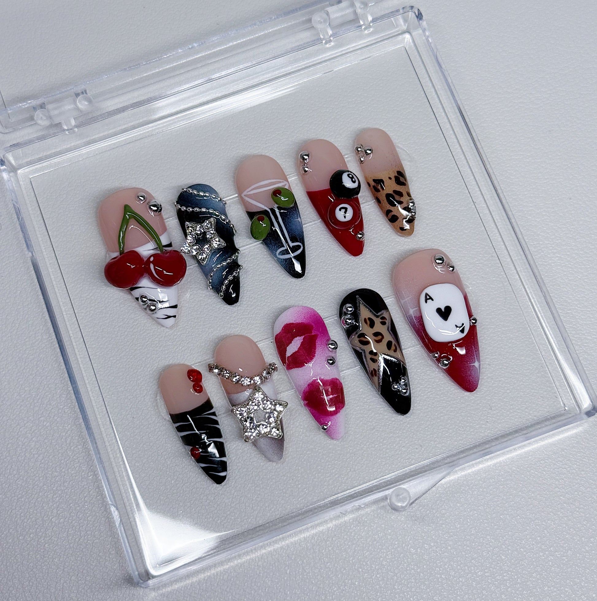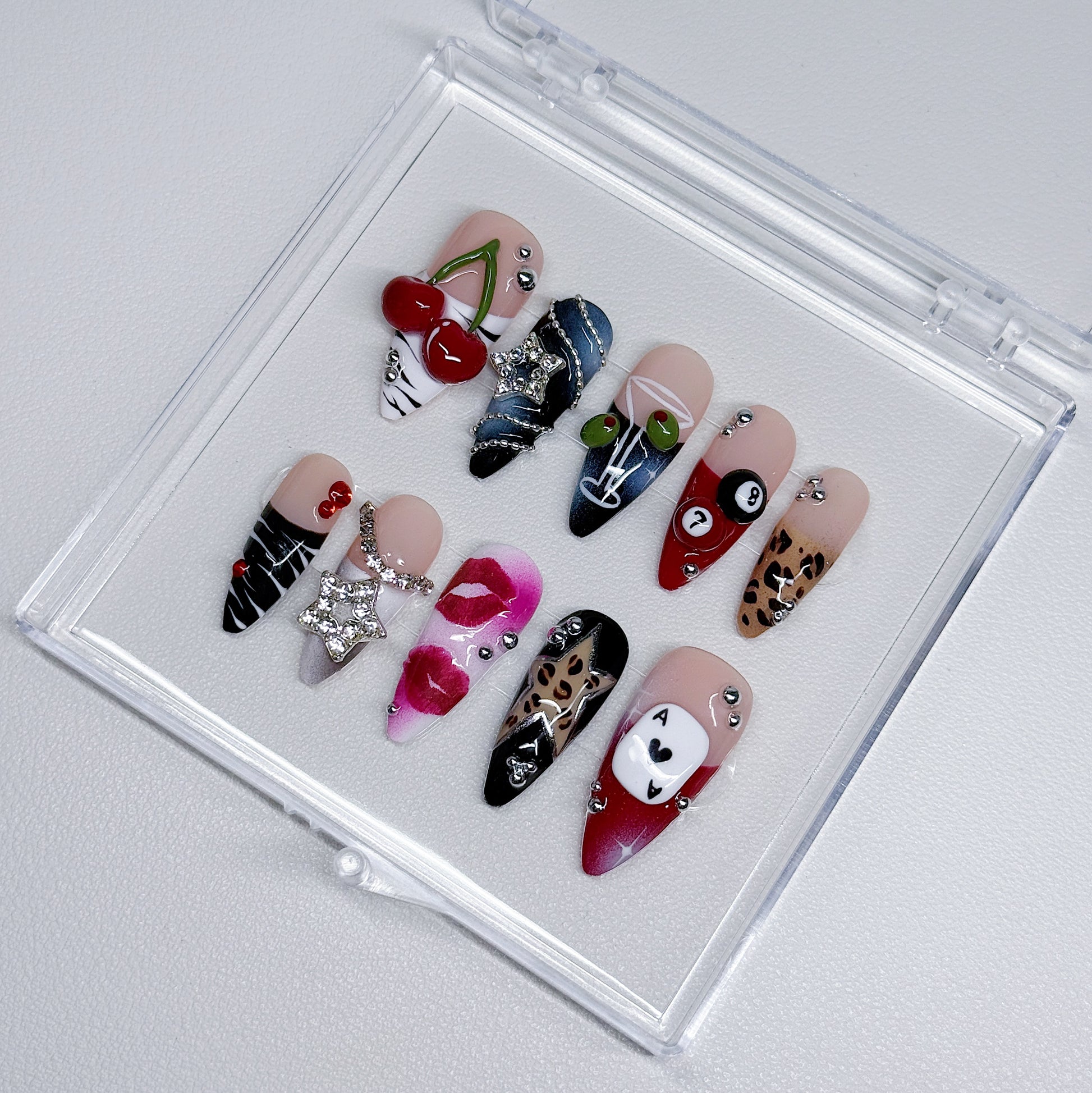 Your pressie set comes with 10 reusable press on nails as pictured, instructions on how to apply and remove your pressies, and an application kit containing everything you need for a seamless application!