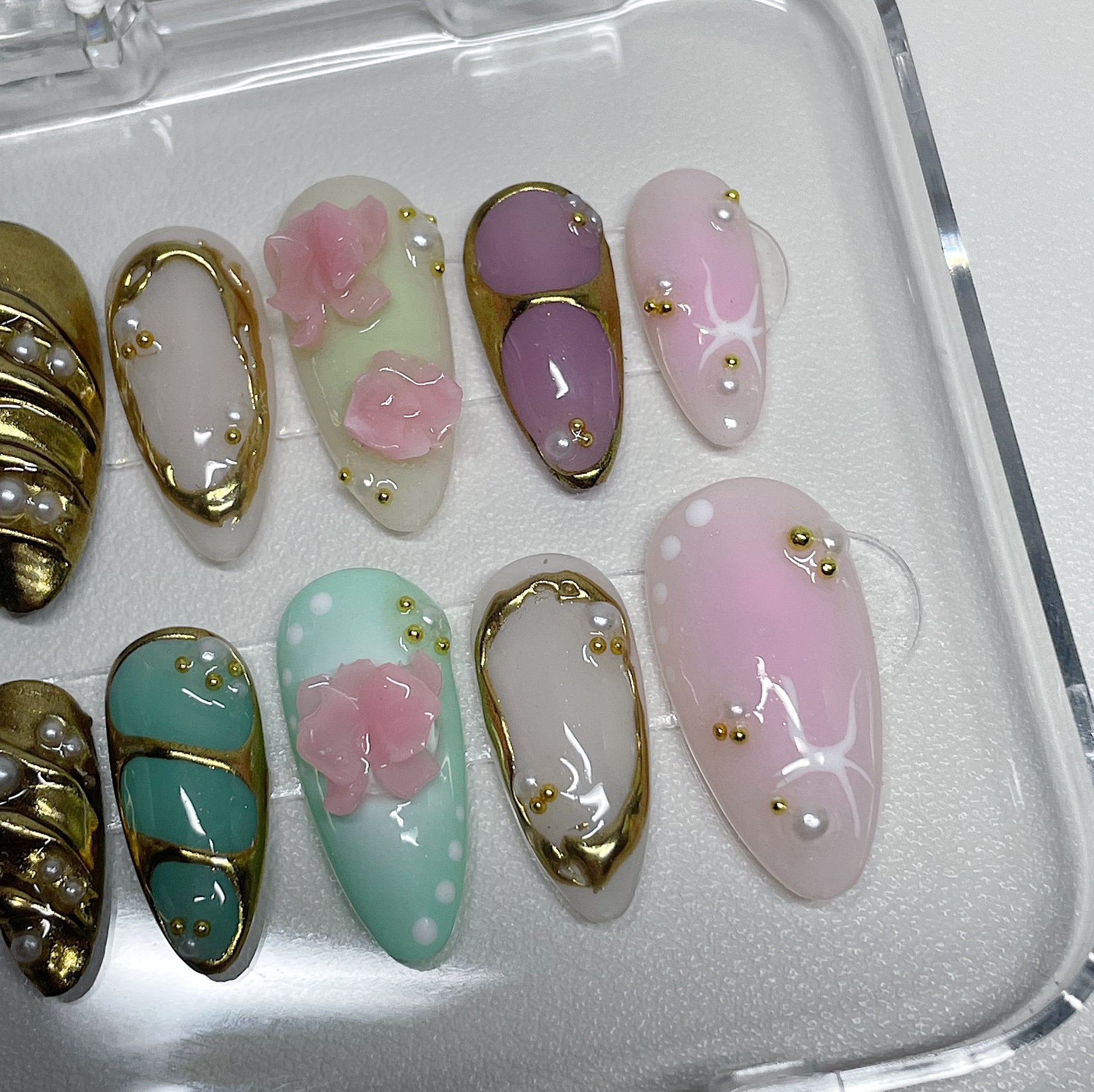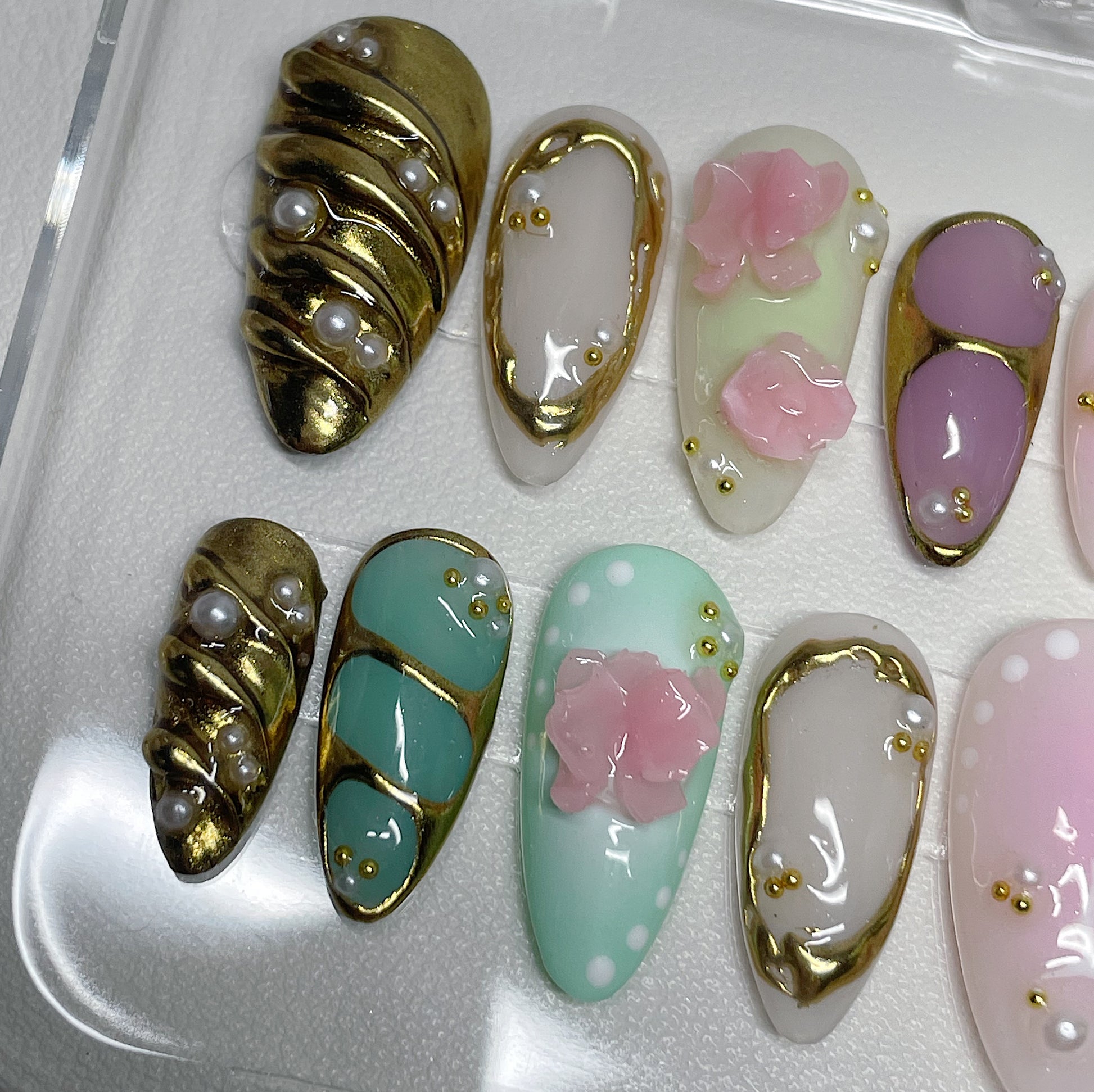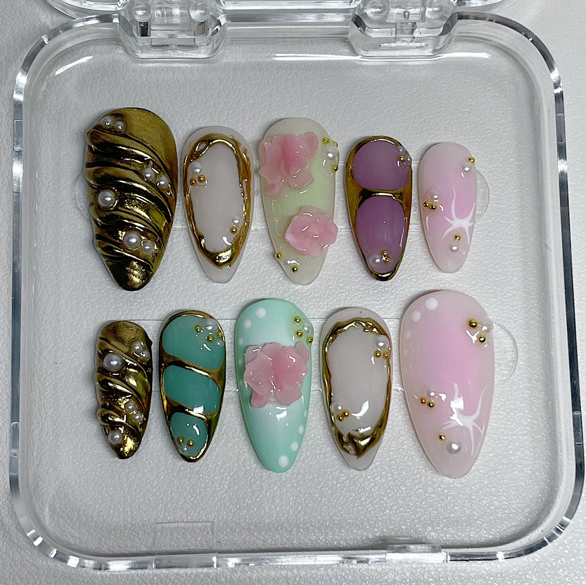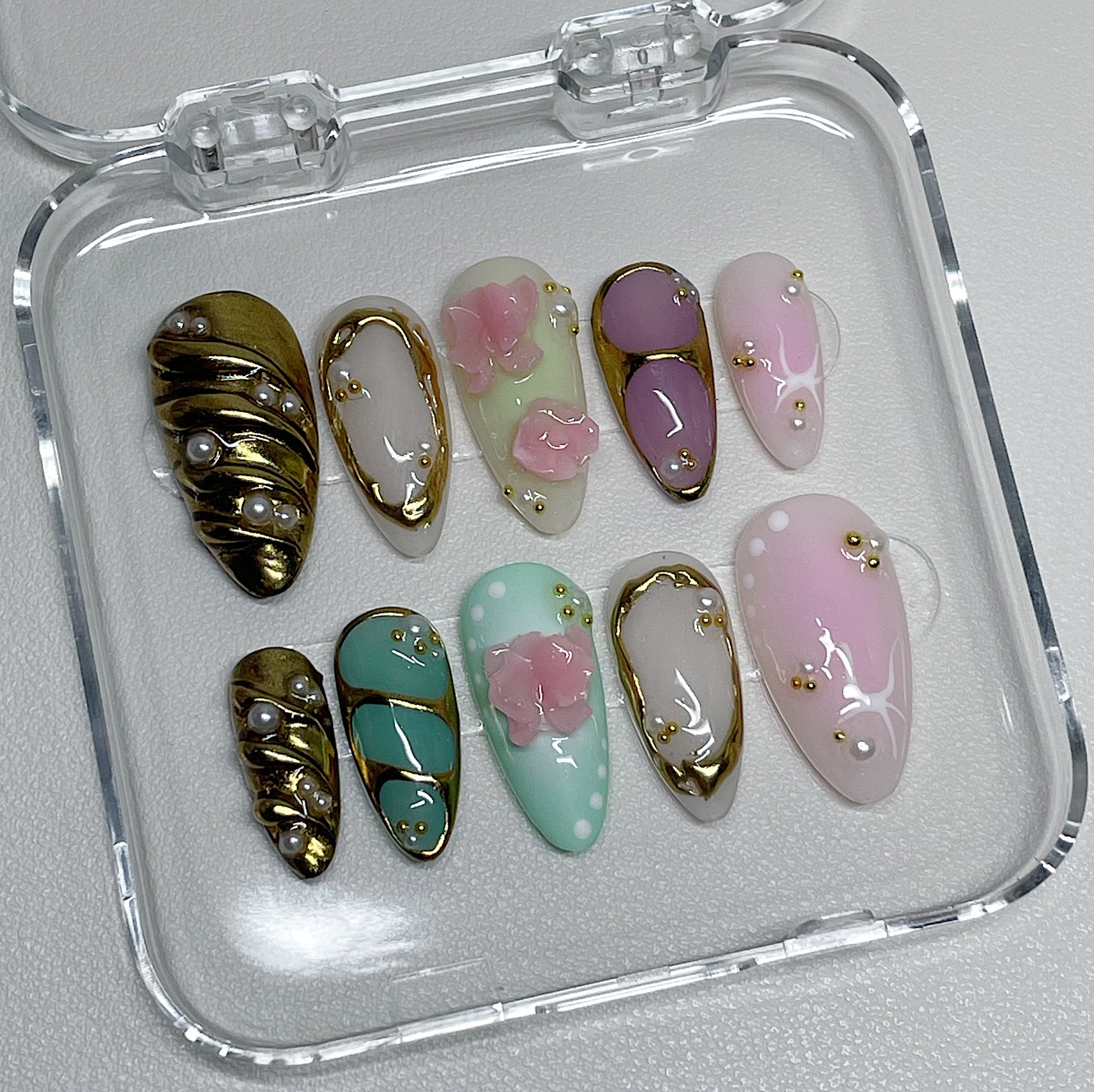 Your pressie set comes with 10 reusable press on nails as pictured, instructions on how to apply and remove your pressies, and an application kit containing everything you need for a seamless application!