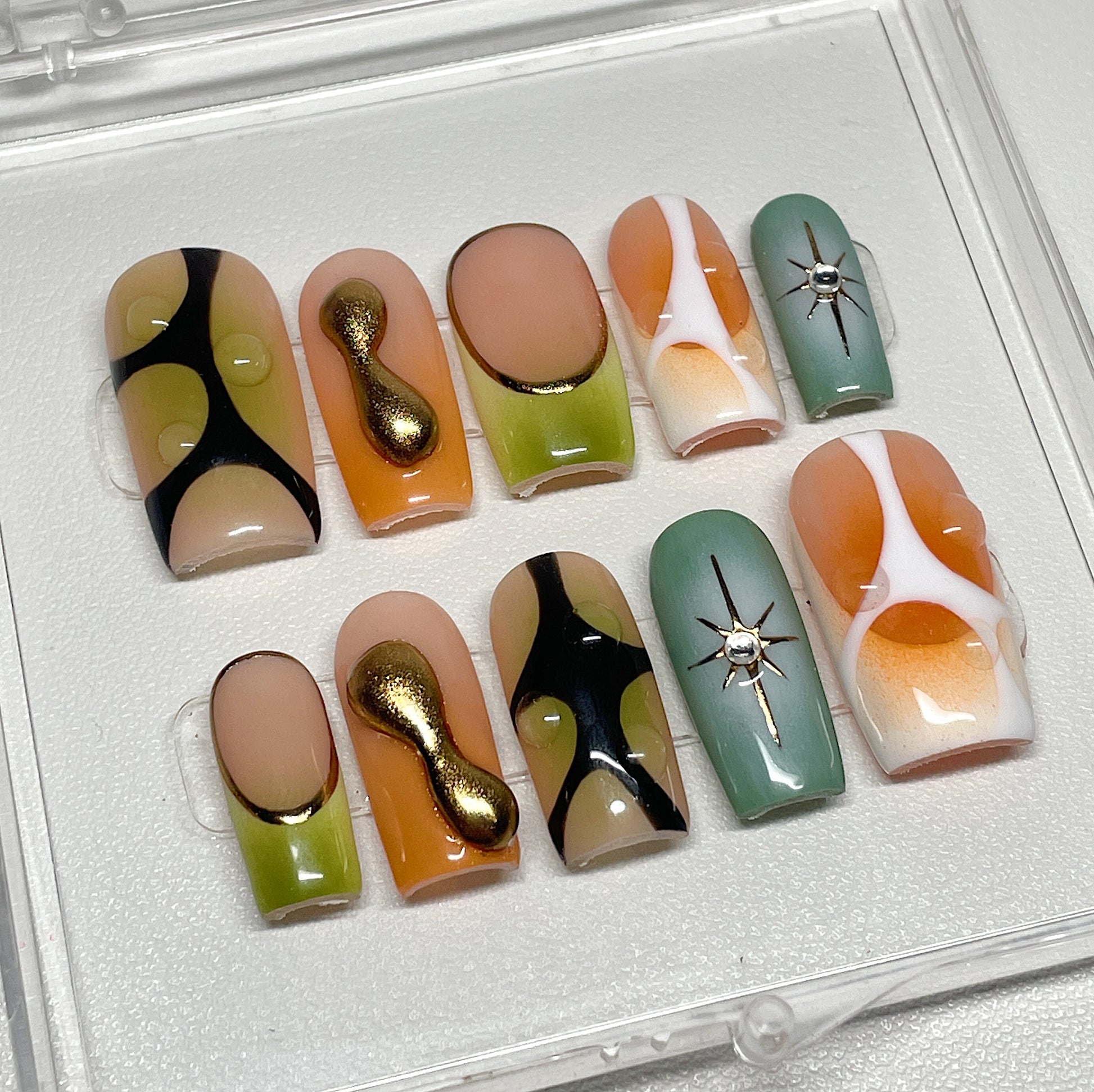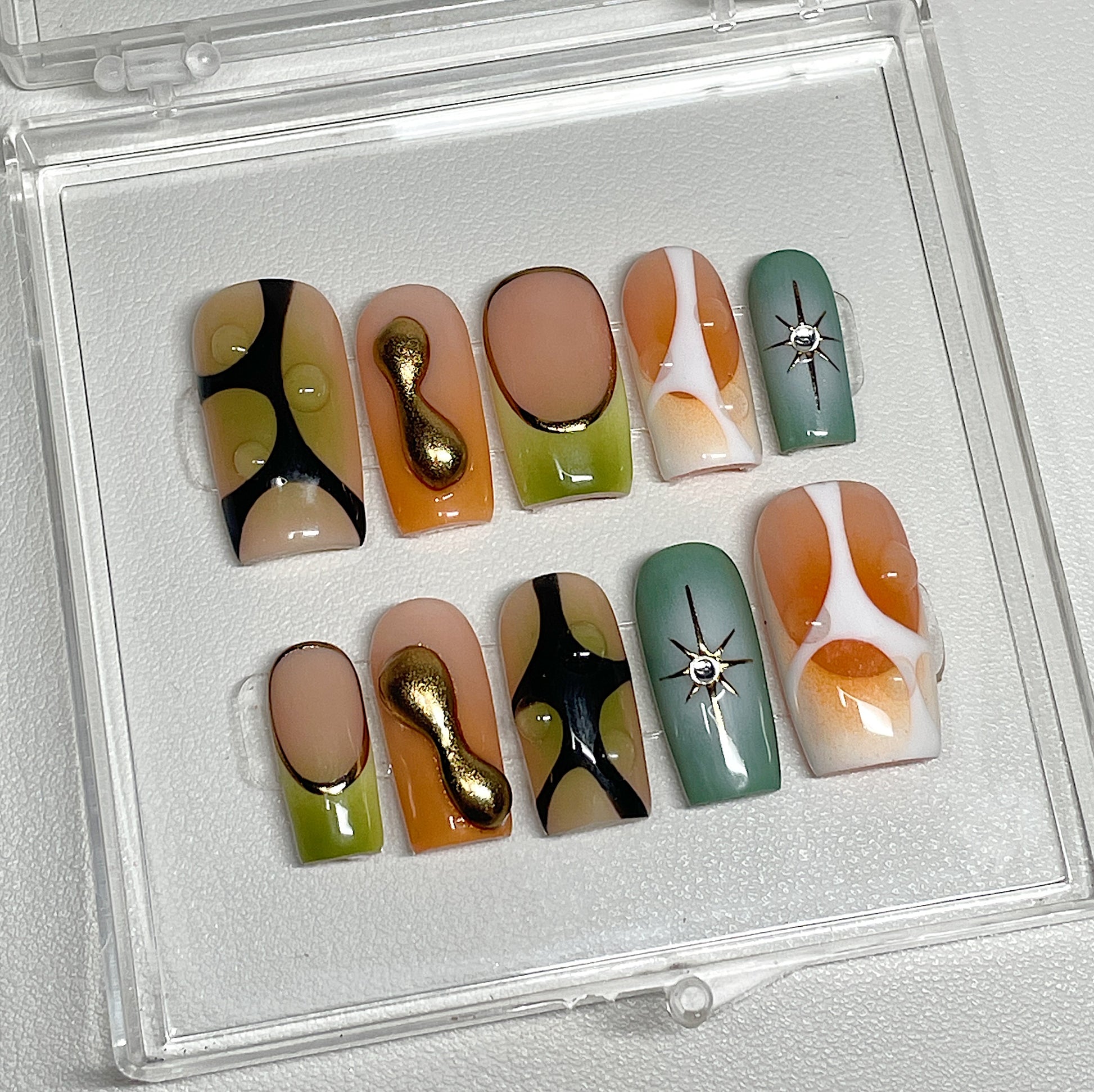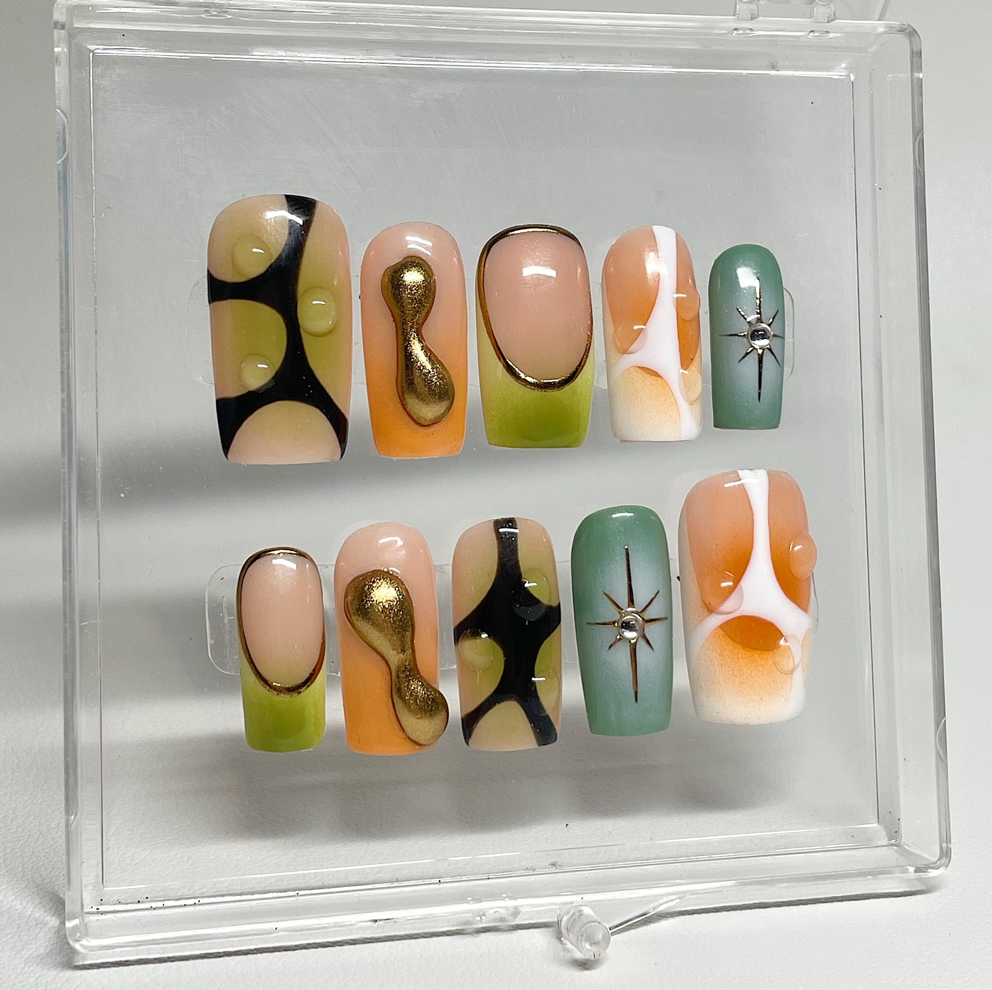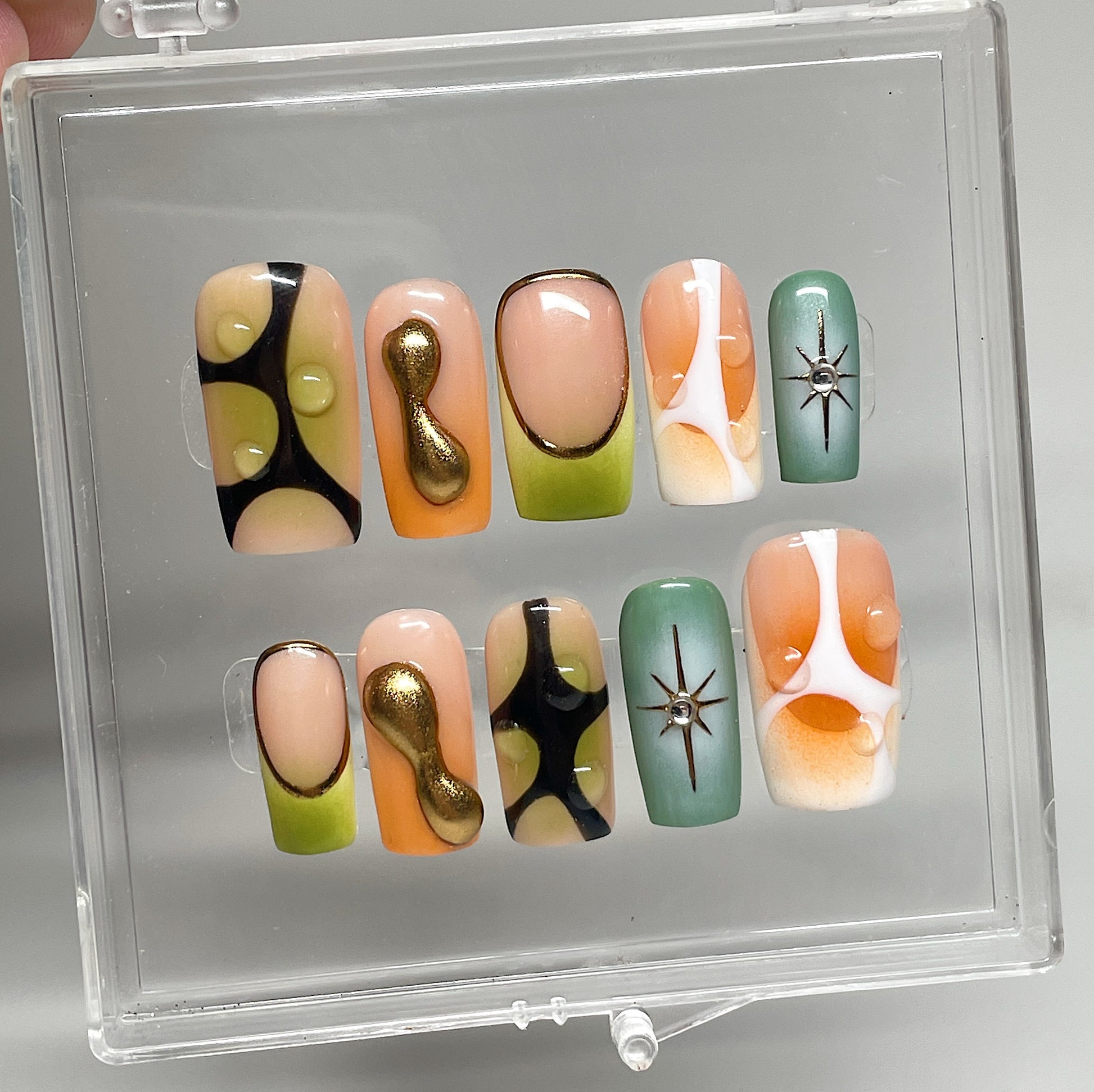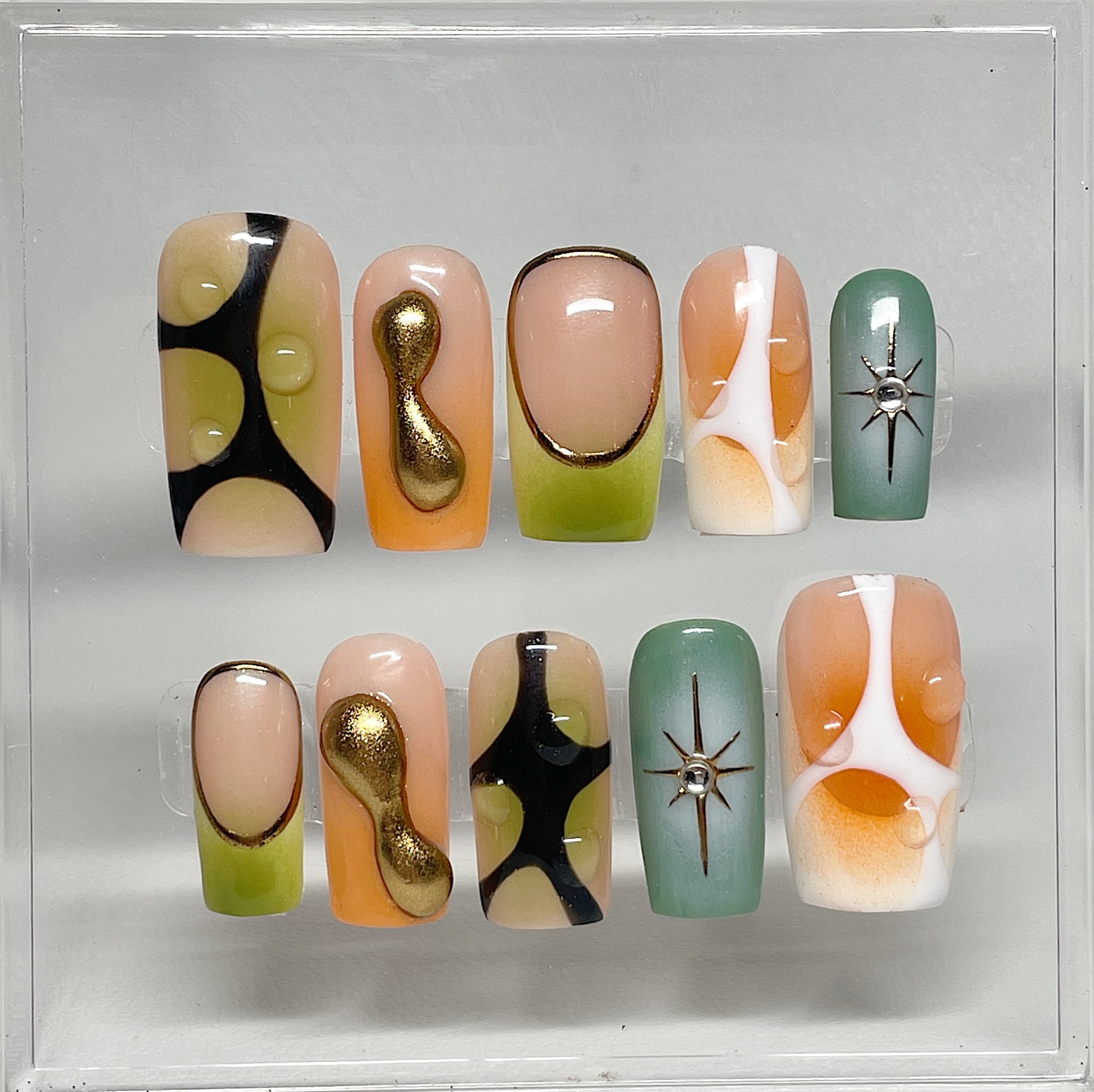 Your pressie set comes with 10 reusable press on nails as pictured, instructions on how to apply and remove your pressies, and an application kit containing everything you need for a seamless application!