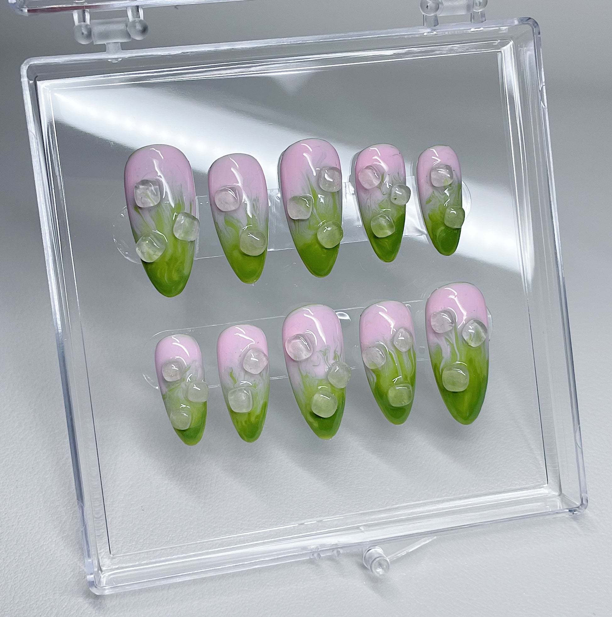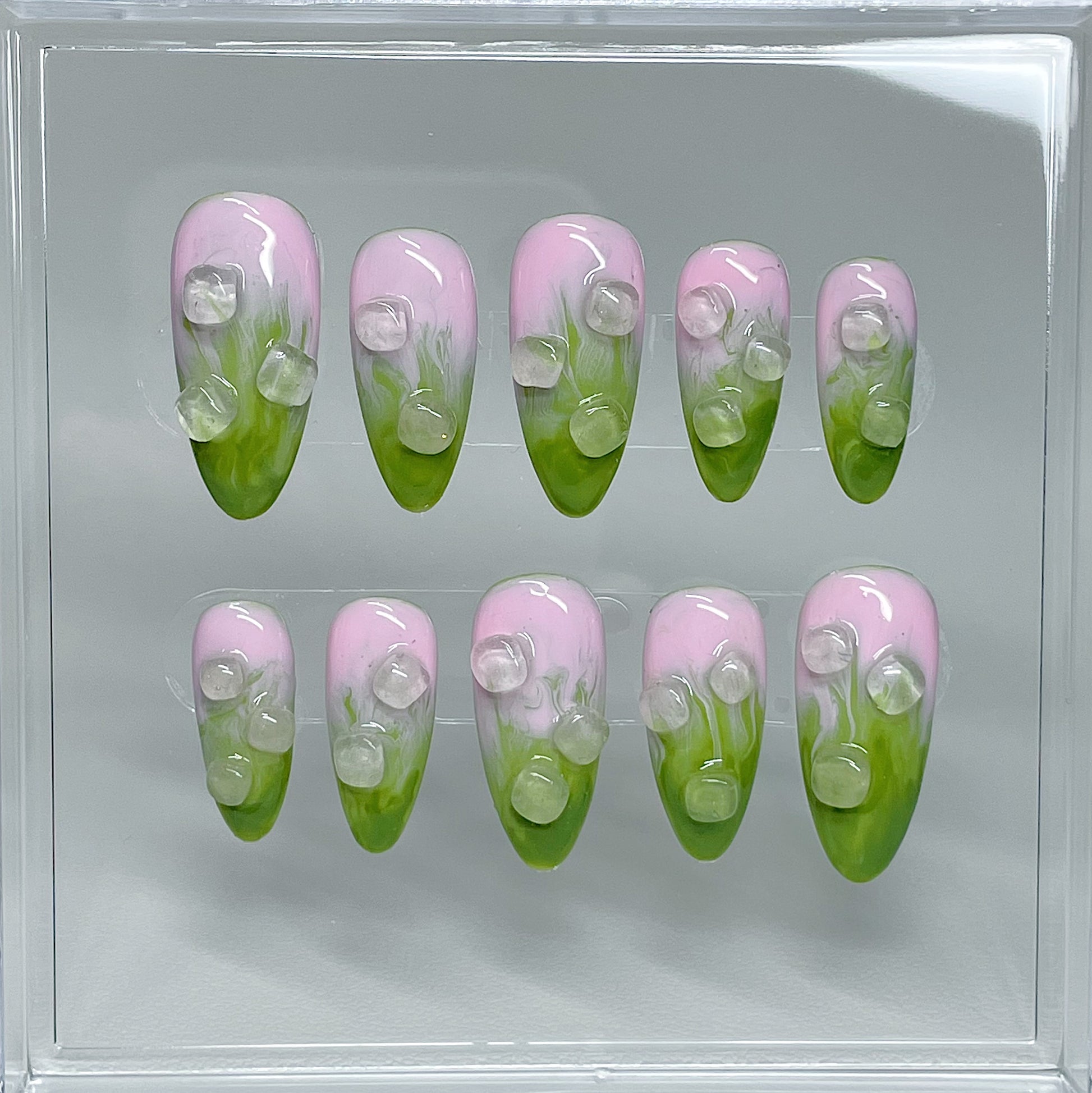 Your pressie set comes with 10 reusable press on nails as pictured, instructions on how to apply and remove your pressies, and an application kit containing everything you need for a seamless application!
