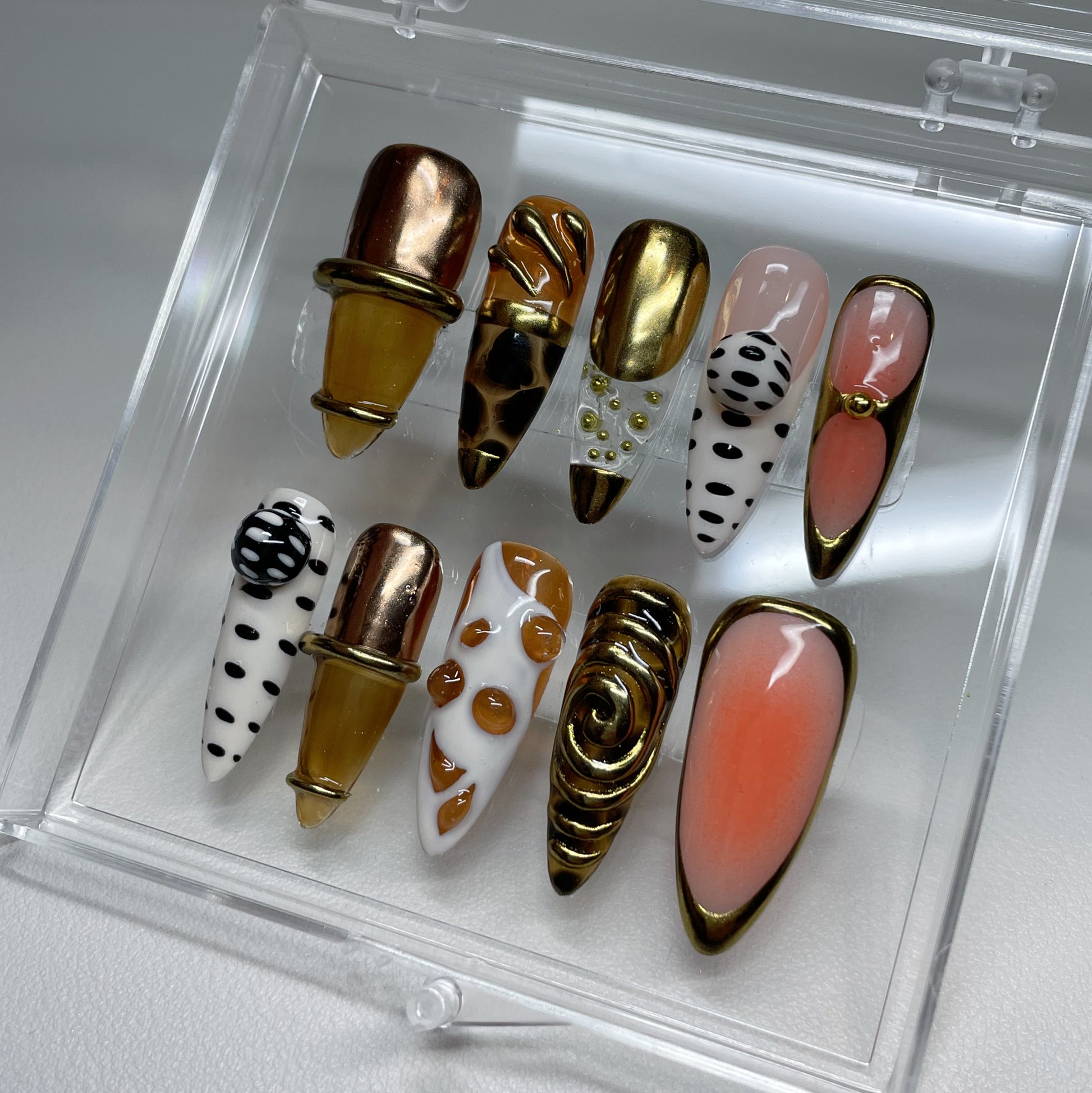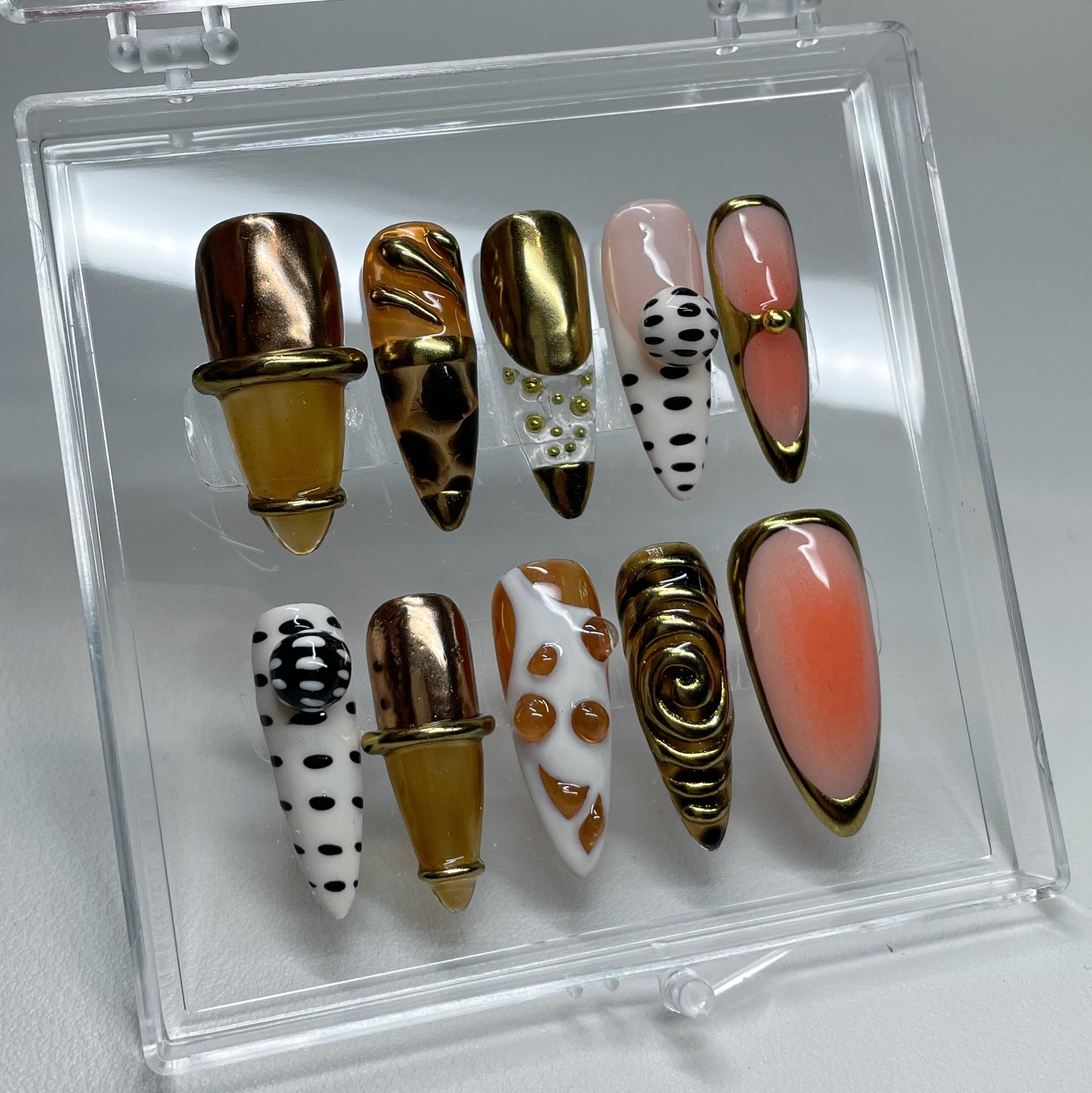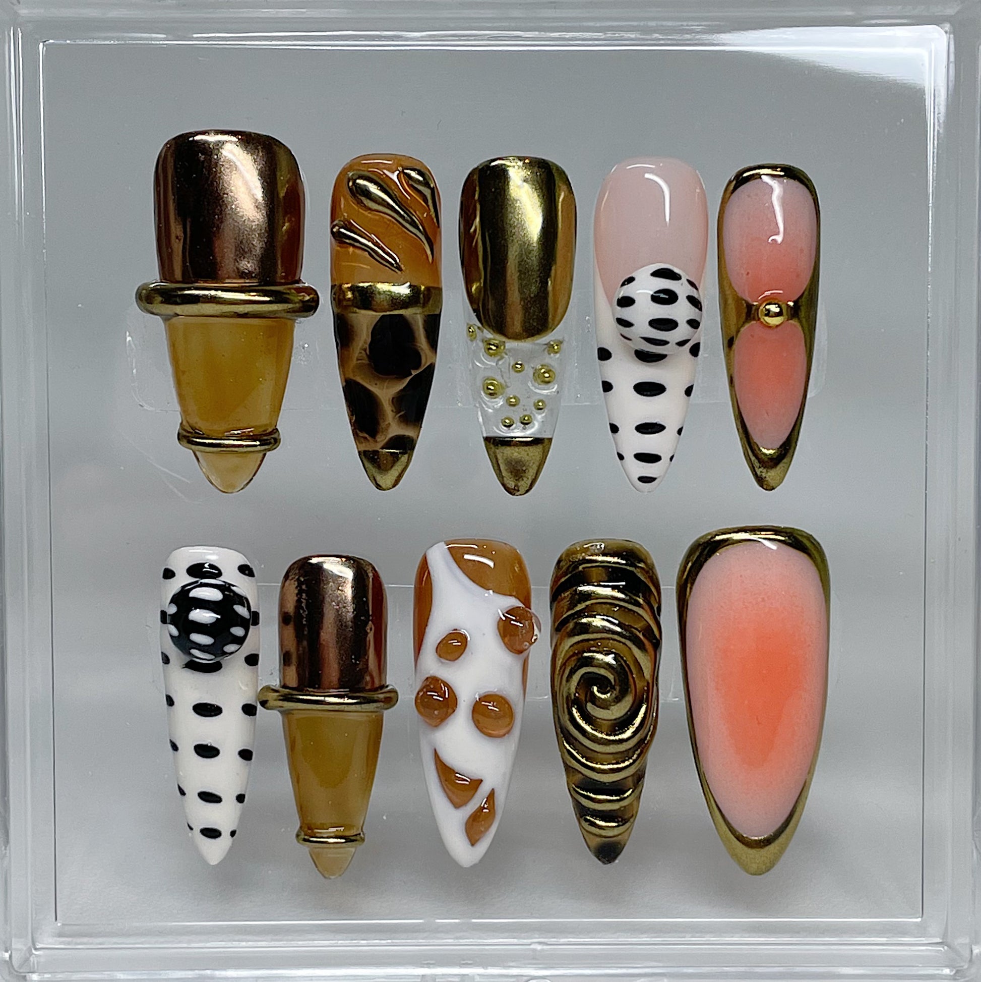 Your pressie set comes with 10 reusable press on nails as pictured, instructions on how to apply and remove your pressies, and an application kit containing everything you need for a seamless application!