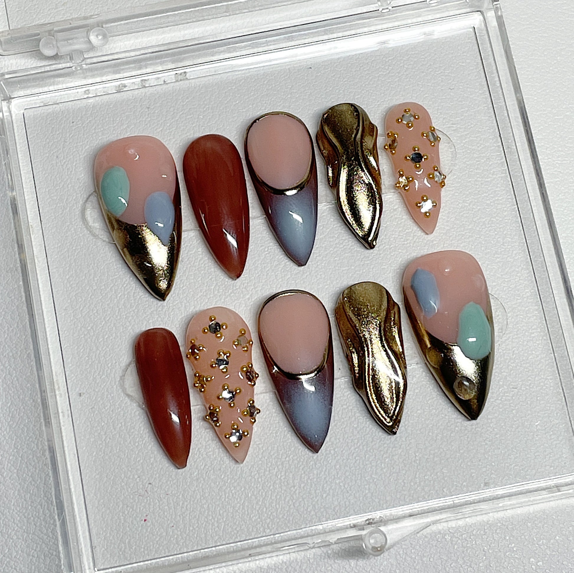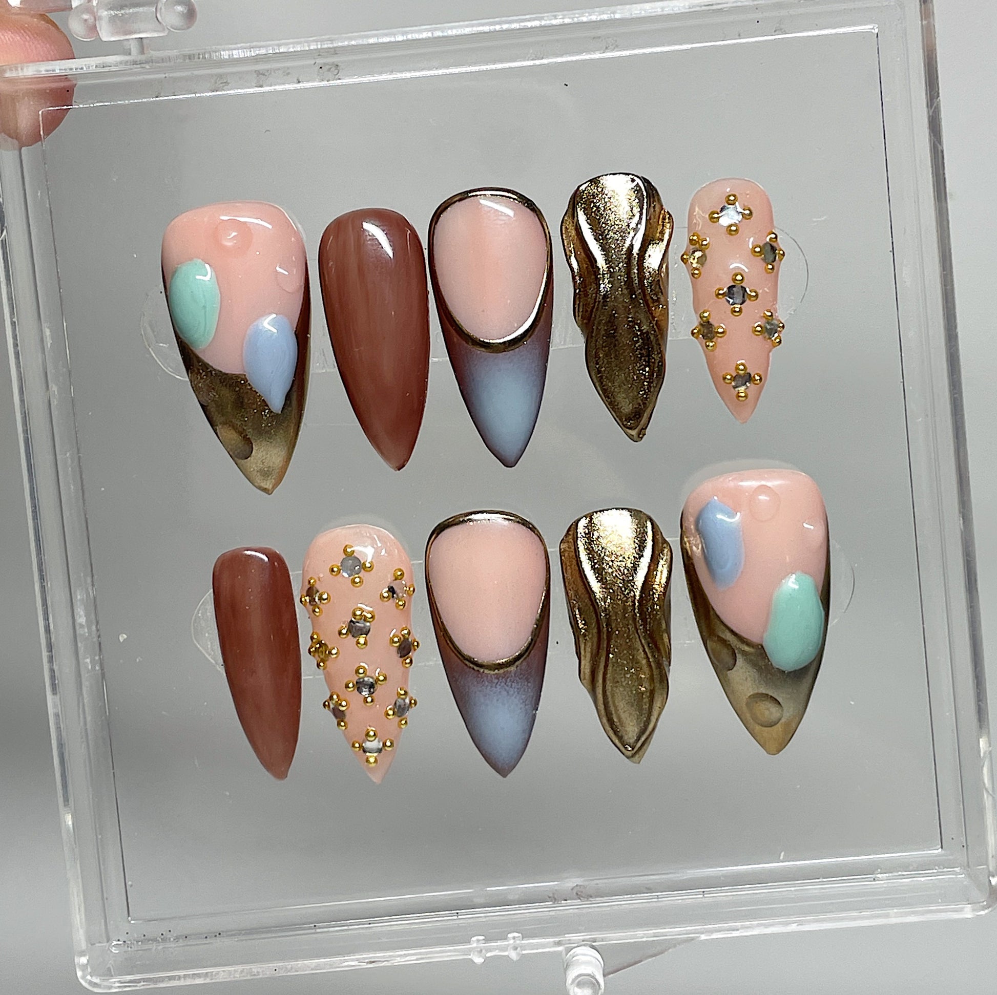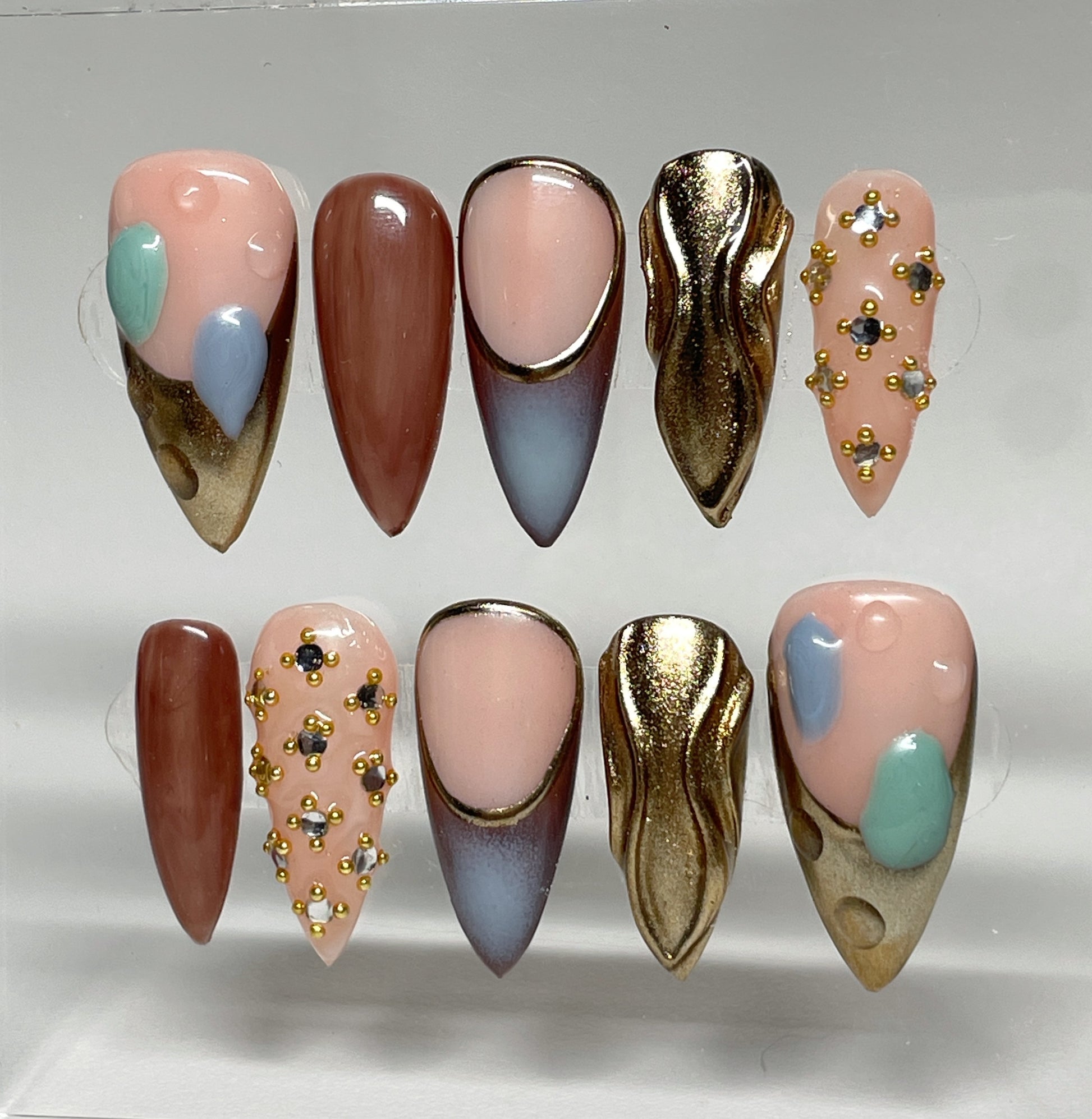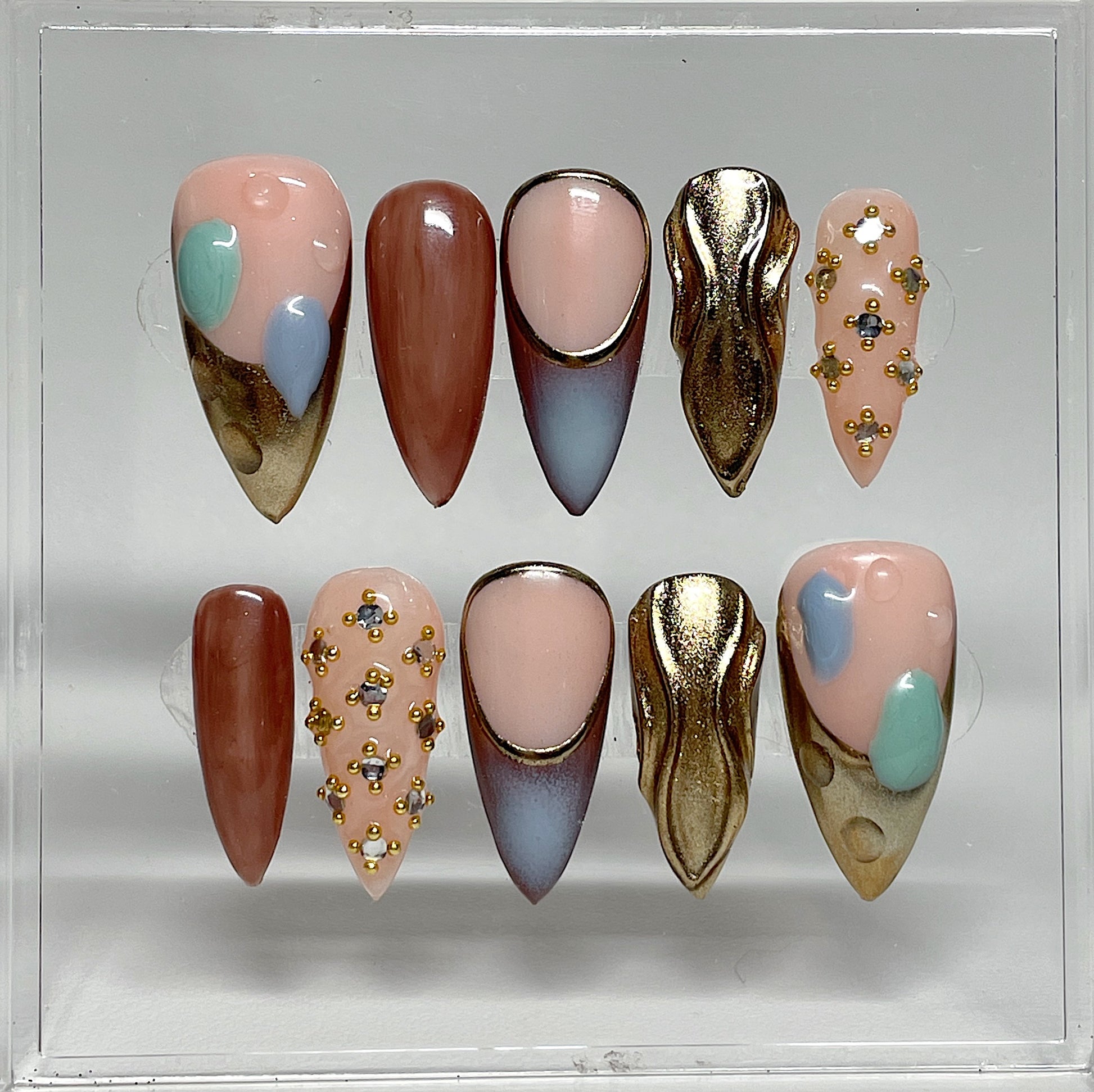 Your pressie set comes with 10 reusable press on nails as pictured, instructions on how to apply and remove your pressies, and an application kit containing everything you need for a seamless application!