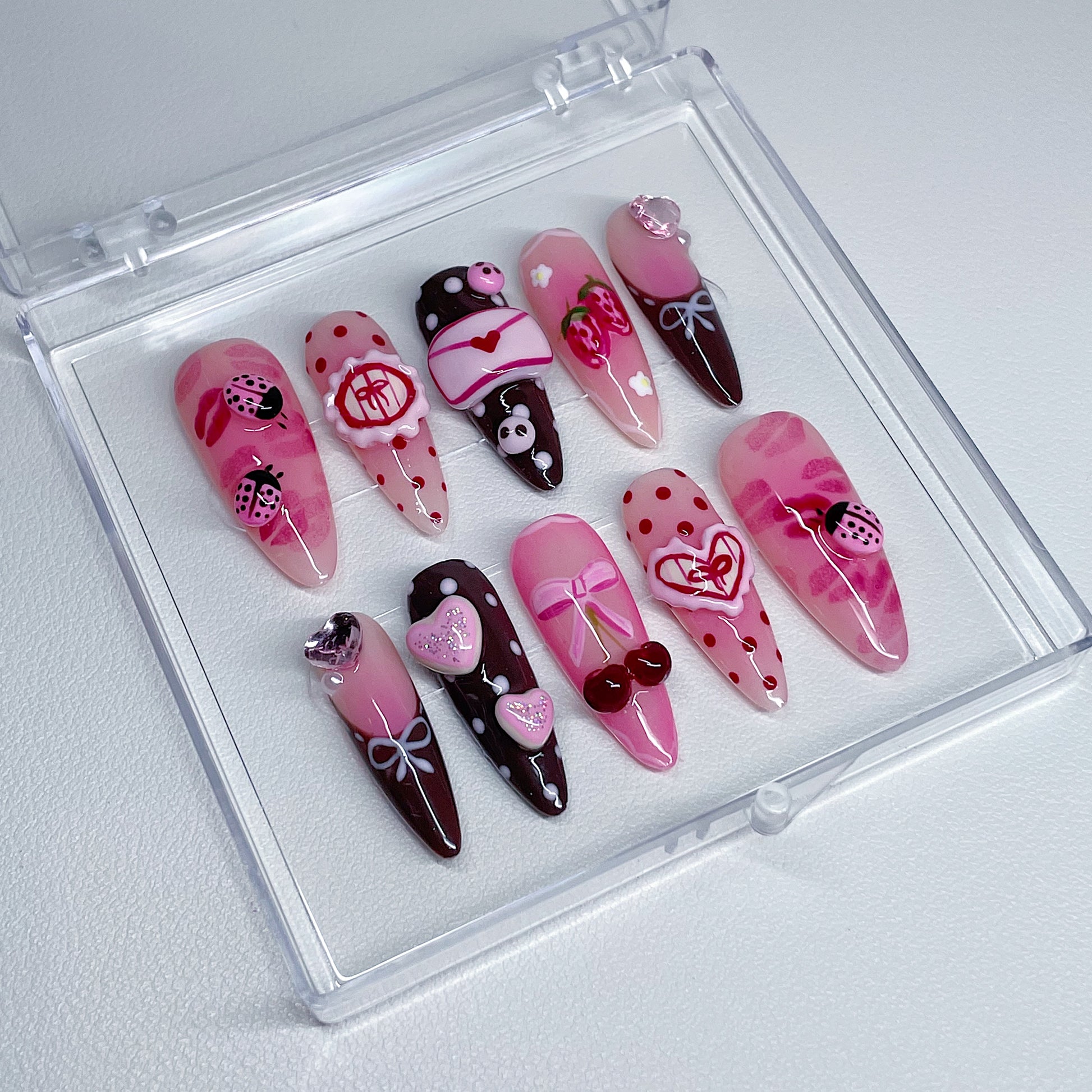Your pressie set comes with 10 reusable press on nails as pictured, instructions on how to apply and remove your pressies, and an application kit containing everything you need for a seamless application!