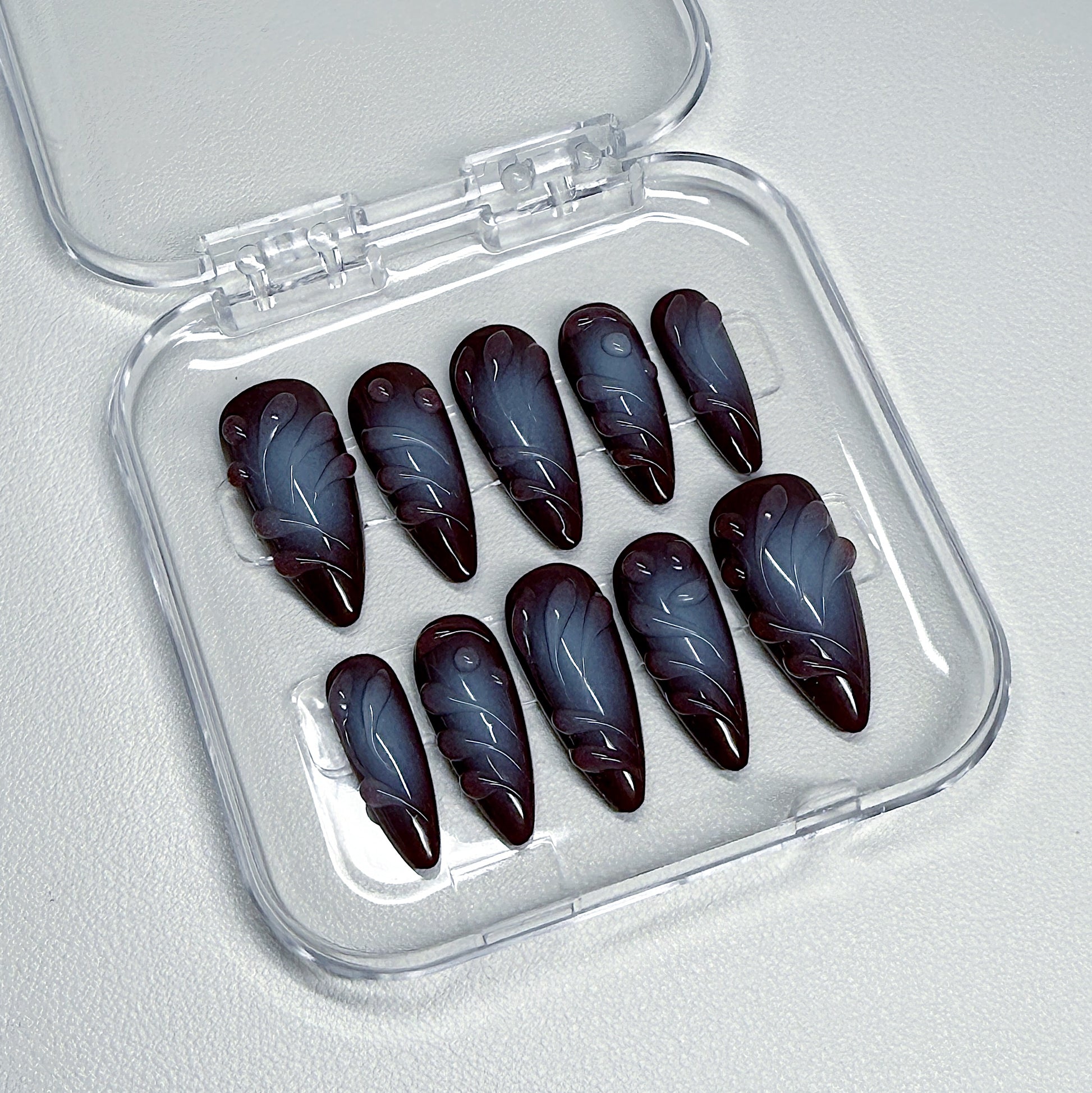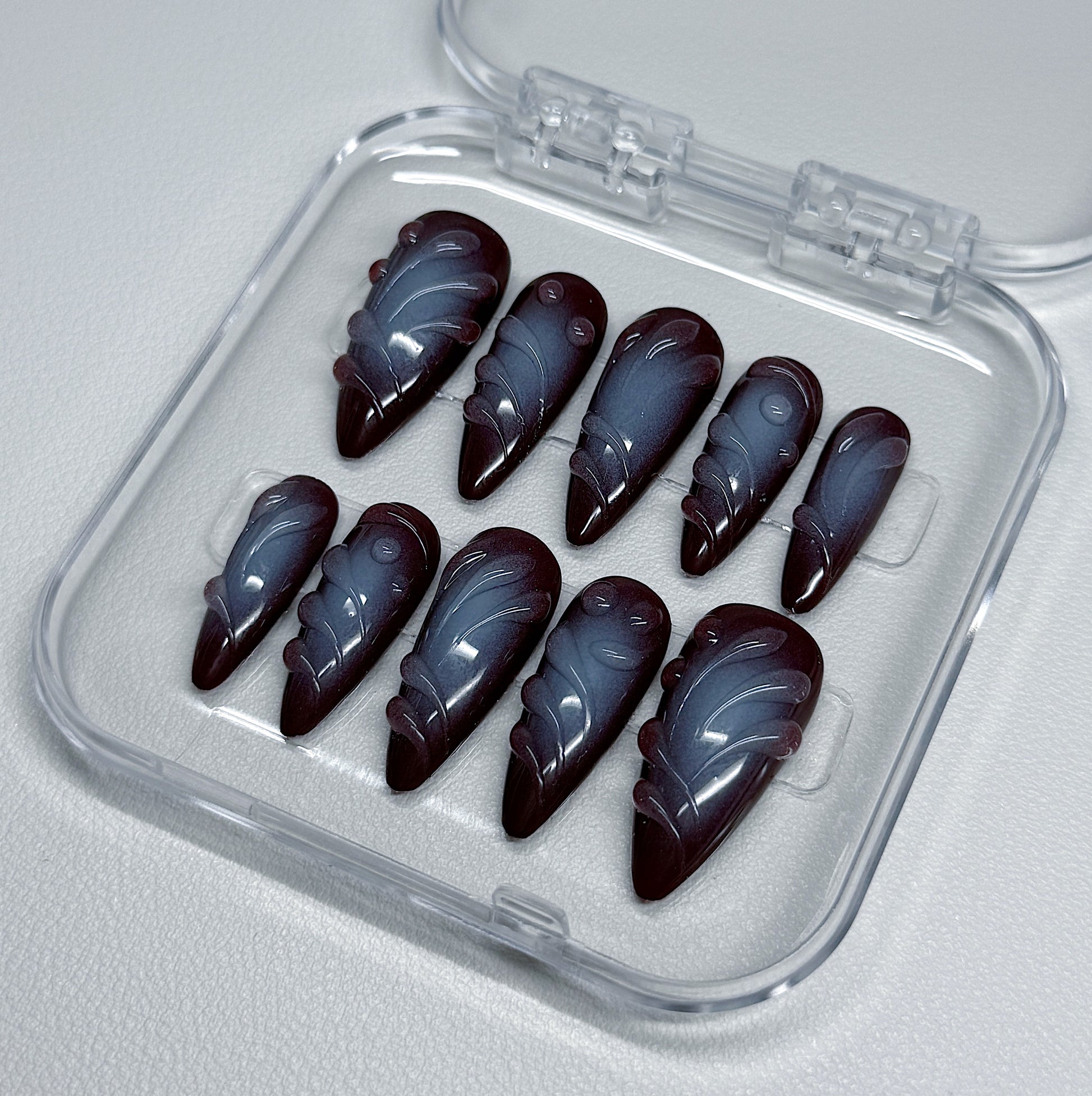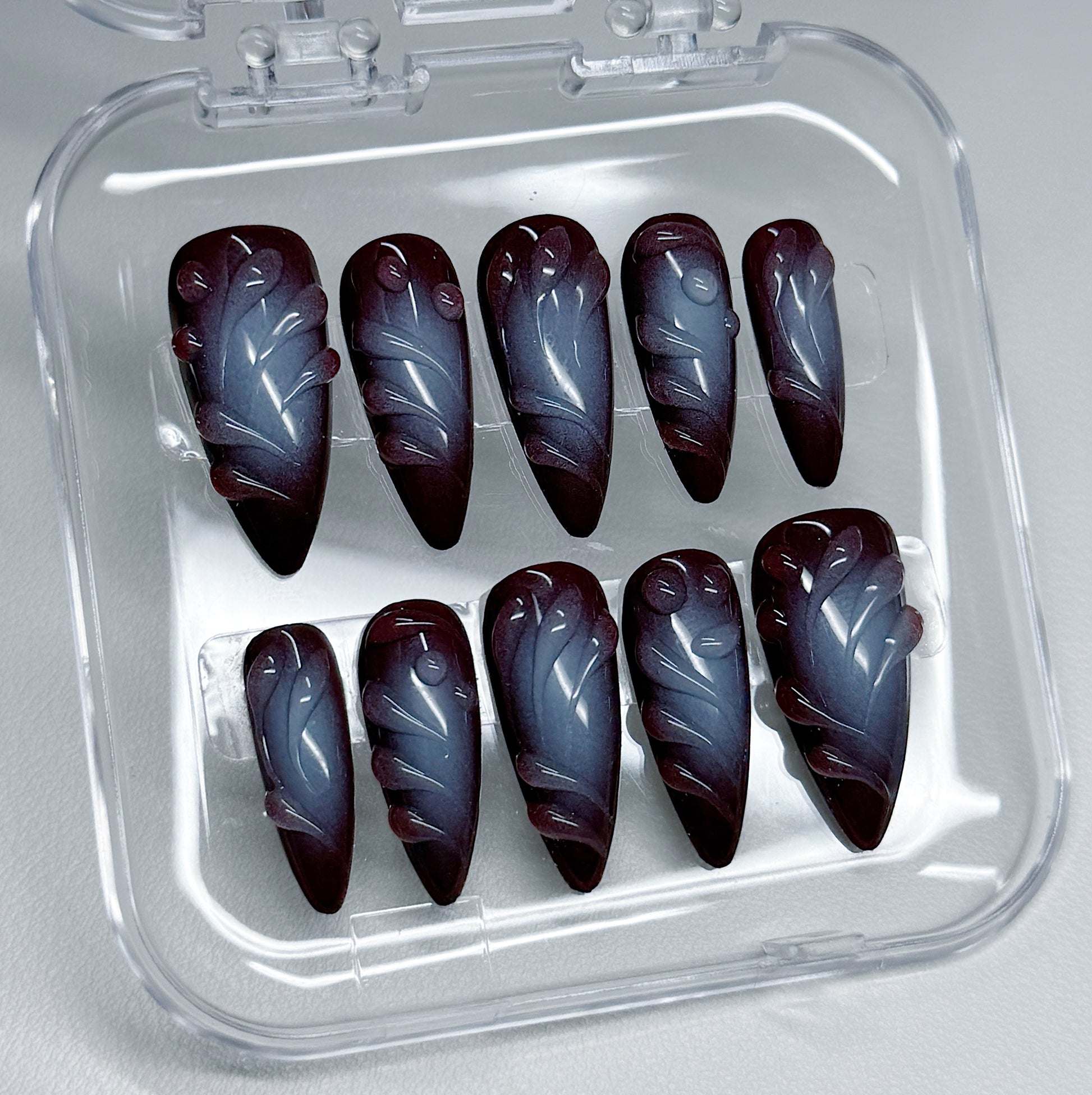 Your pressie set comes with 10 reusable press on nails as pictured, instructions on how to apply and remove your pressies, and an application kit containing everything you need for a seamless application!