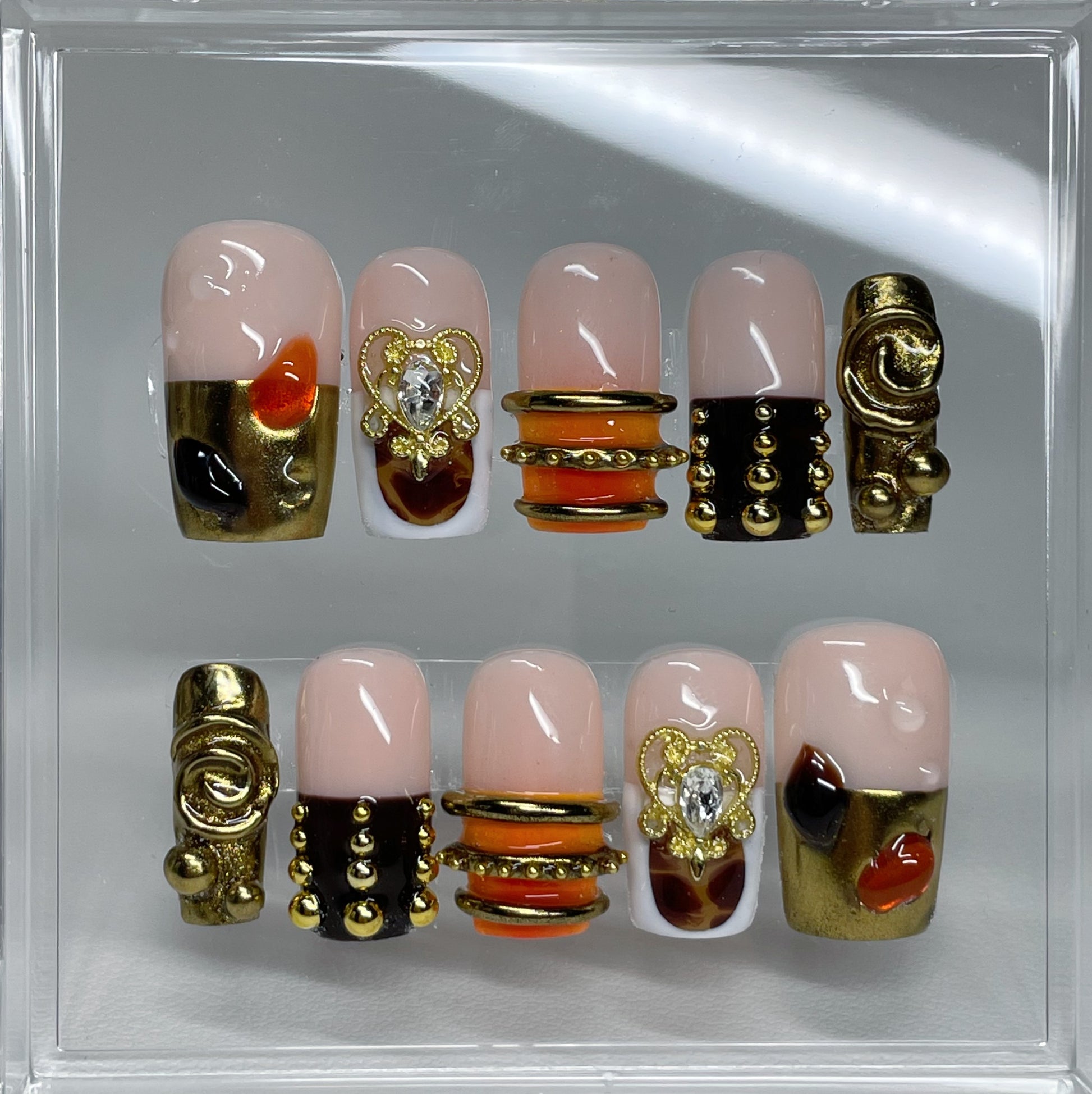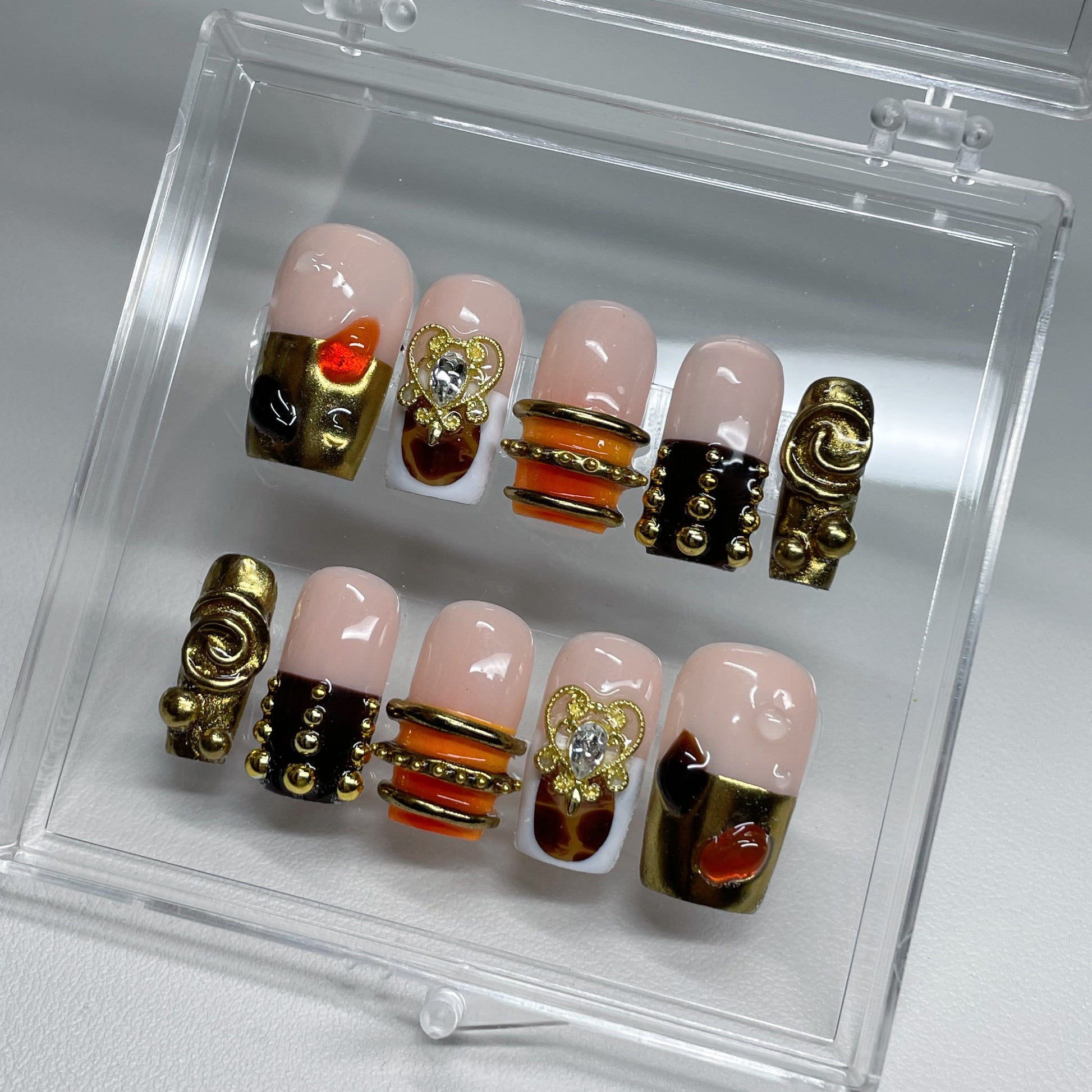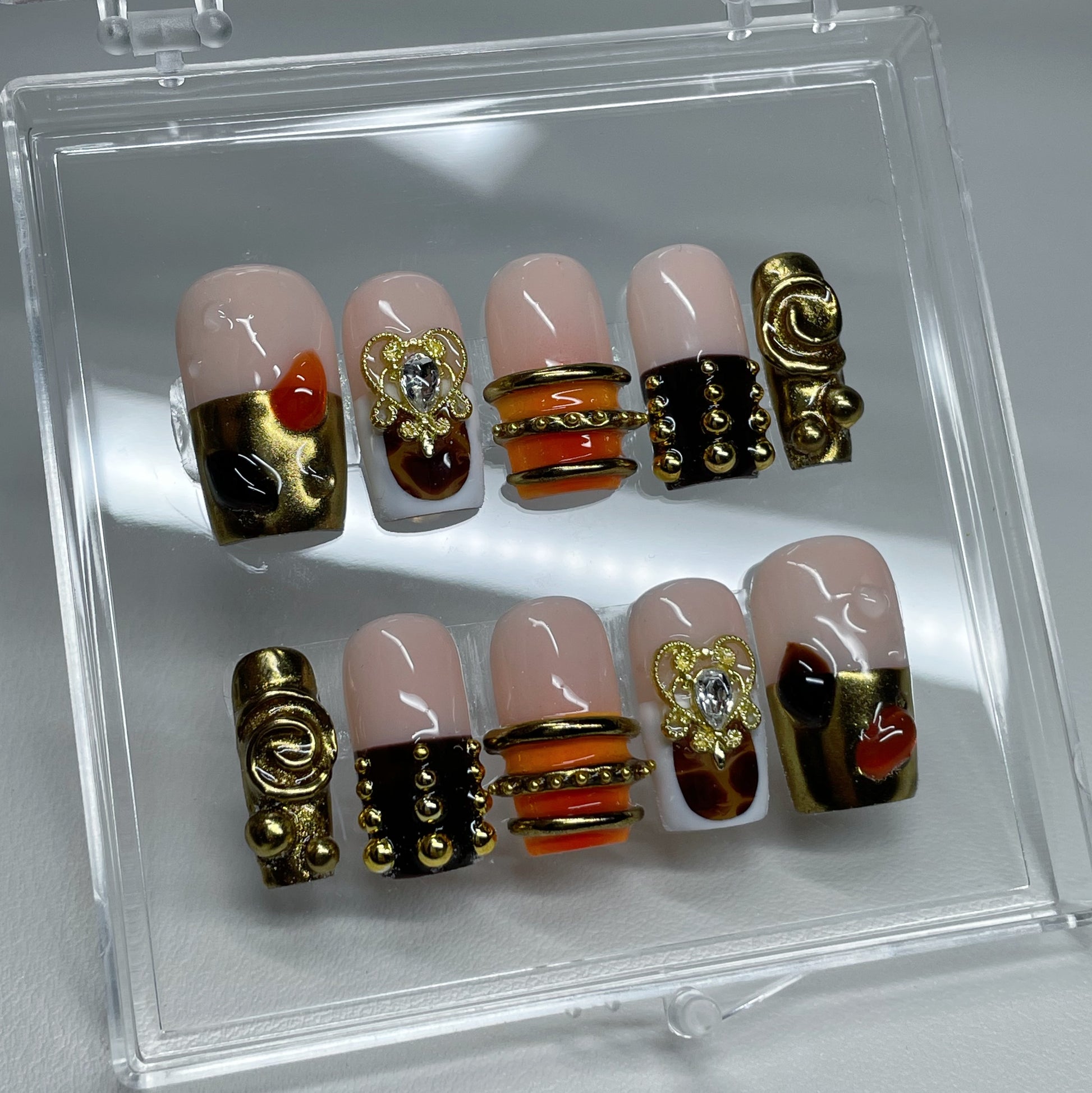 Your pressie set comes with 10 reusable press on nails as pictured, instructions on how to apply and remove your pressies, and an application kit containing everything you need for a seamless application!