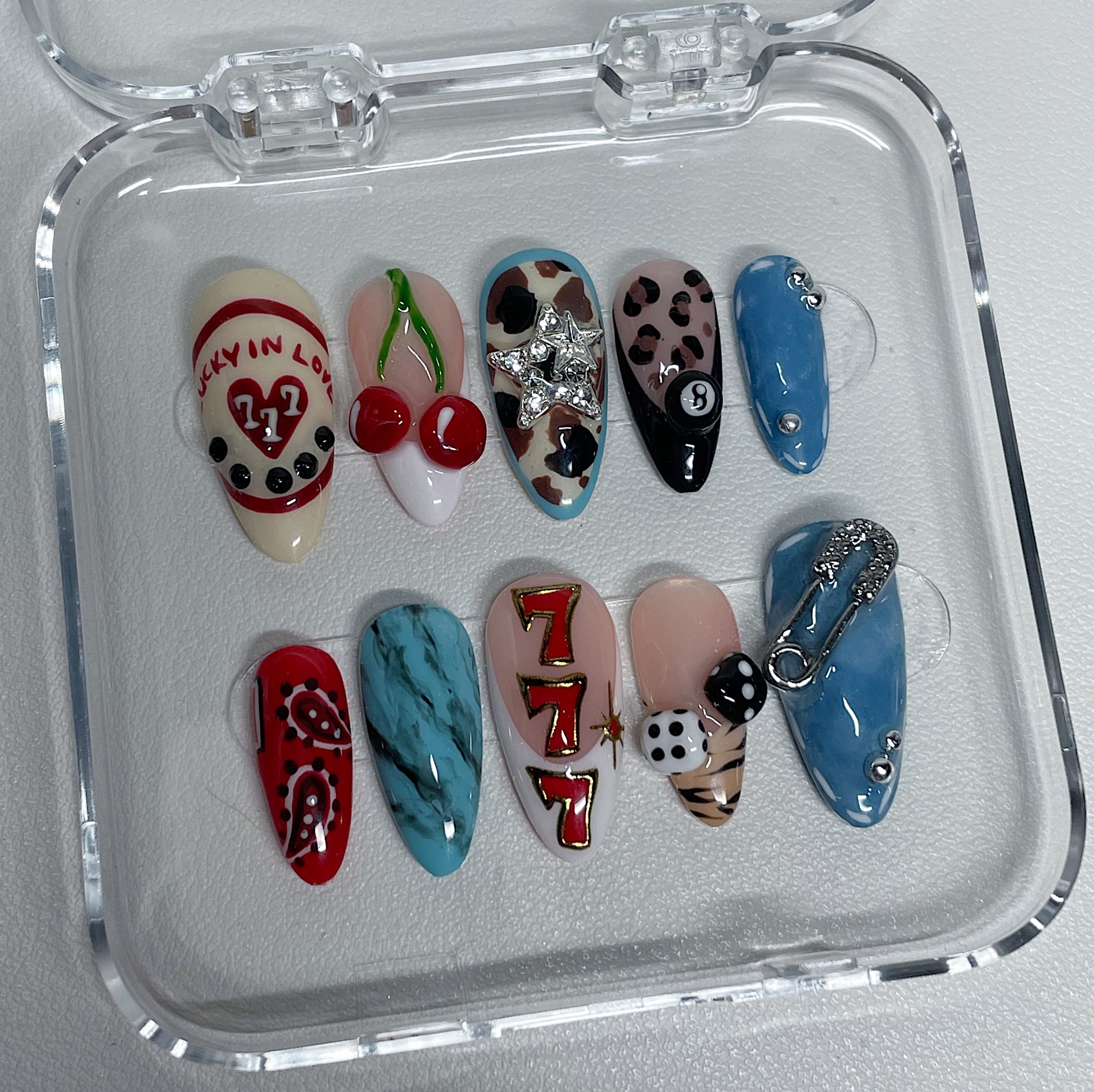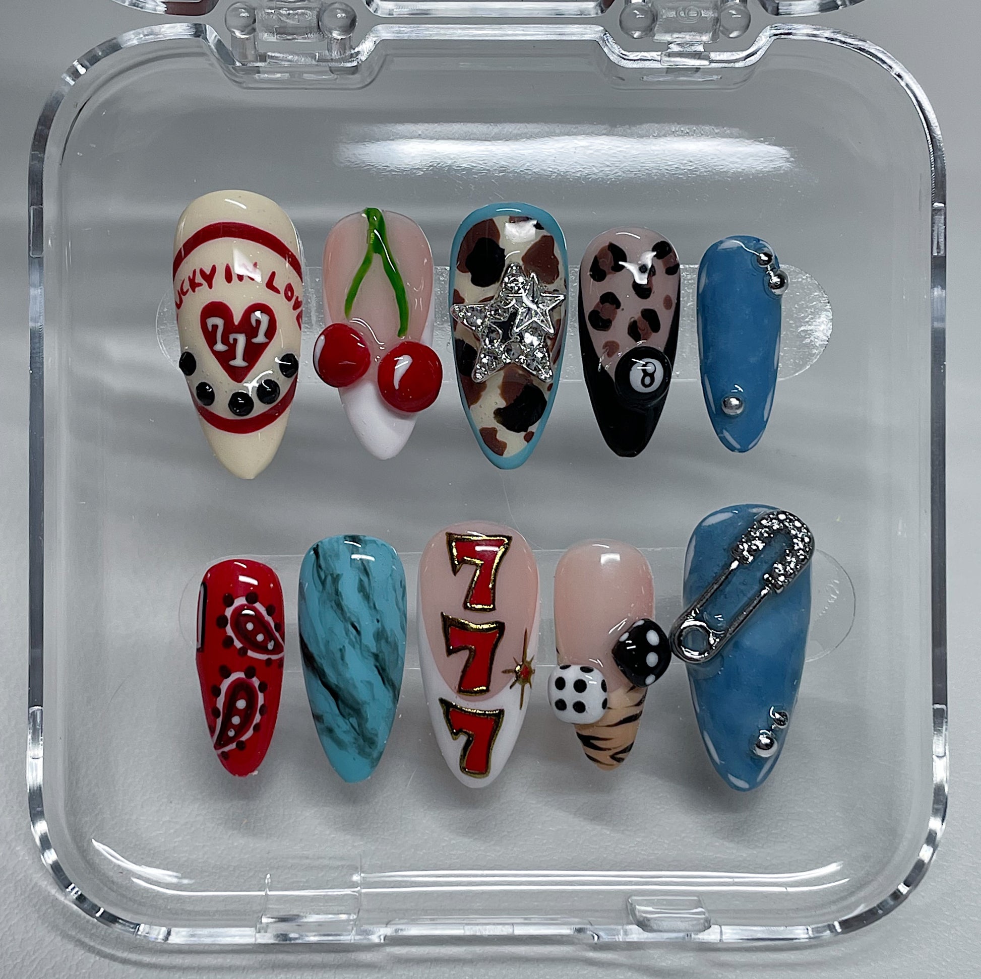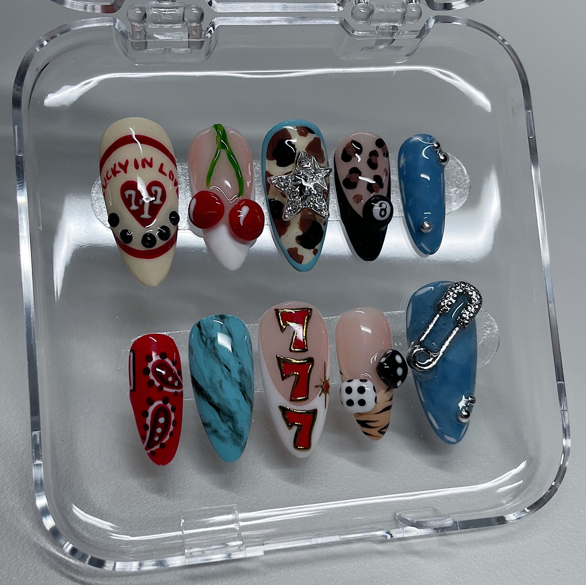Your pressie set comes with 10 reusable press on nails as pictured, instructions on how to apply and remove your pressies, and an application kit containing everything you need for a seamless application!
