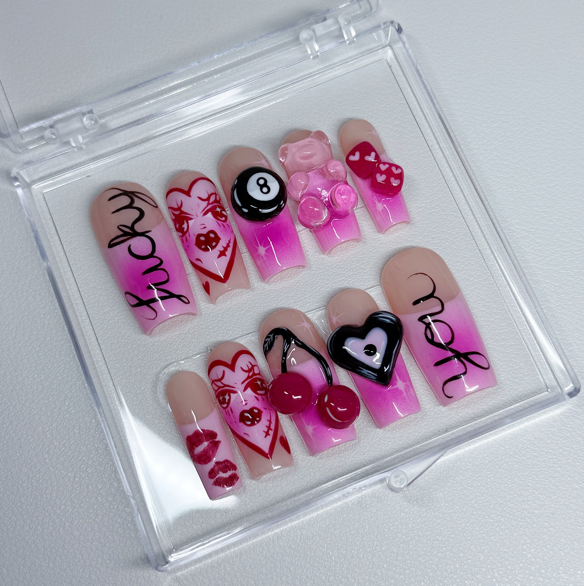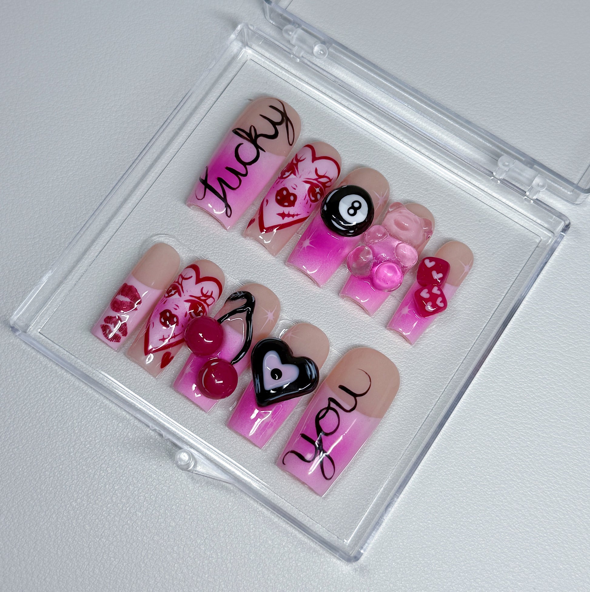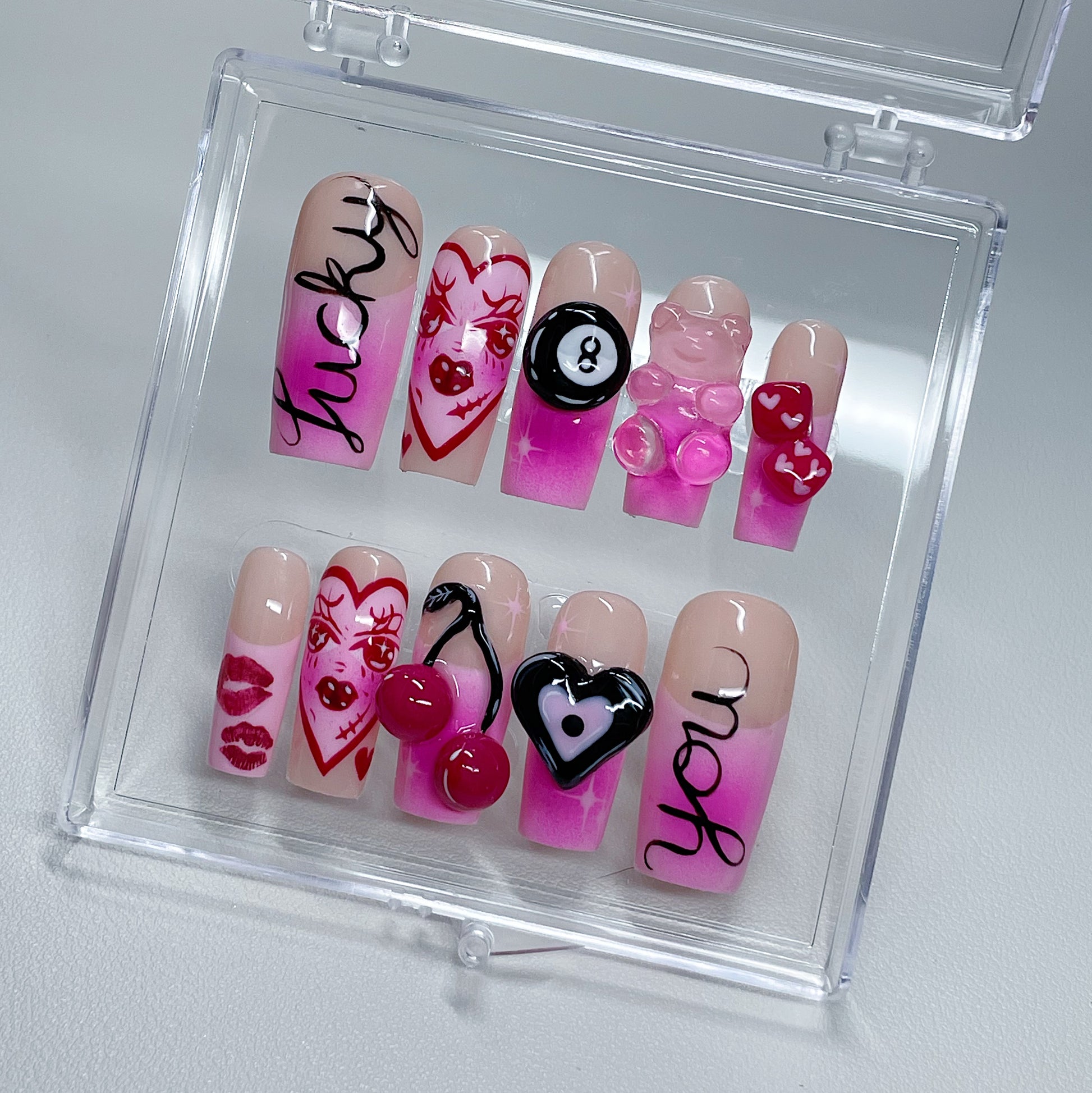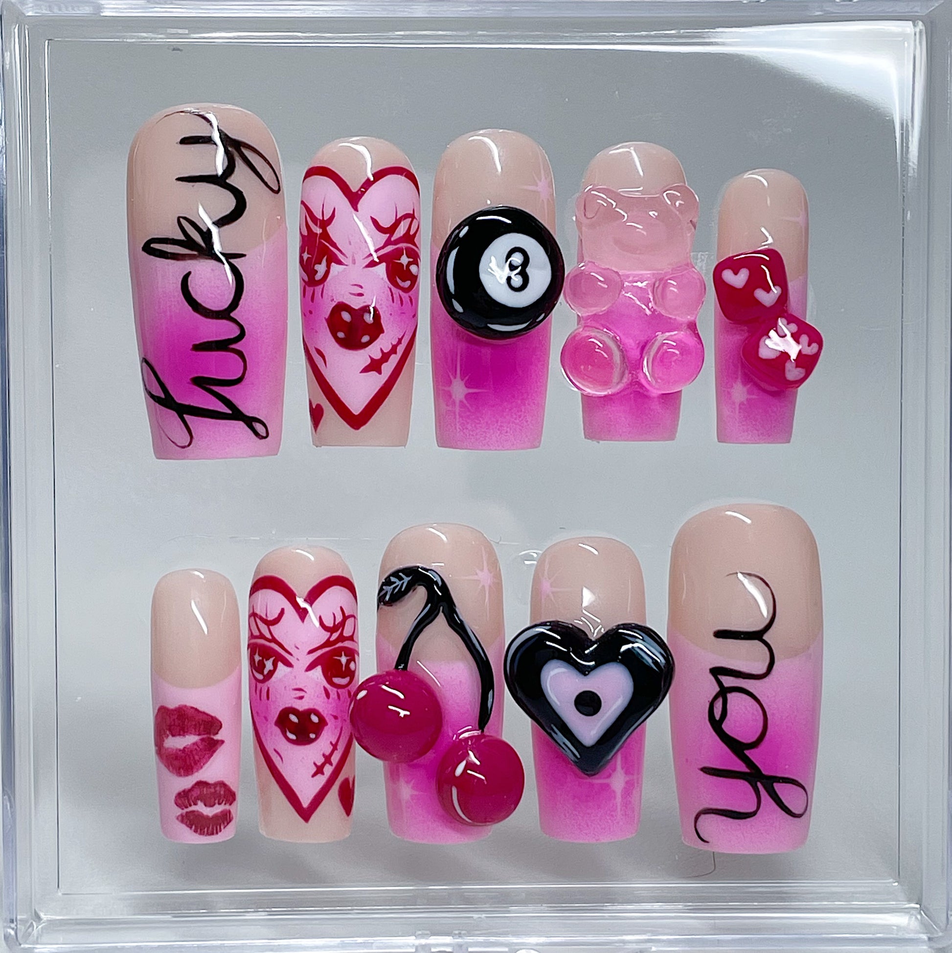 Your pressie set comes with 10 reusable press on nails as pictured, instructions on how to apply and remove your pressies, and an application kit containing everything you need for a seamless application!