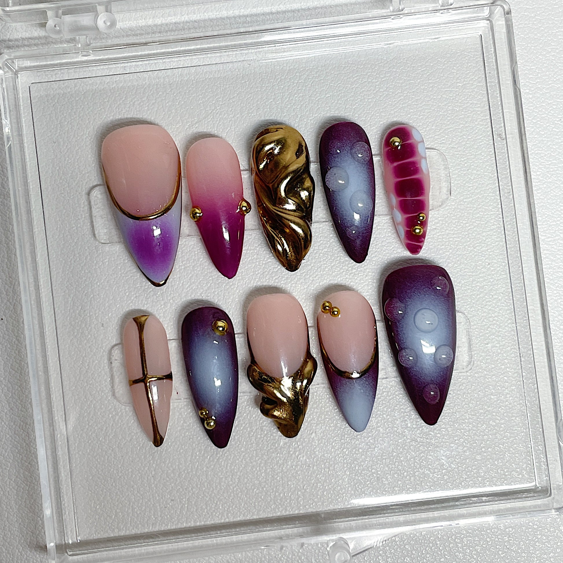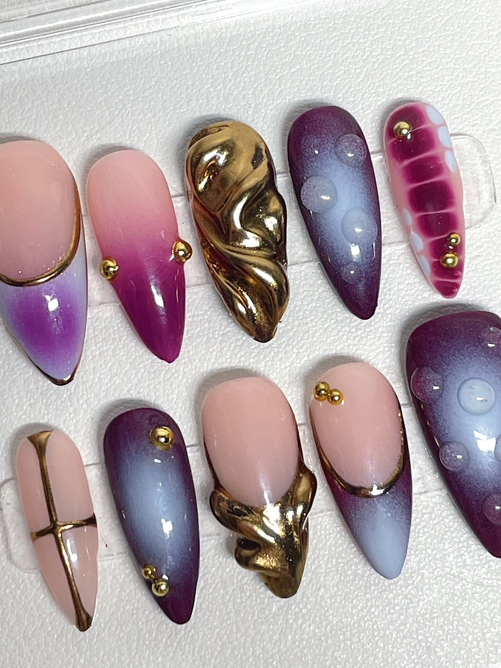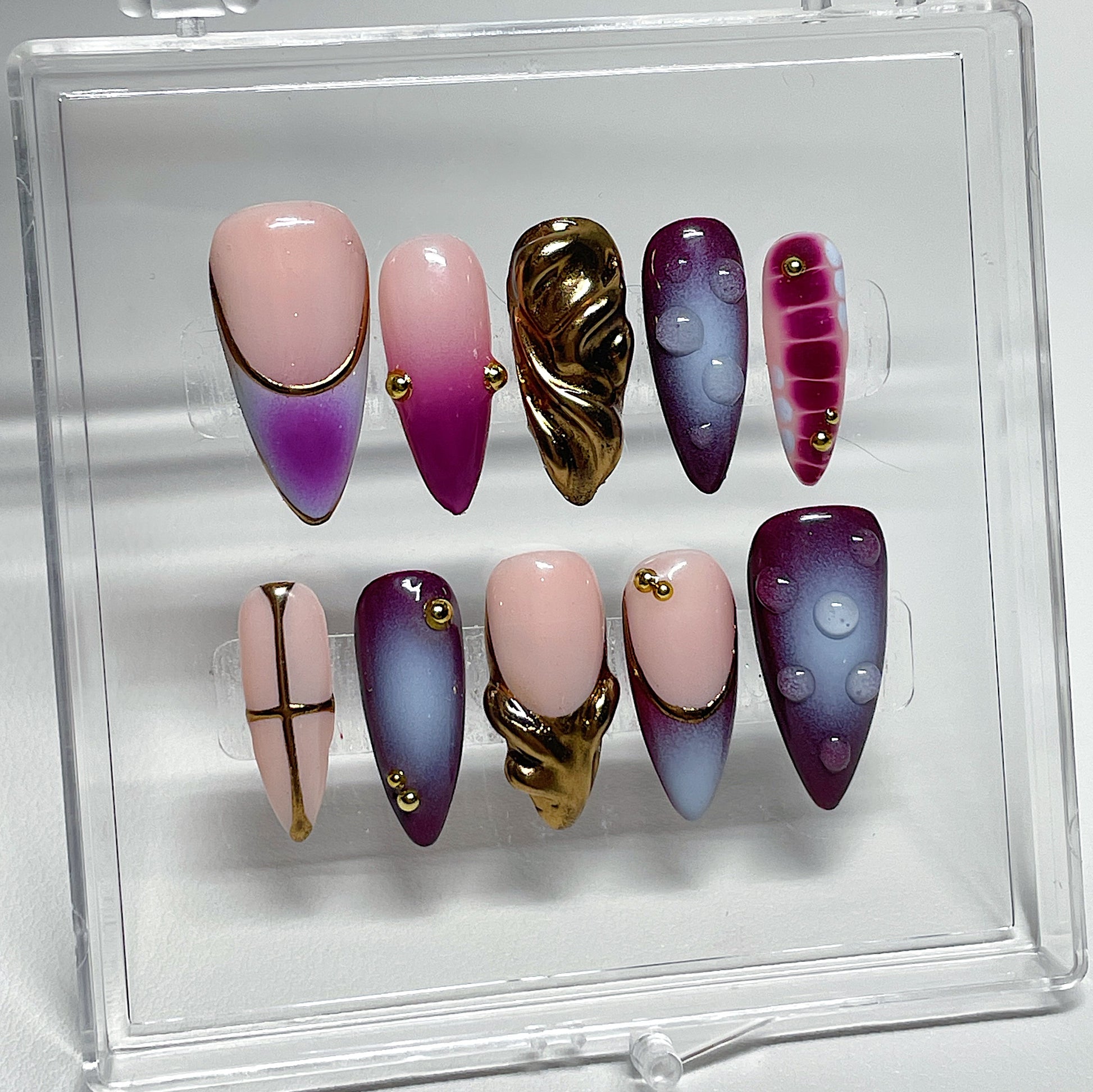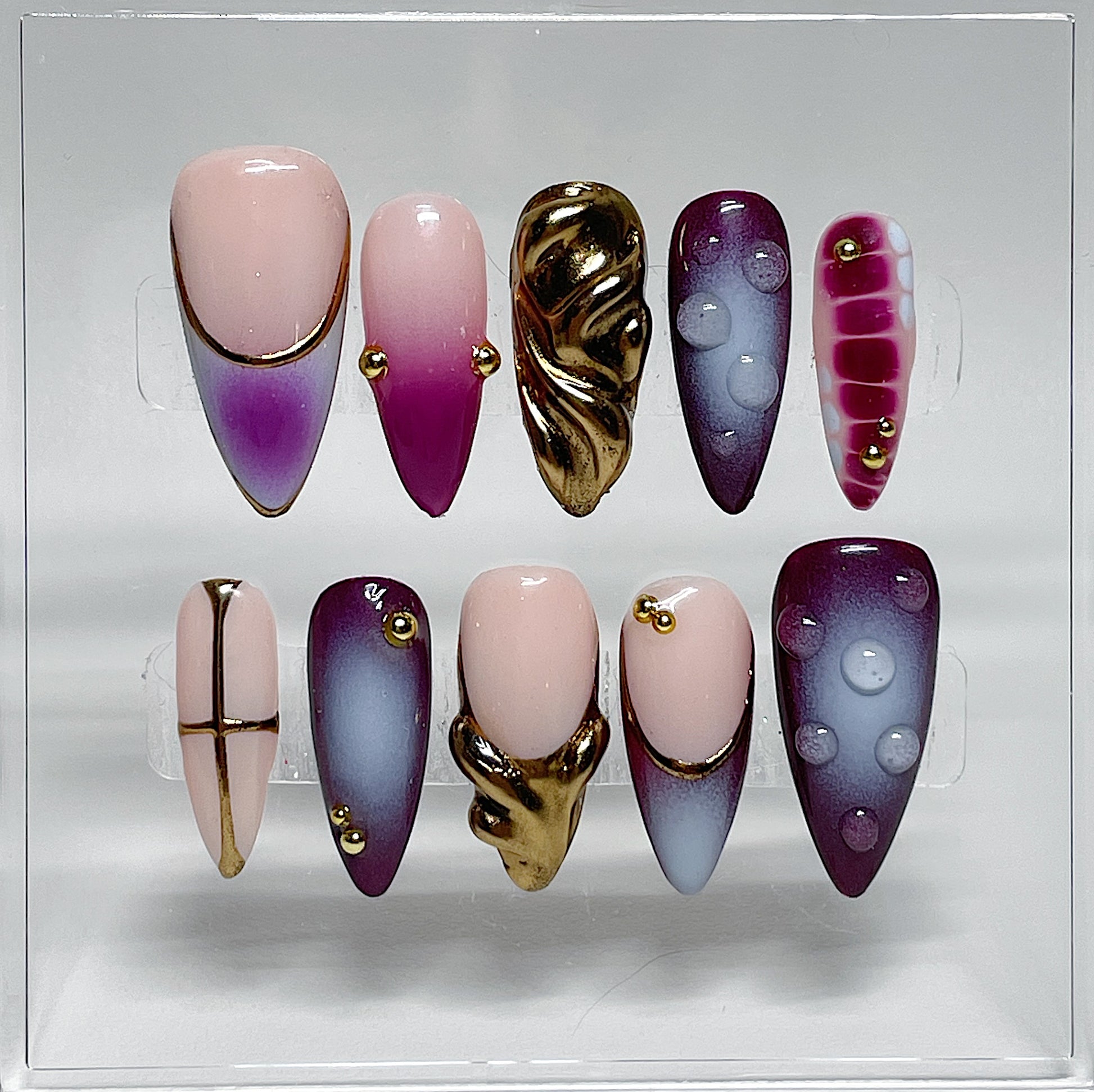 Your pressie set comes with 10 reusable press on nails as pictured, instructions on how to apply and remove your pressies, and an application kit containing everything you need for a seamless application!