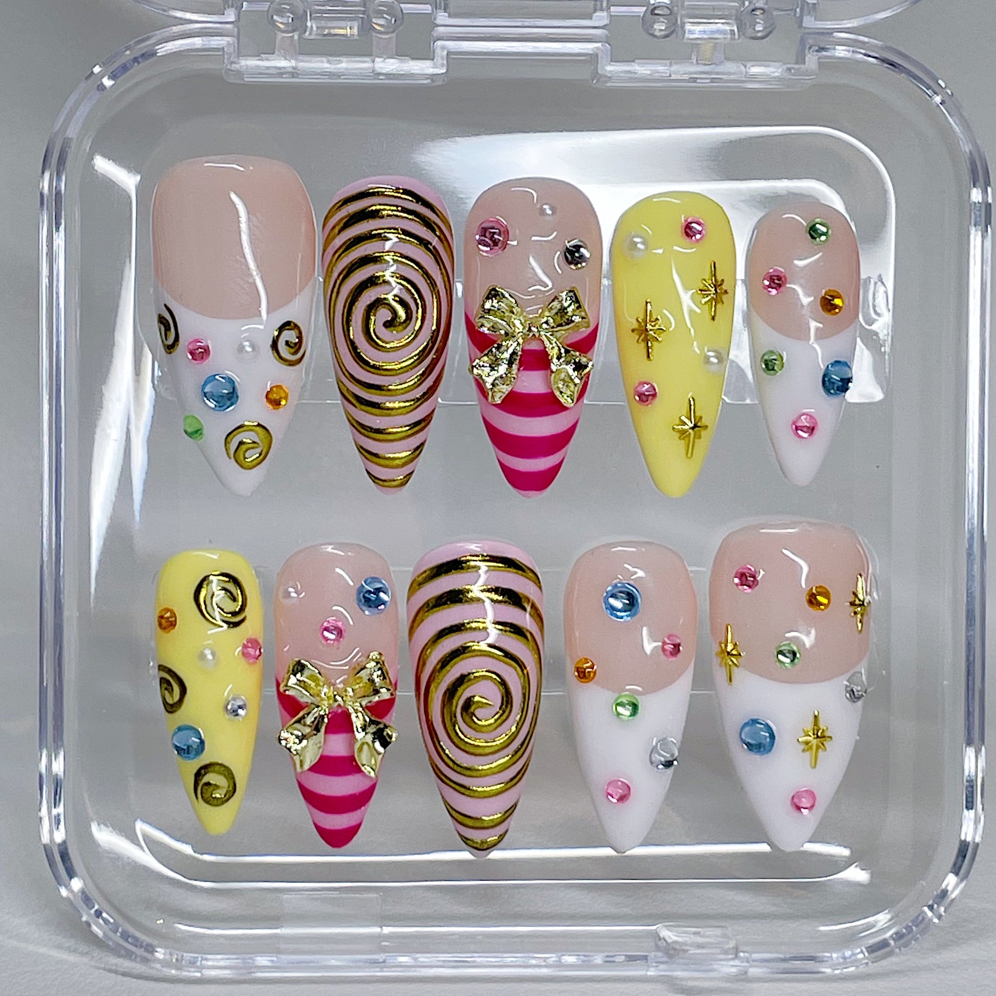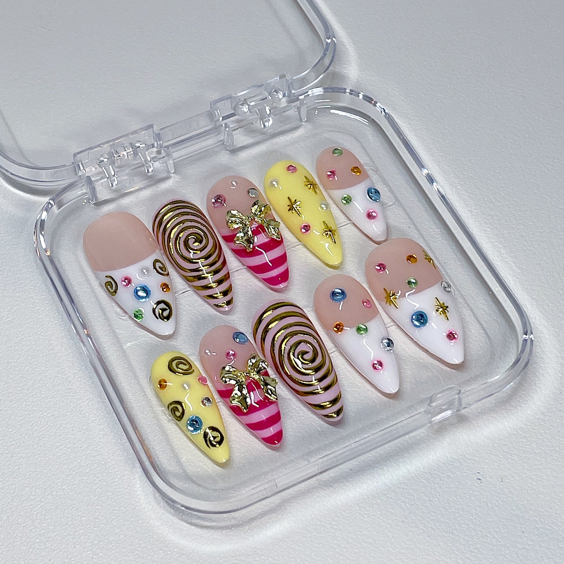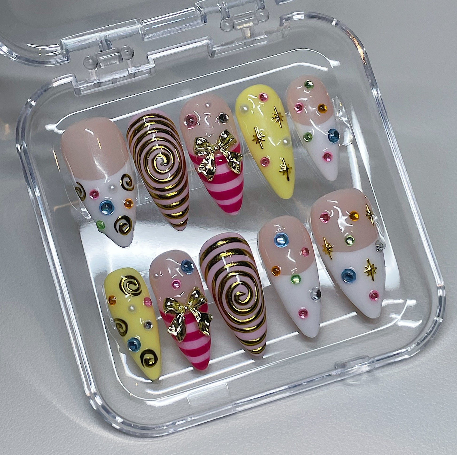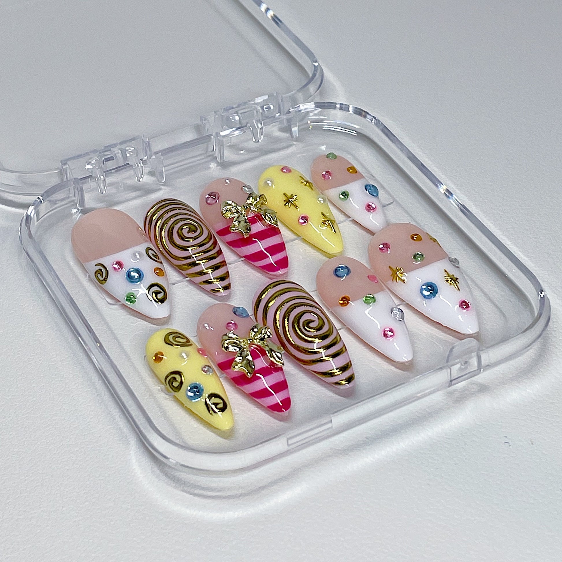 Your pressie set comes with 10 reusable press on nails as pictured, instructions on how to apply and remove your pressies, and an application kit containing everything you need for a seamless application!