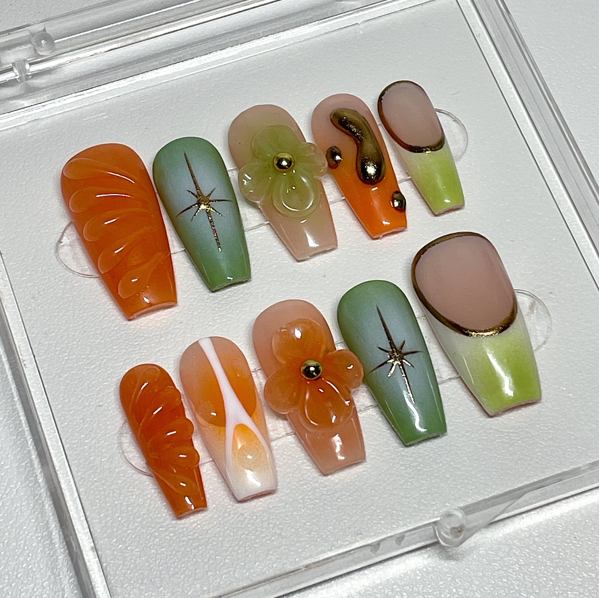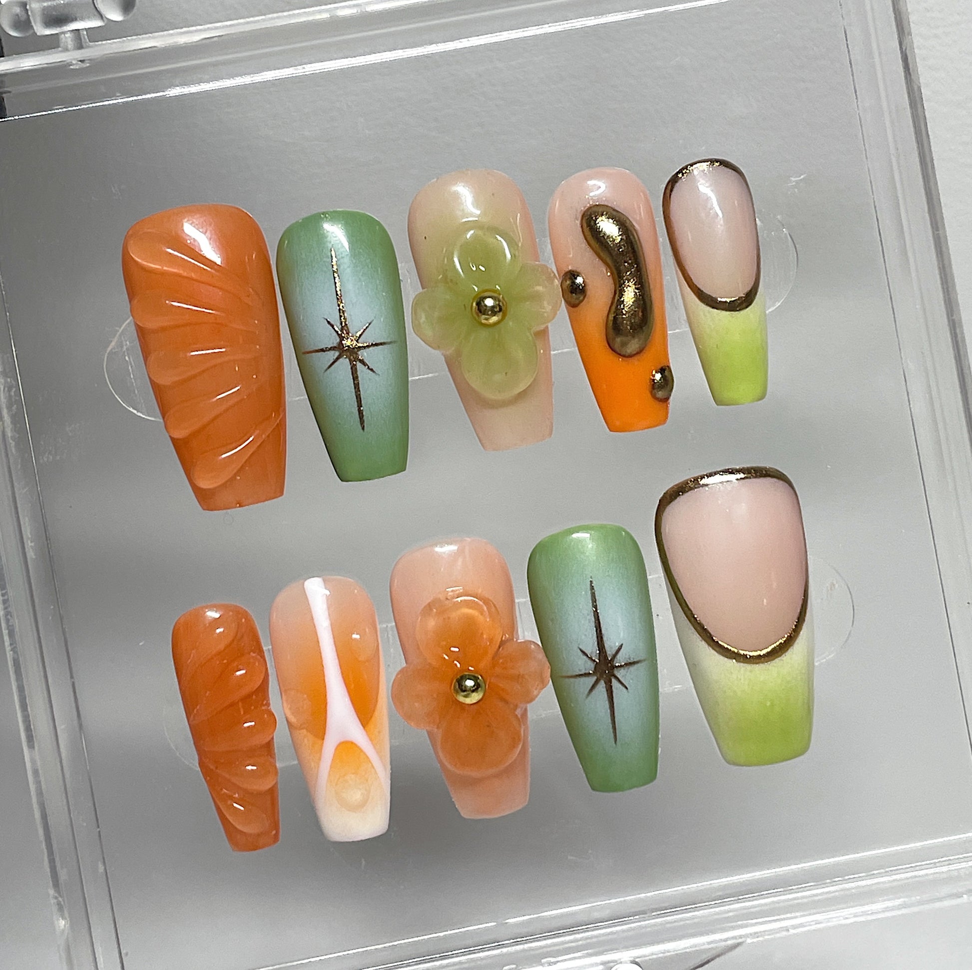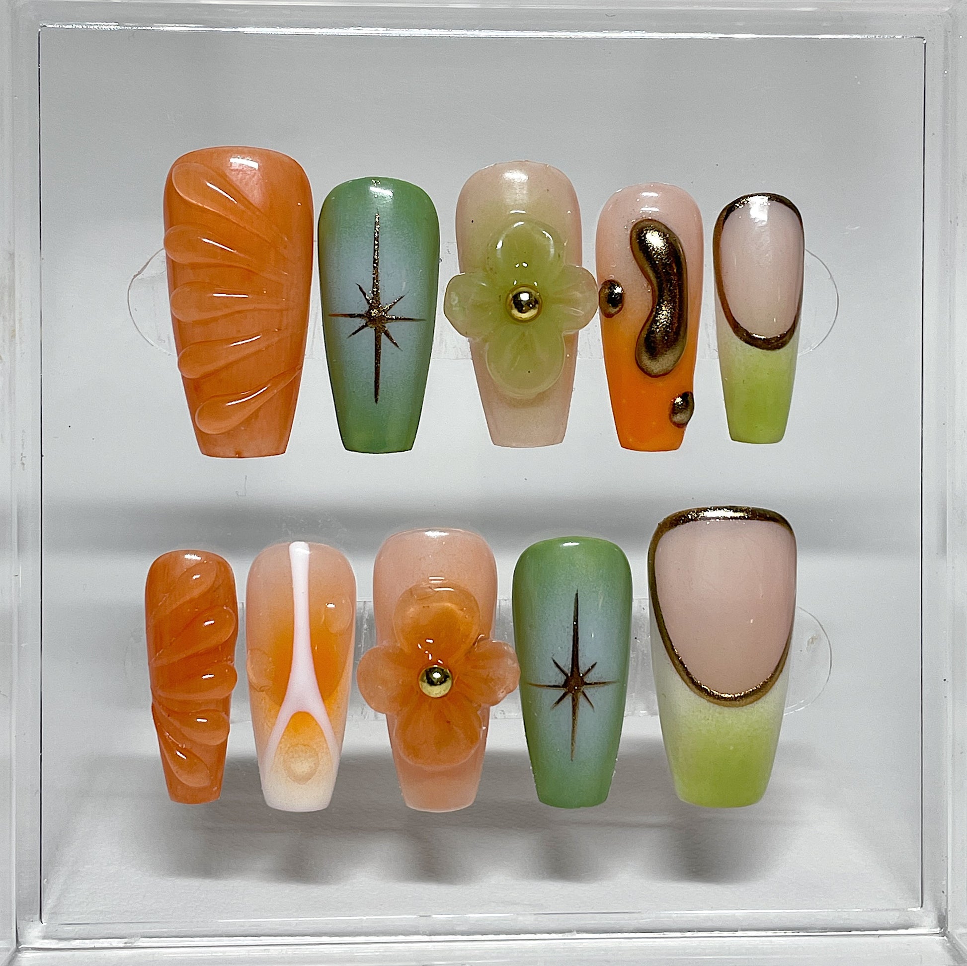Your pressie set comes with 10 reusable press on nails as pictured, instructions on how to apply and remove your pressies, and an application kit containing everything you need for a seamless application!