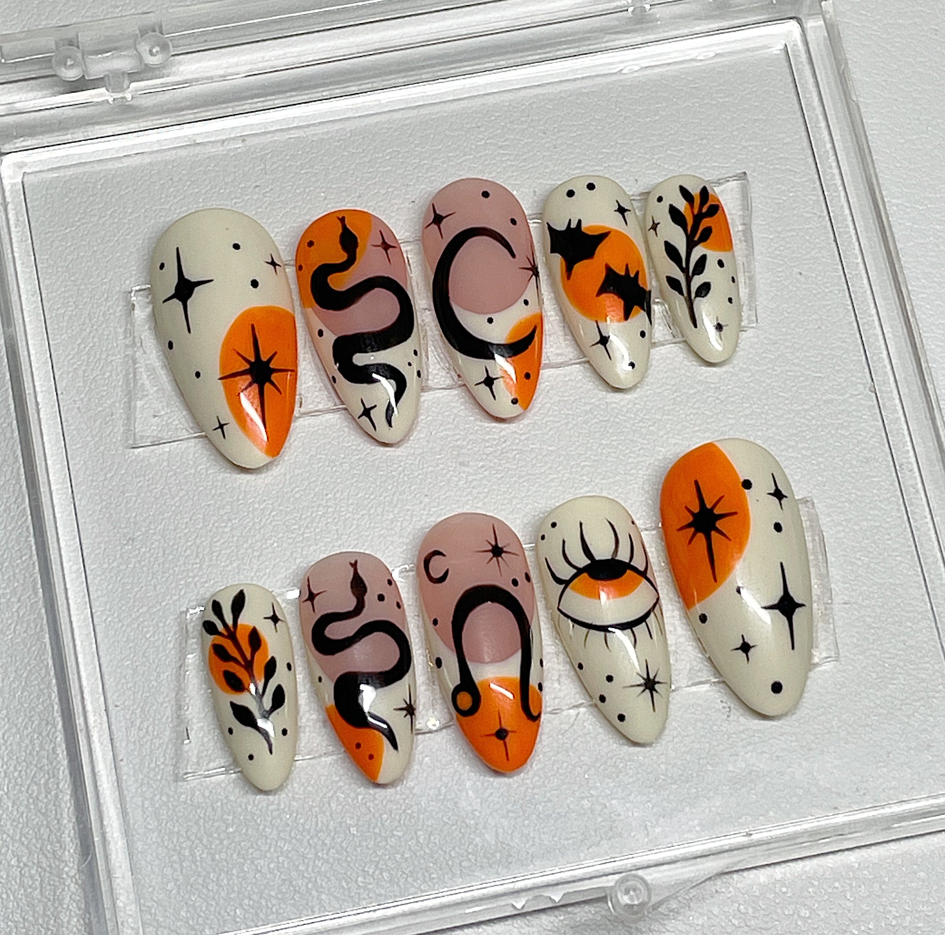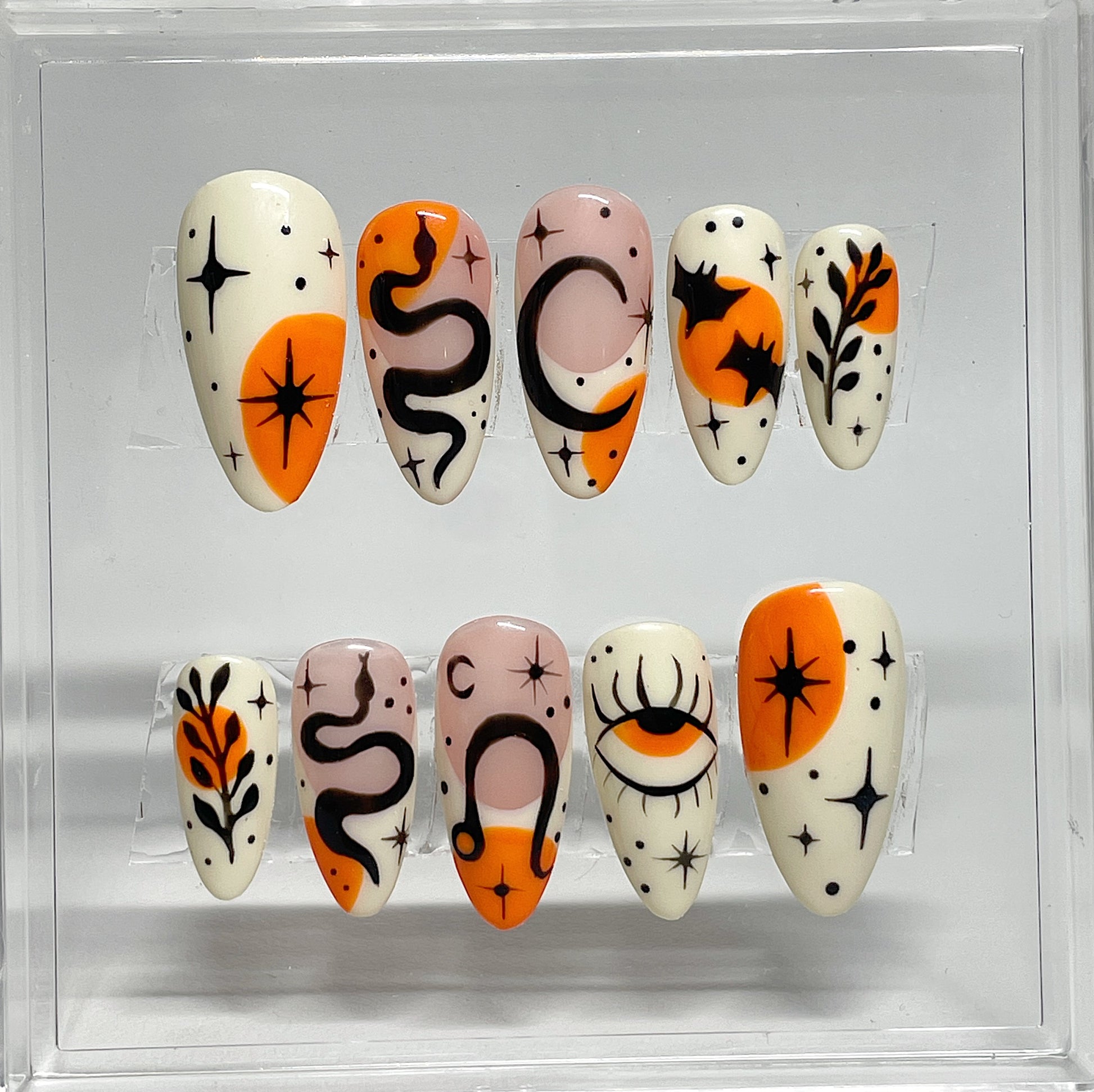 Your pressie set comes with 10 reusable press on nails as pictured, instructions on how to apply and remove your pressies, and an application kit containing everything you need for a seamless application!