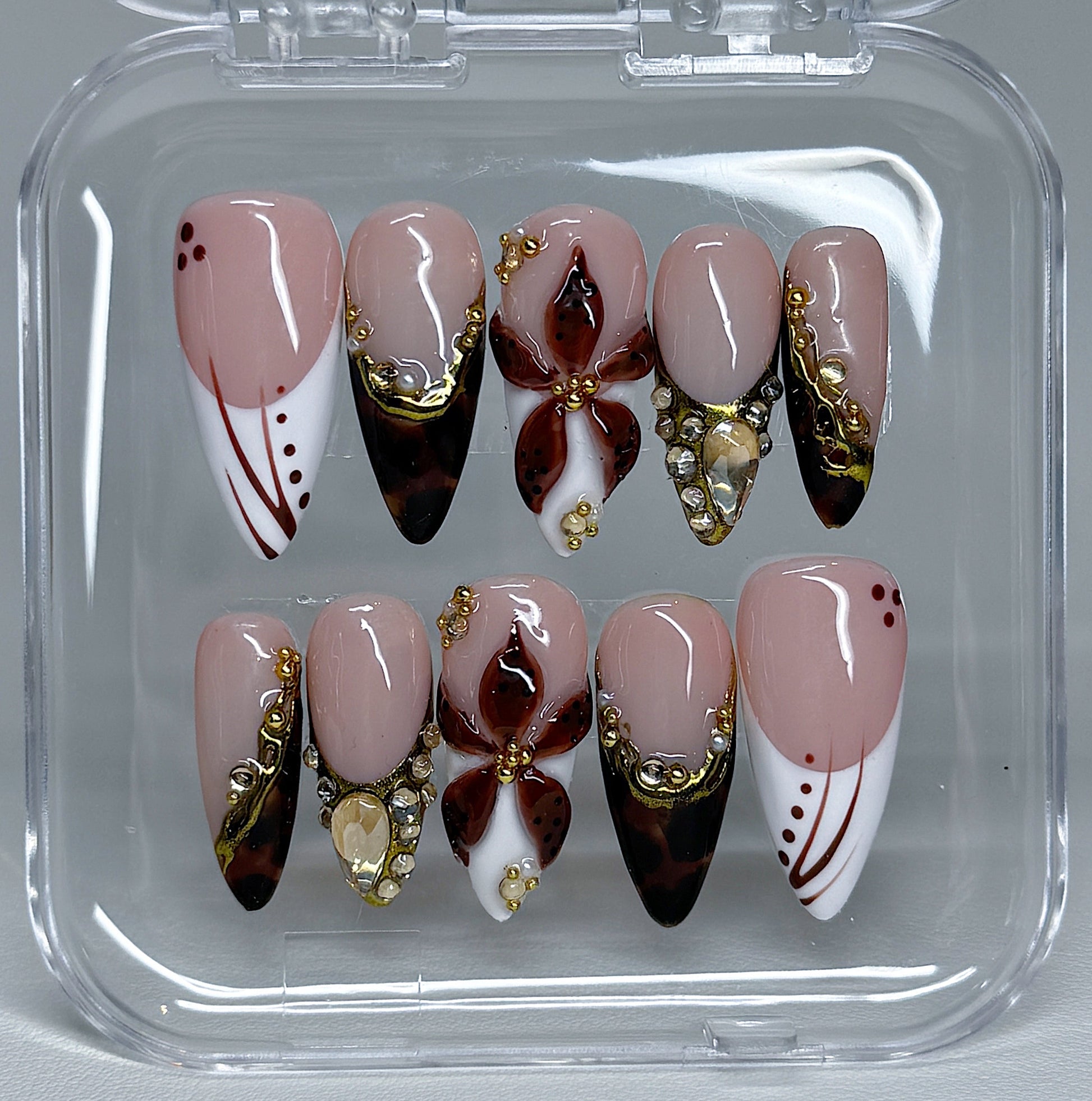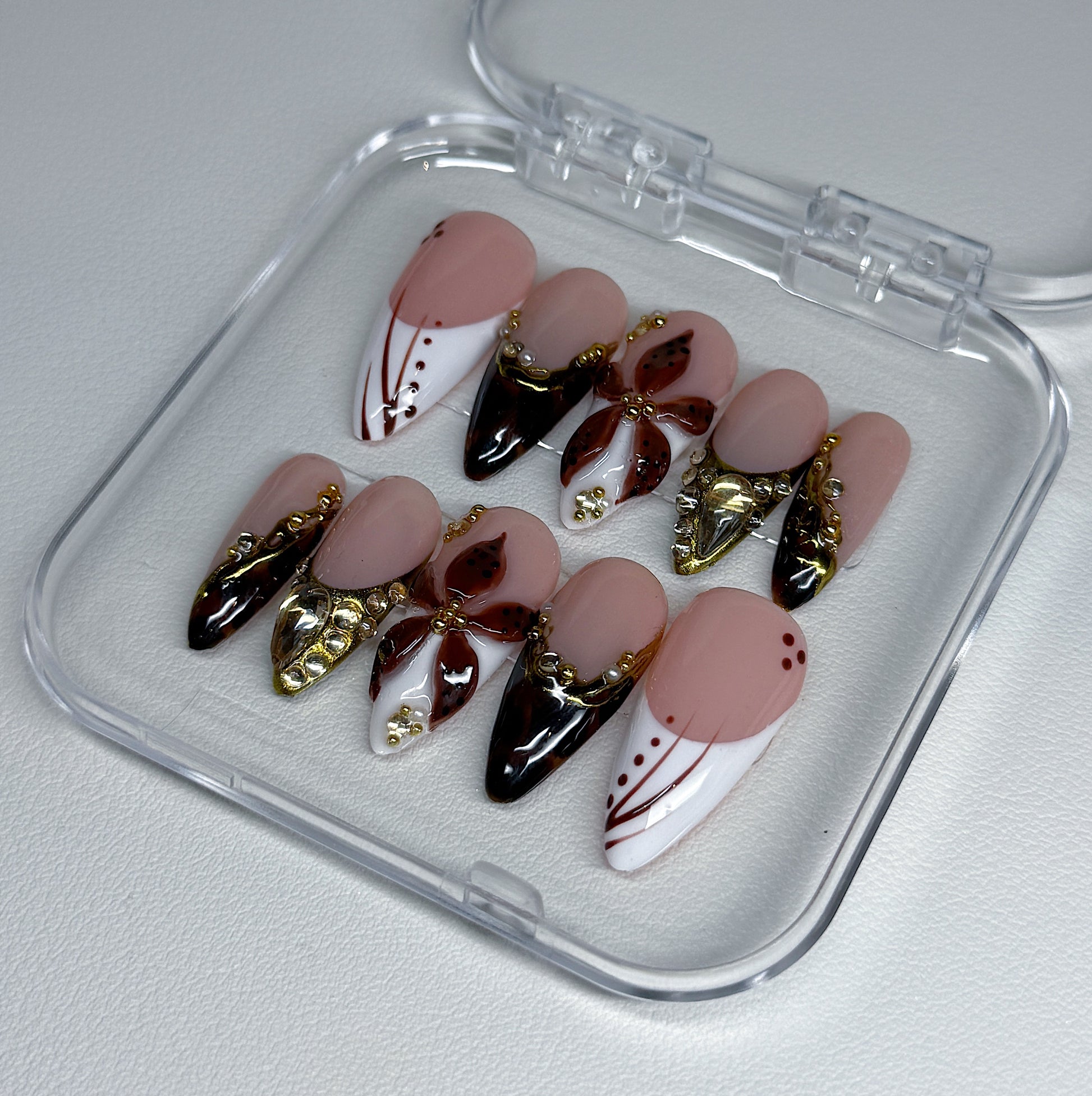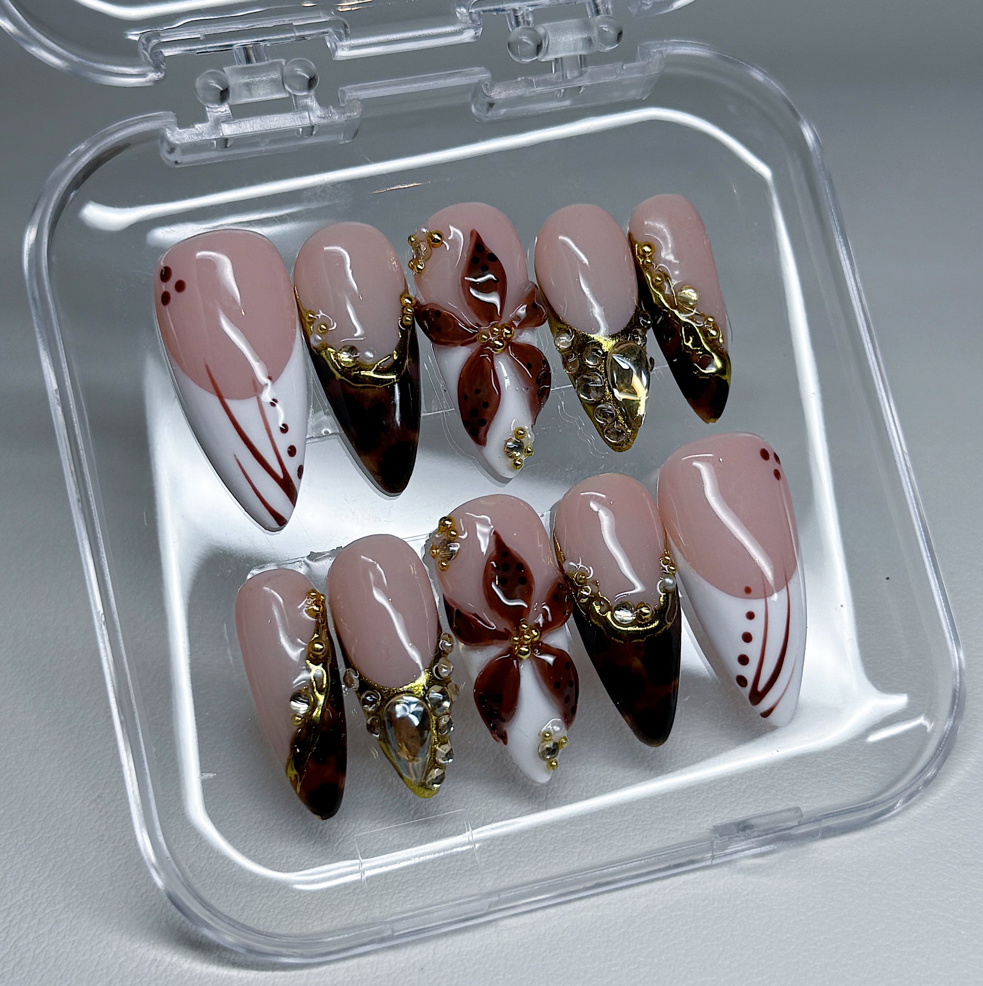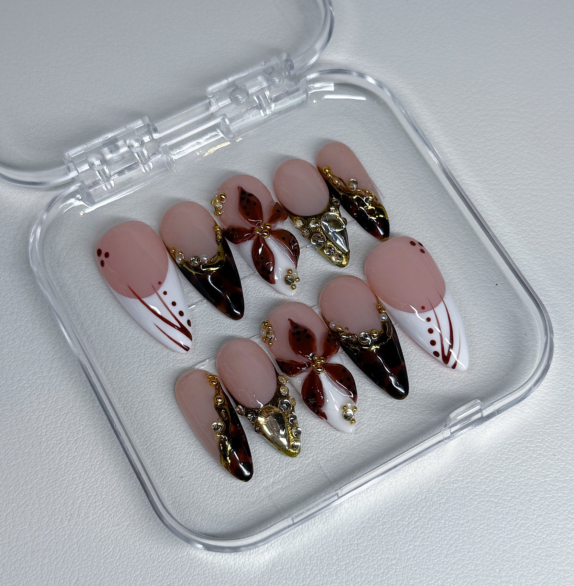 Your pressie set comes with 10 reusable press on nails as pictured, instructions on how to apply and remove your pressies, and an application kit containing everything you need for a seamless application!