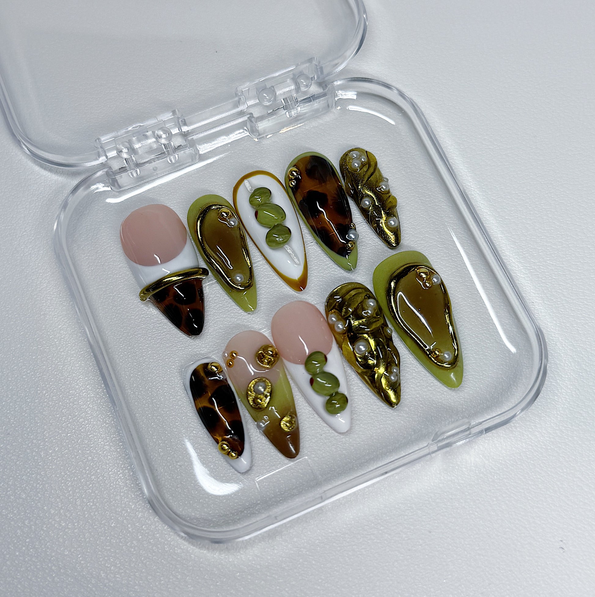 Your pressie set comes with 10 reusable press on nails as pictured, instructions on how to apply and remove your pressies, and an application kit containing everything you need for a seamless application!