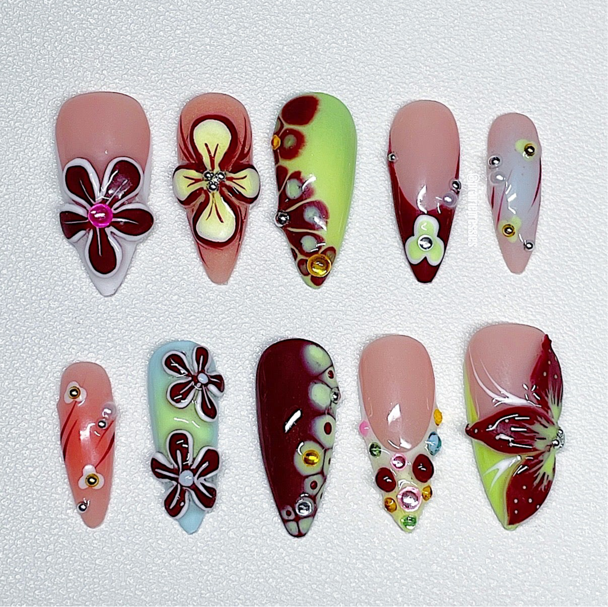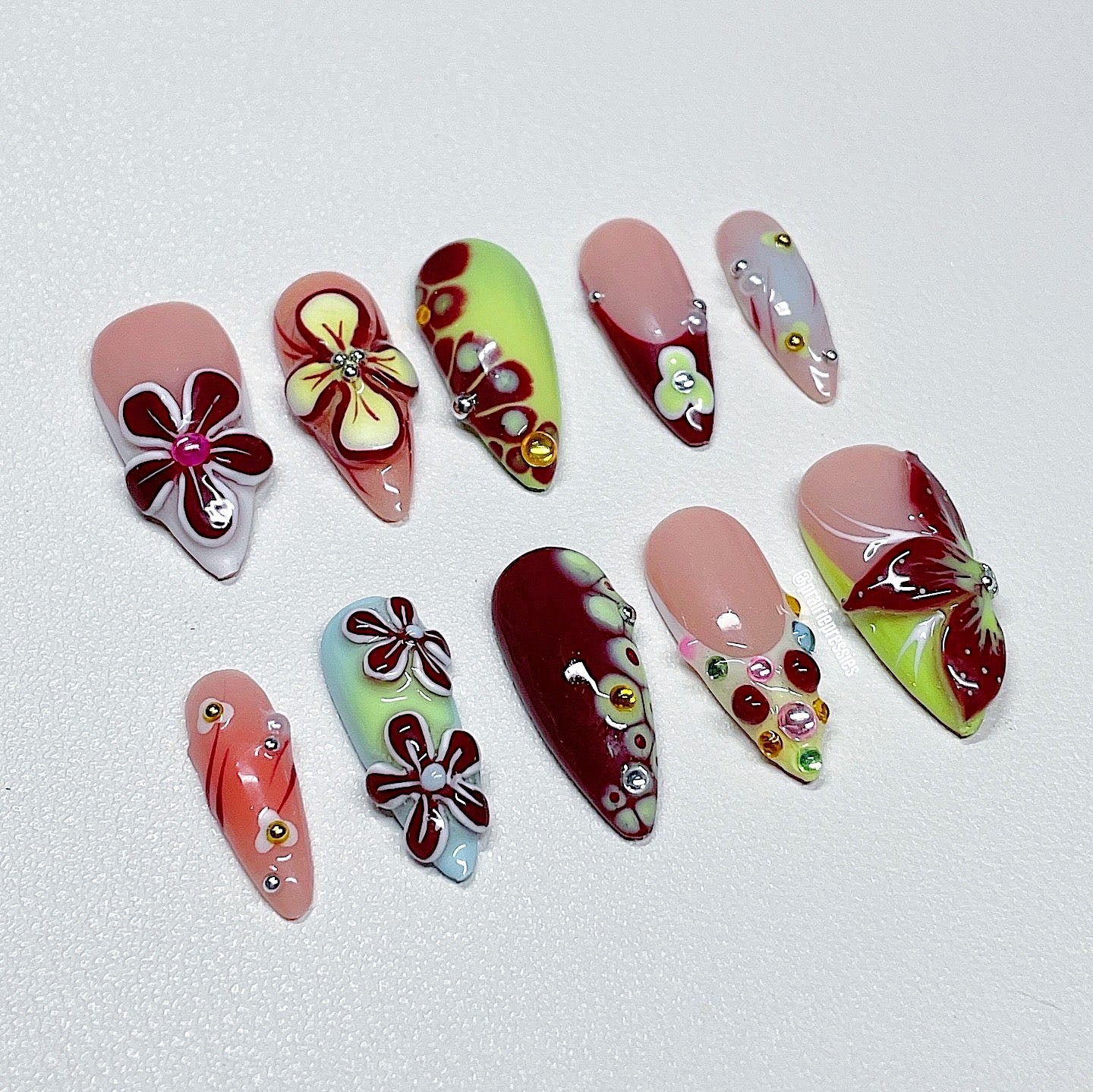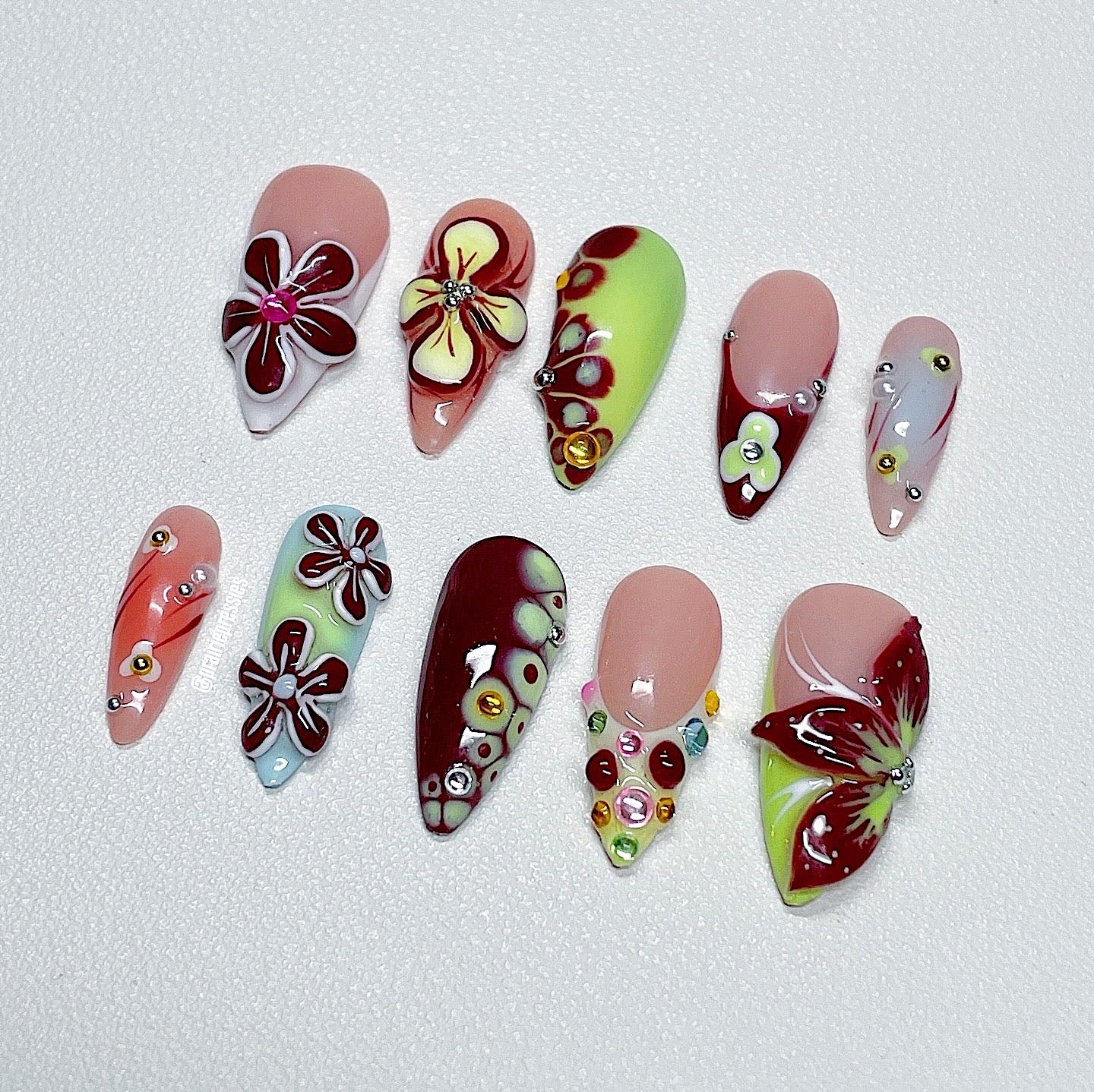 Your pressie set comes with 10 reusable press on nails as pictured, instructions on how to apply and remove your pressies, and an application kit containing everything you need for a seamless application!