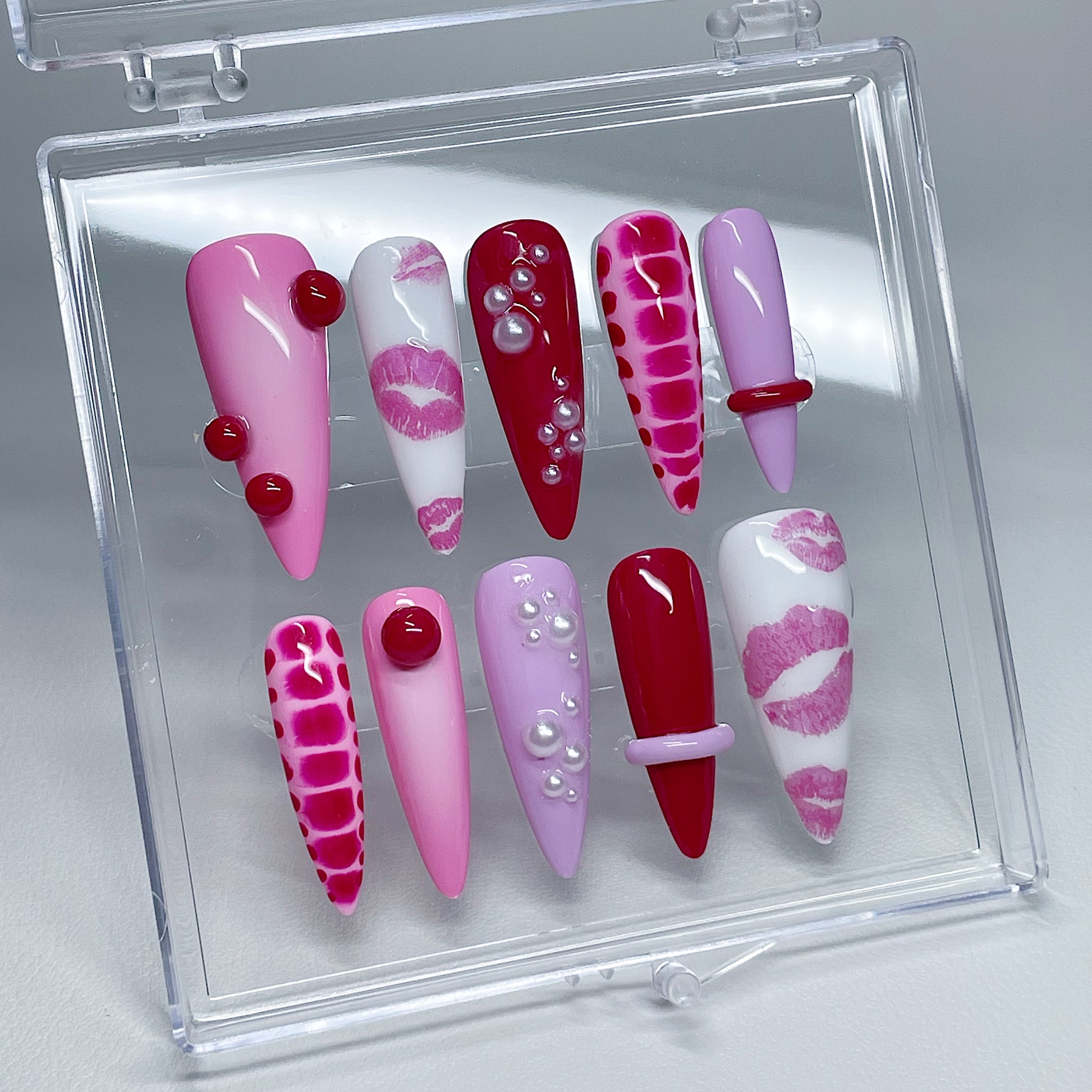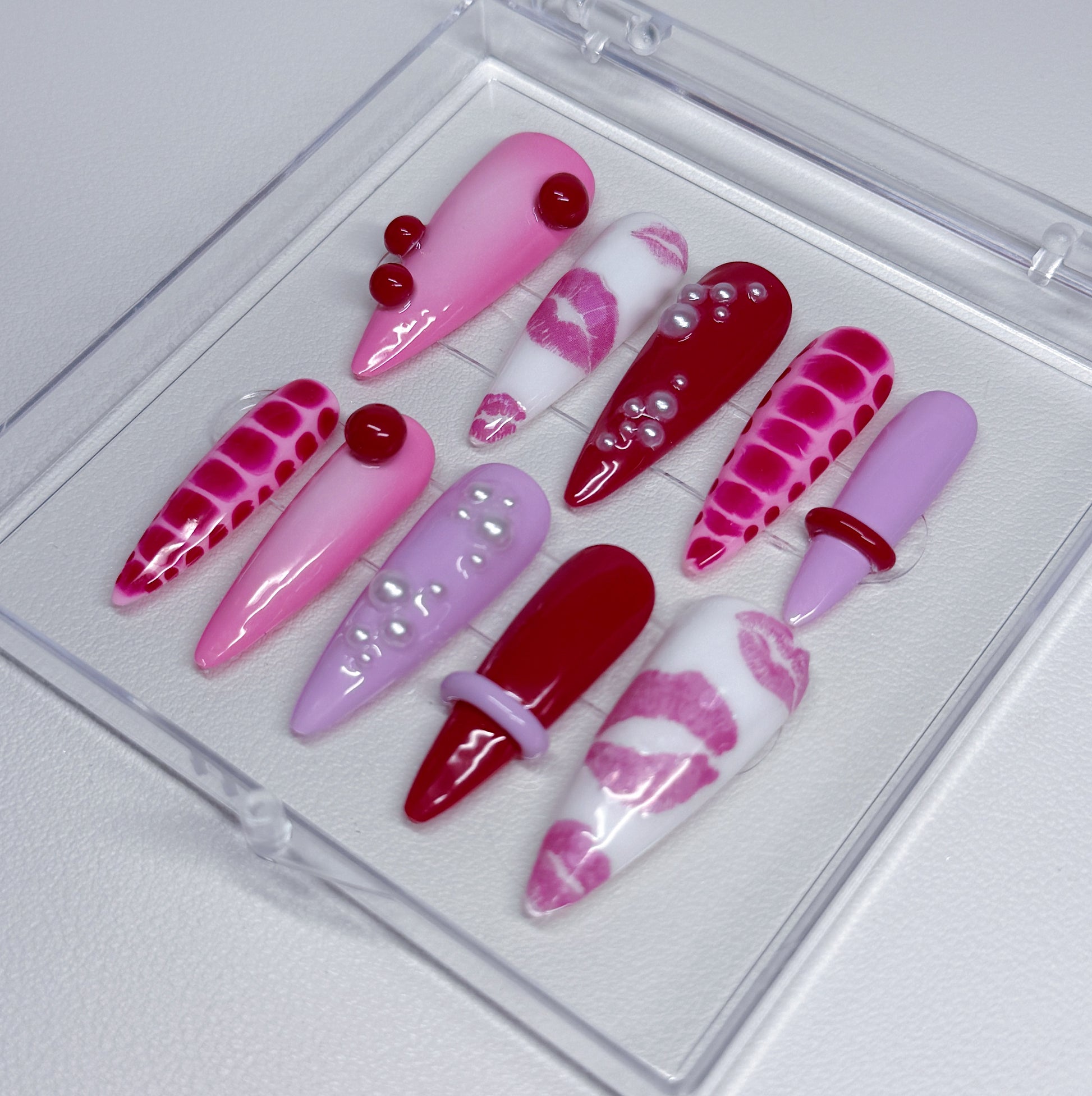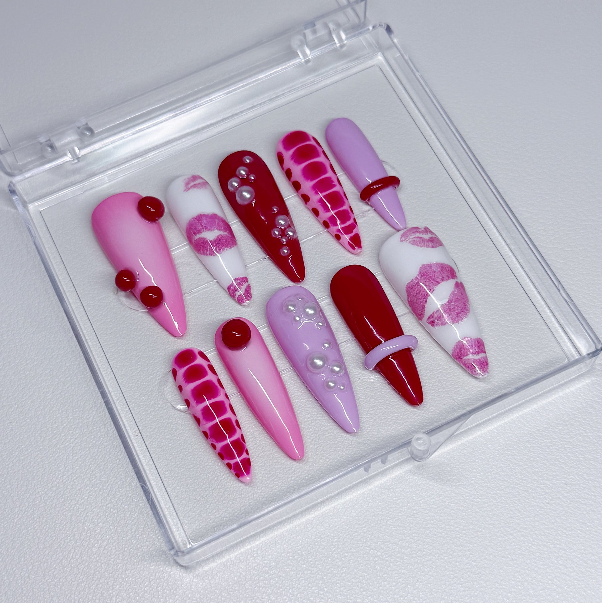 Your pressie set comes with 10 reusable press on nails as pictured, instructions on how to apply and remove your pressies, and an application kit containing everything you need for a seamless application!