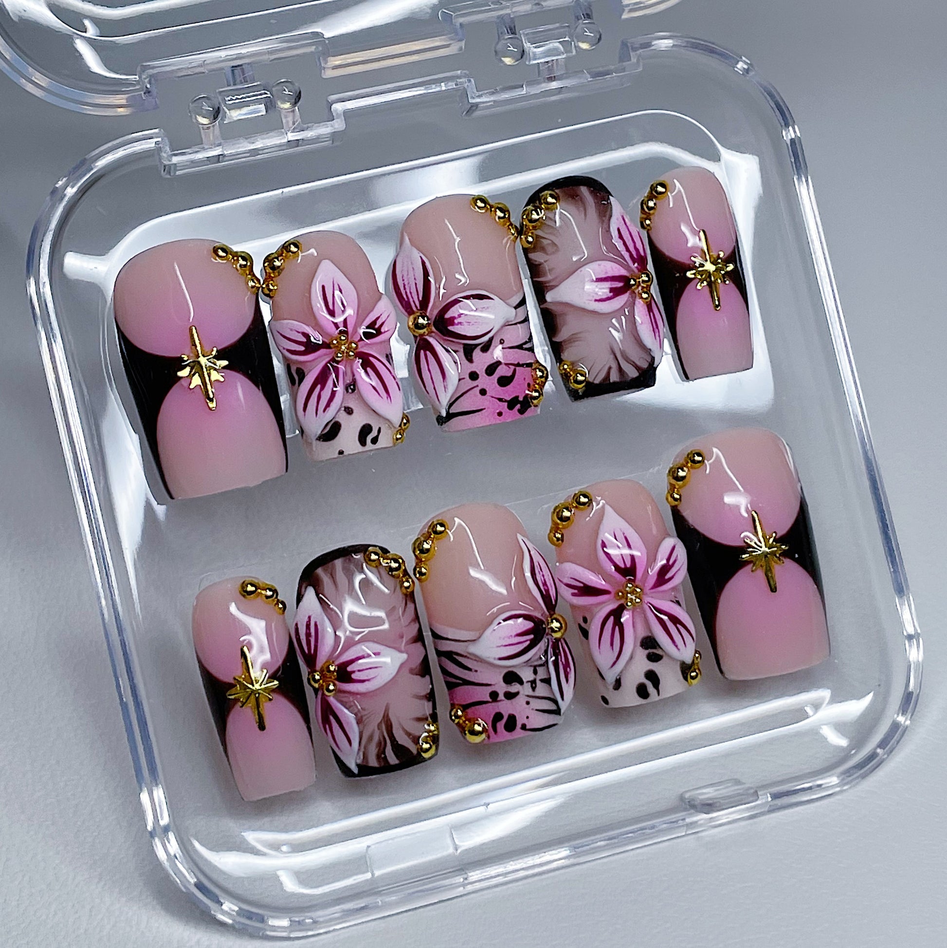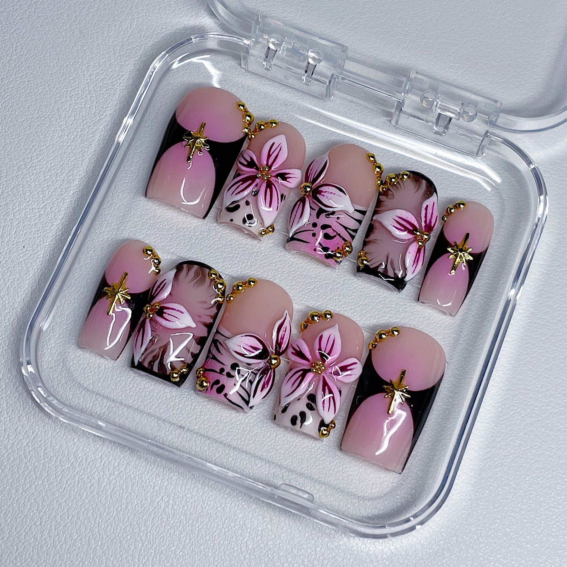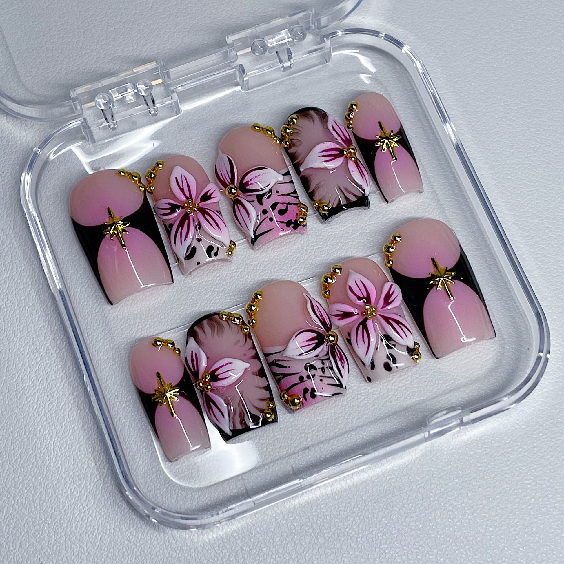 Your pressie set comes with 10 reusable press on nails as pictured, instructions on how to apply and remove your pressies, and an application kit containing everything you need for a seamless application!