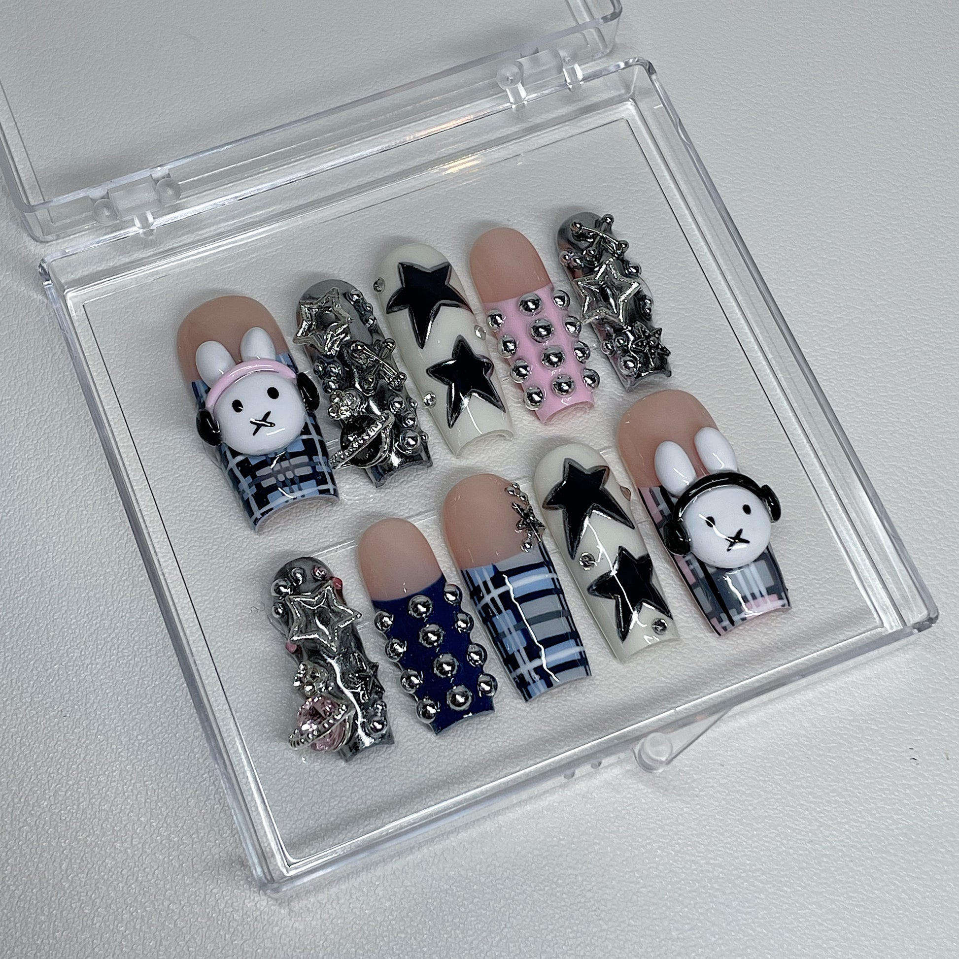 Your pressie set comes with 10 reusable press on nails as pictured, instructions on how to apply and remove your pressies, and an application kit containing everything you need for a seamless application!