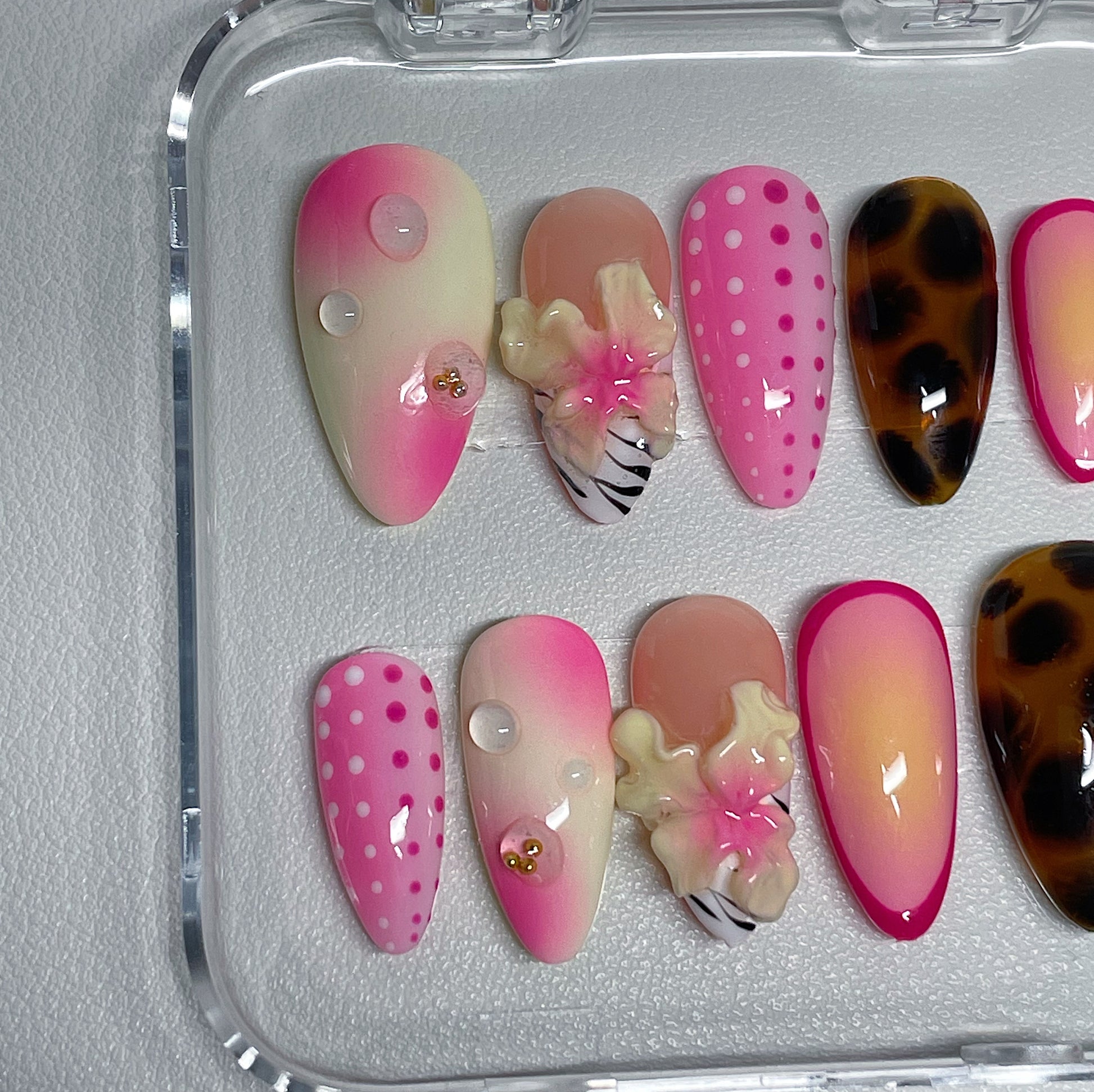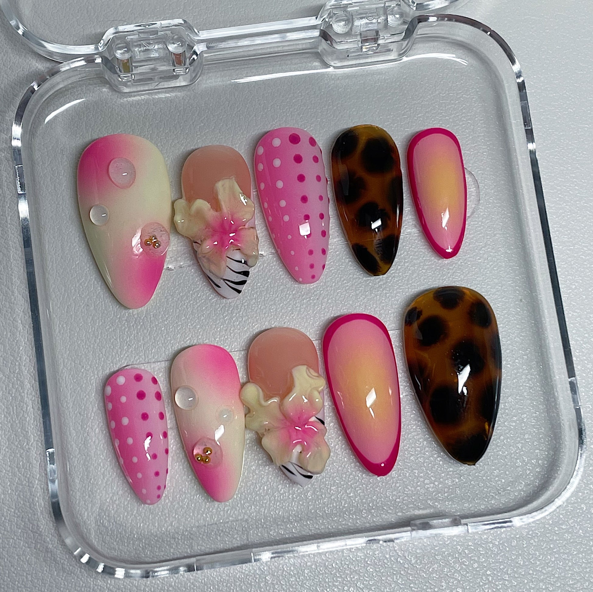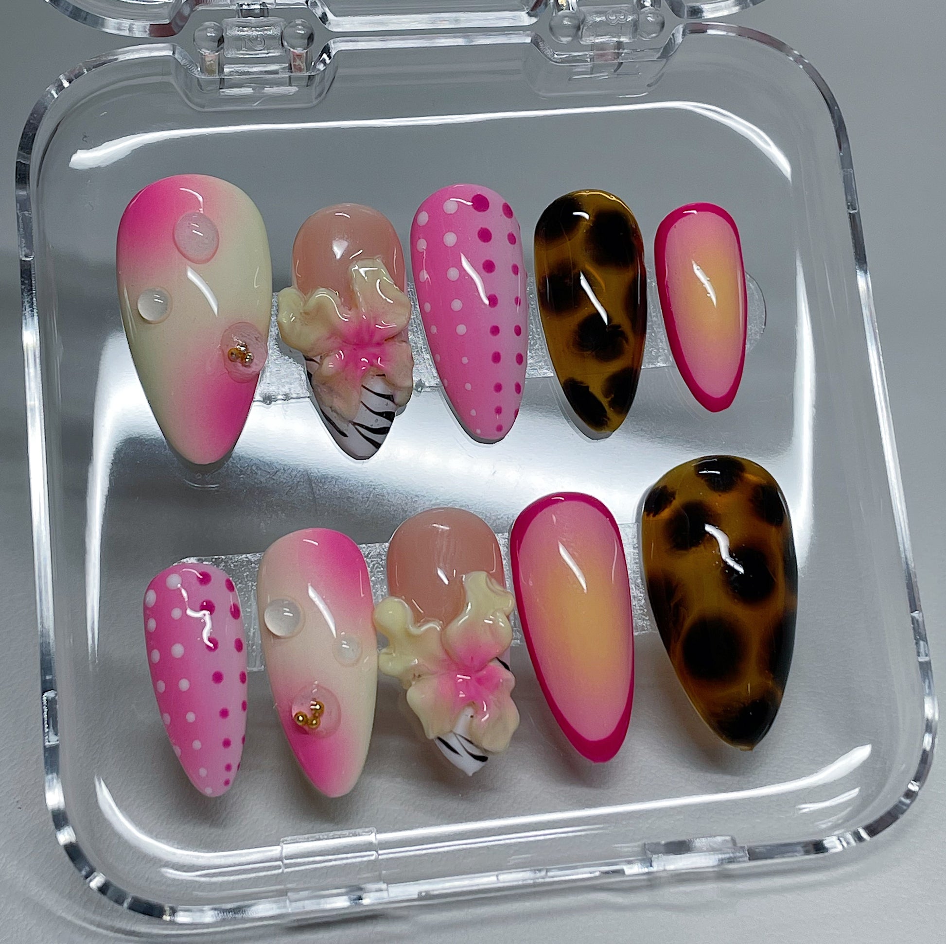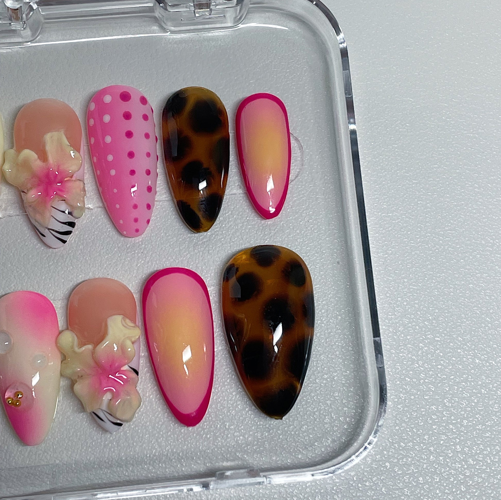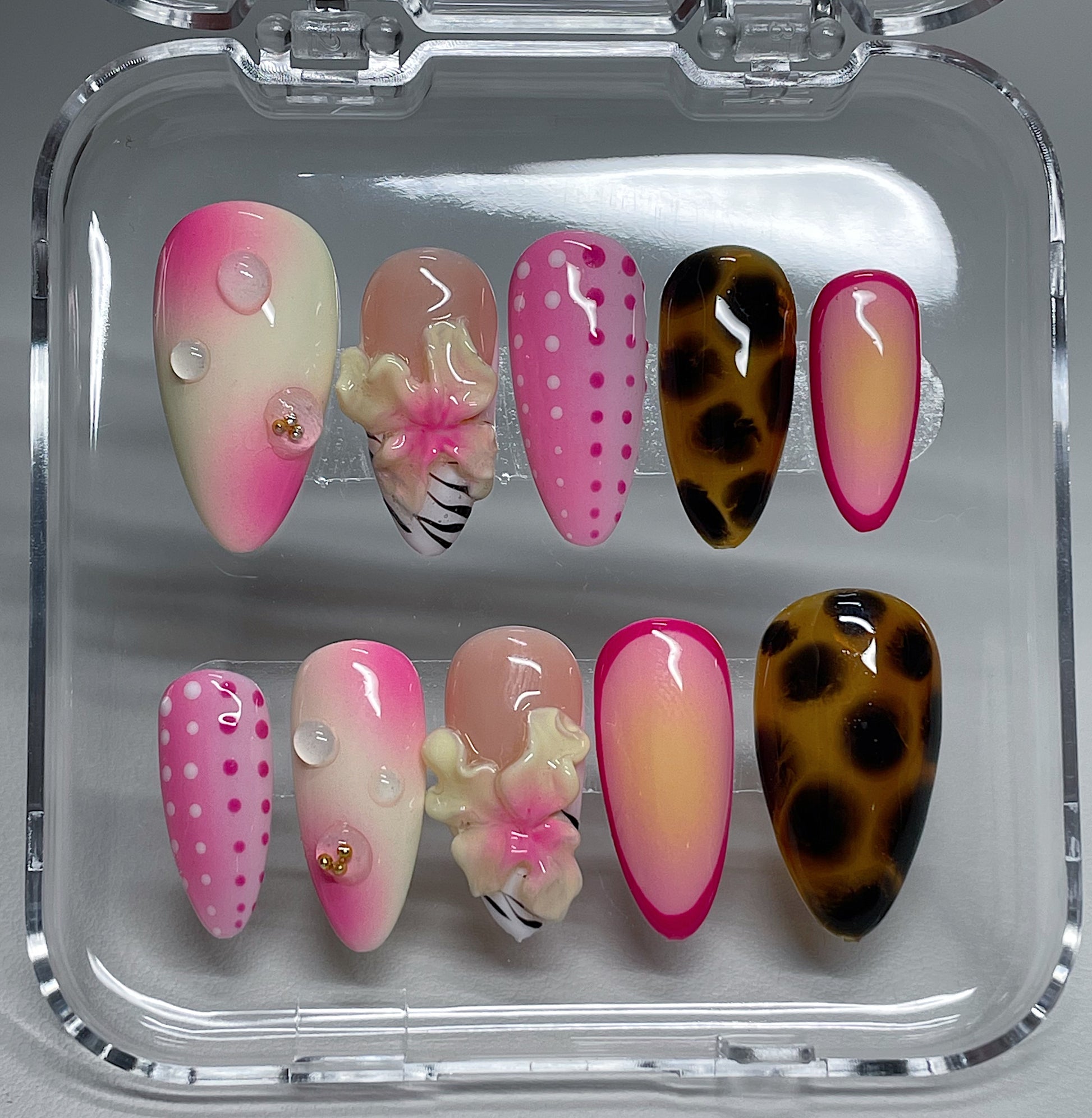 Your pressie set comes with 10 reusable press on nails as pictured, instructions on how to apply and remove your pressies, and an application kit containing everything you need for a seamless application!