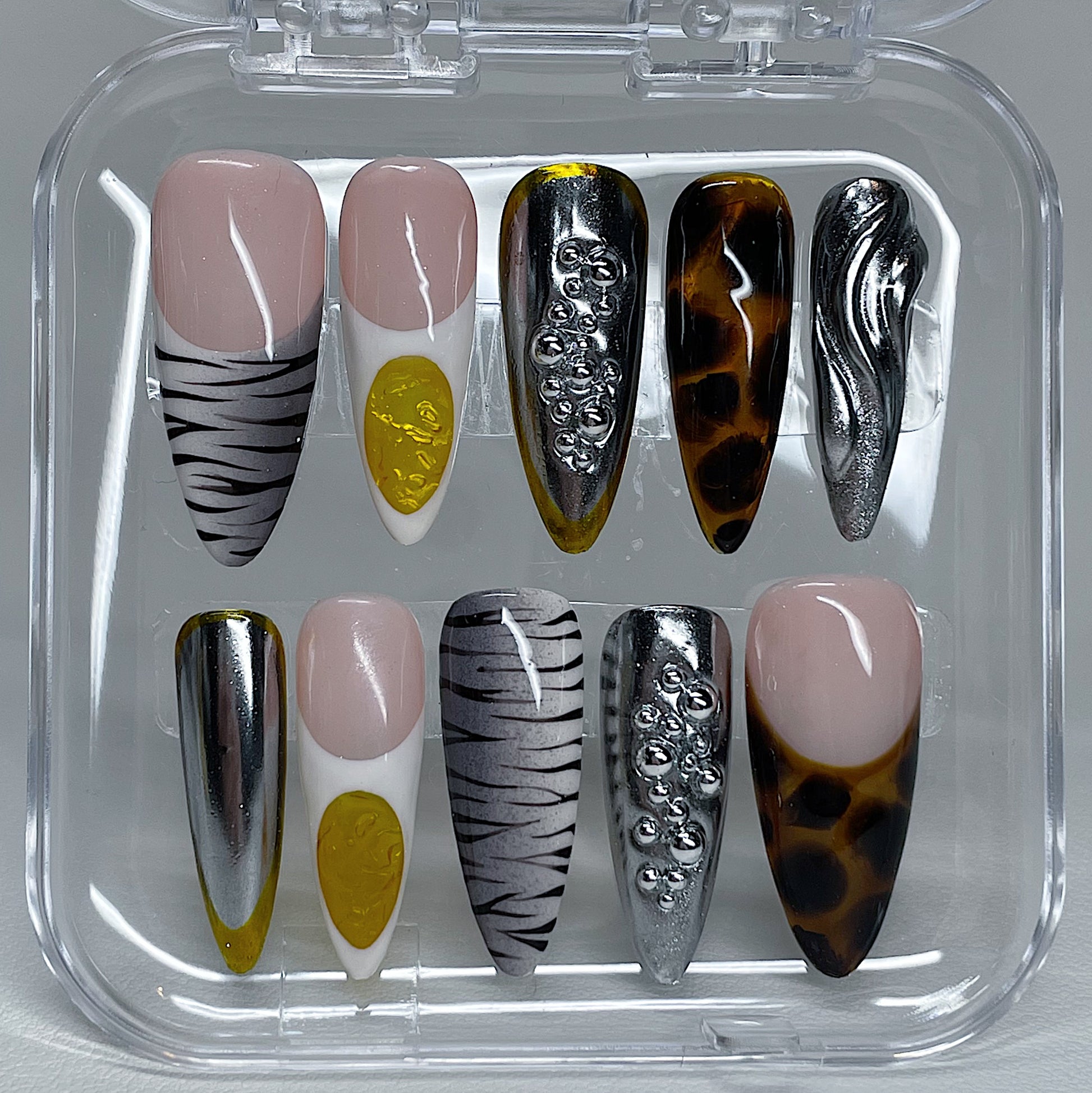 Your pressie set comes with 10 reusable press on nails as pictured, instructions on how to apply and remove your pressies, and an application kit containing everything you need for a seamless application!