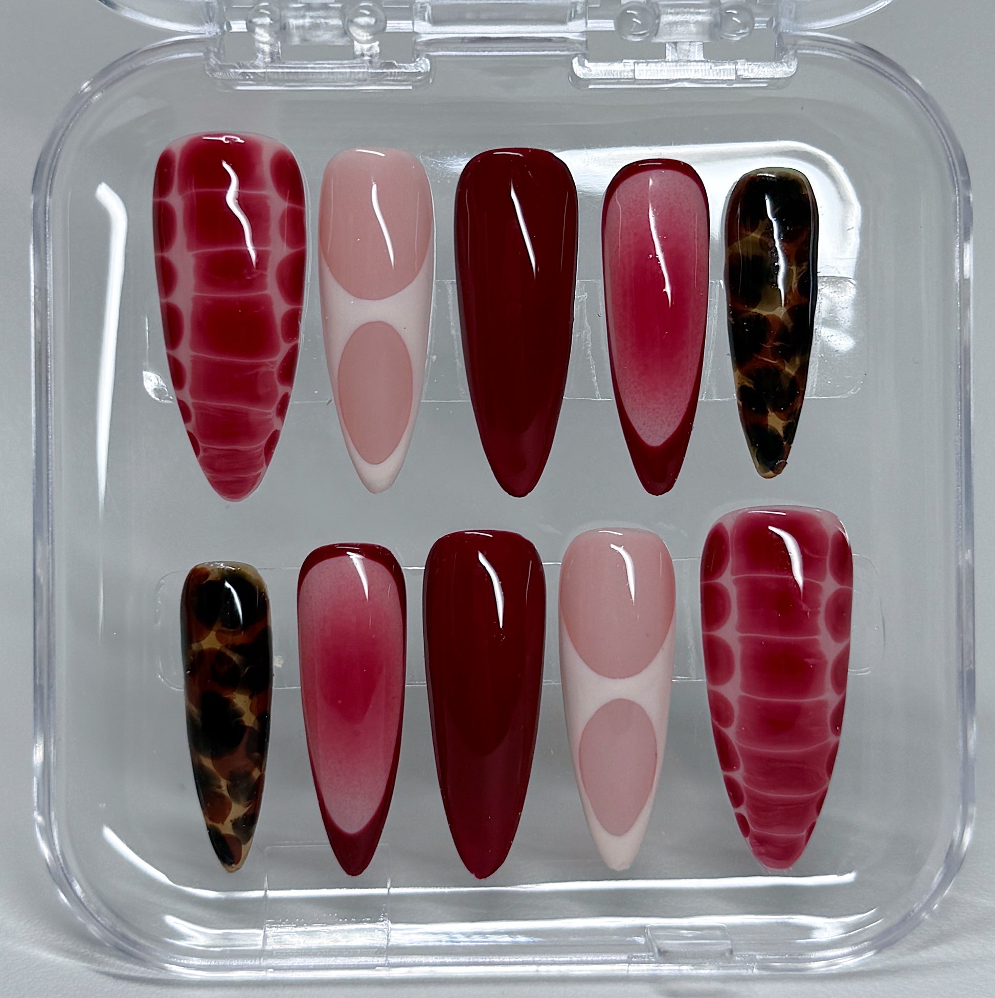 Your pressie set comes with 10 reusable press on nails as pictured, instructions on how to apply and remove your pressies, and an application kit containing everything you need for a seamless application!