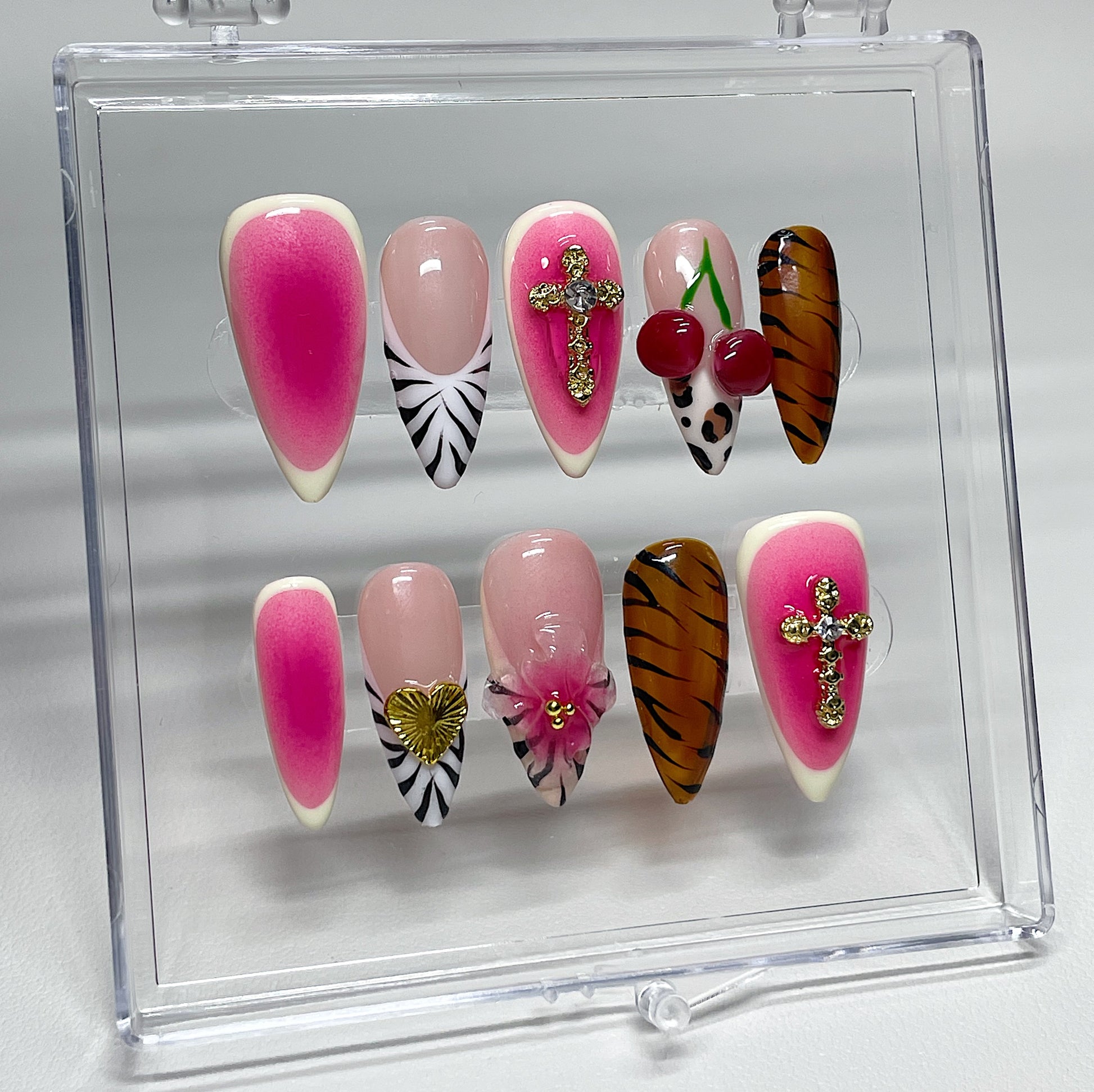 Your pressie set comes with 10 reusable press on nails as pictured, instructions on how to apply and remove your pressies, and an application kit containing everything you need for a seamless application!
