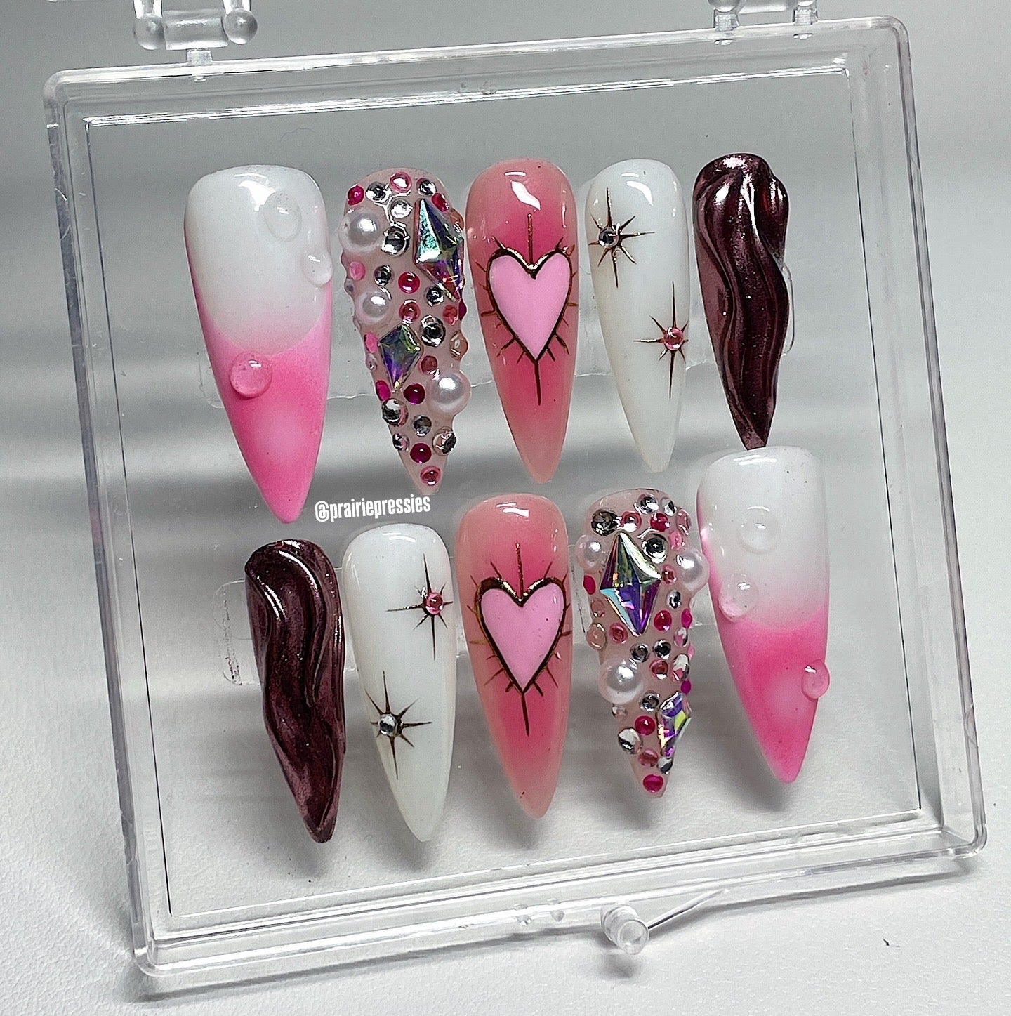 Your pressie set comes with 10 reusable press on nails as pictured, instructions on how to apply and remove your pressies, and an application kit containing everything you need for a seamless application!