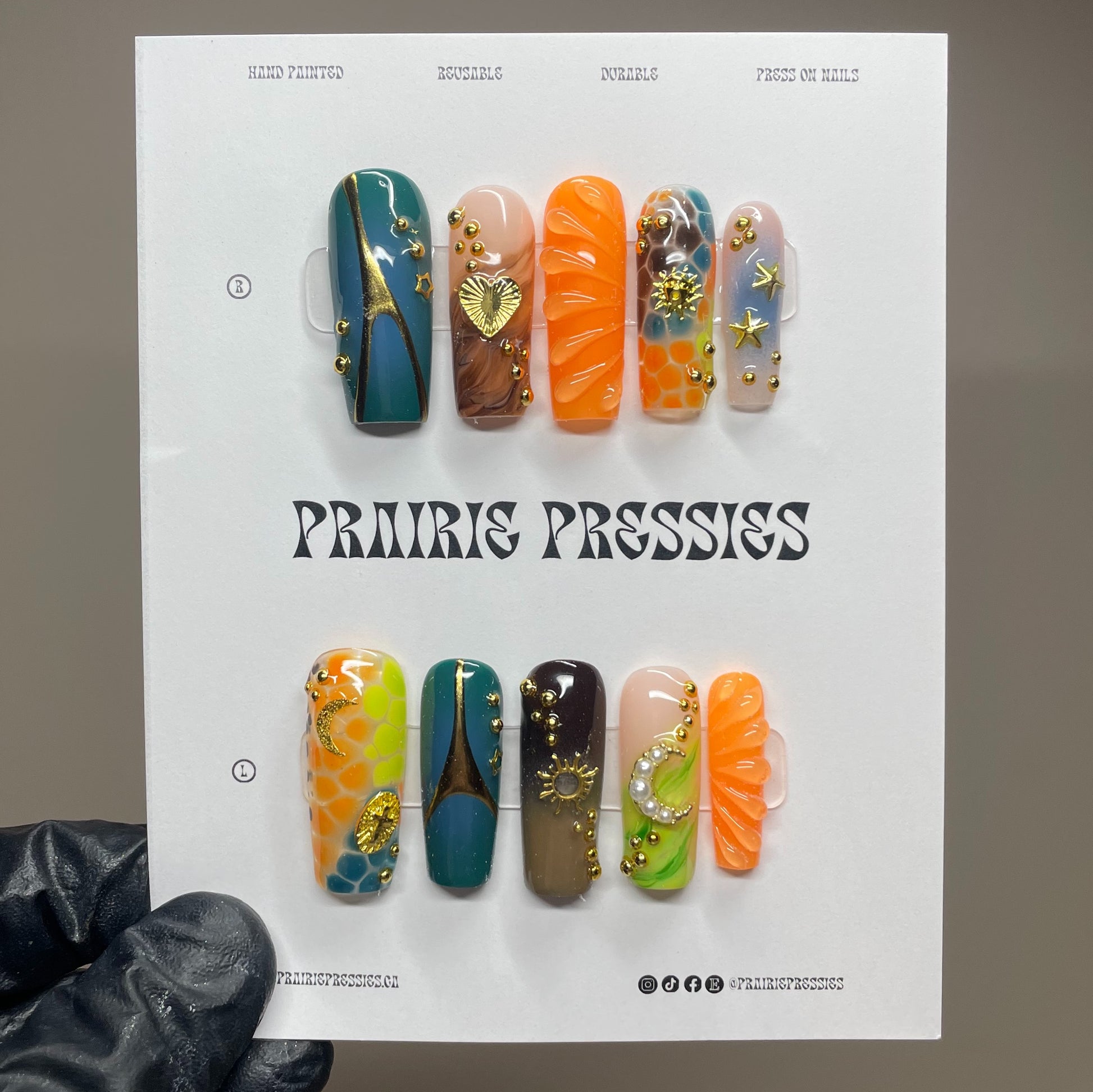 Your pressie set comes with 10 reusable press on nails as pictured, instructions on how to apply and remove your pressies, and an application kit containing everything you need for a seamless application!