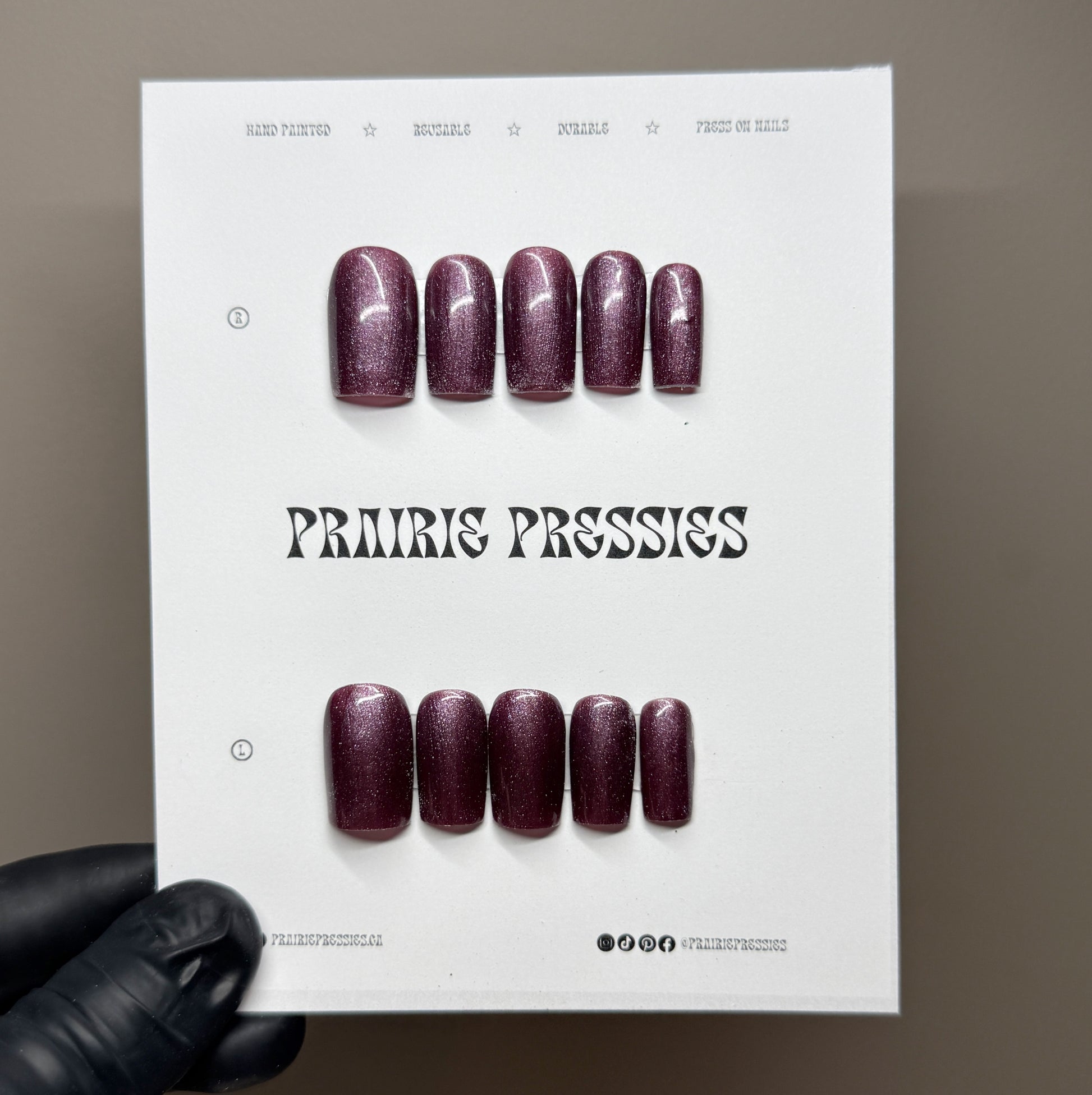 Your pressie set comes with 10 reusable press on nails as pictured, instructions on how to apply and remove your pressies, and an application kit containing everything you need for a seamless application!