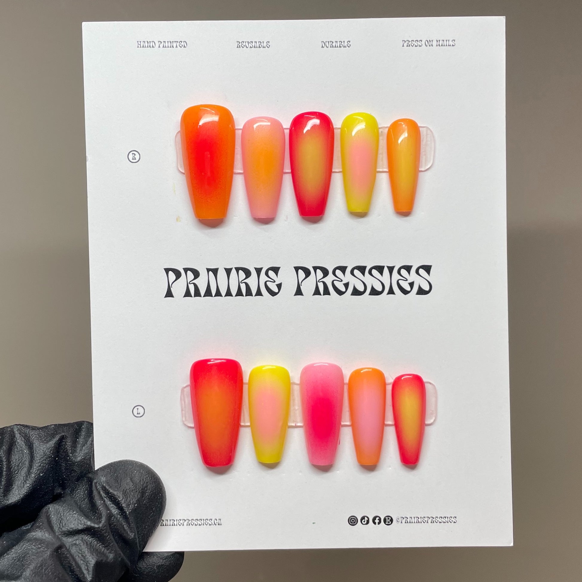 Your pressie set comes with 10 reusable press on nails as pictured, instructions on how to apply and remove your pressies, and an application kit containing everything you need for a seamless application!