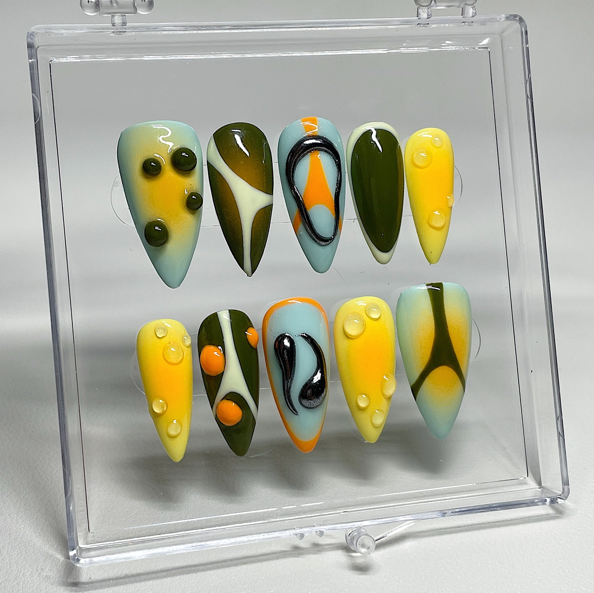 Your pressie set comes with 10 reusable press on nails as pictured, instructions on how to apply and remove your pressies, and an application kit containing everything you need for a seamless application!